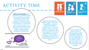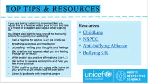 Article 12 which is our right to express feelings and opinions in matters affecting us and have your views listened too. Bullies may disagree with you and target you based on this. But equally, adults will listen and help should you use your voice and tell them. There is always a solution if you share your problems with a trusted adult. As duty bearers it is their job to keep you safe from harm.