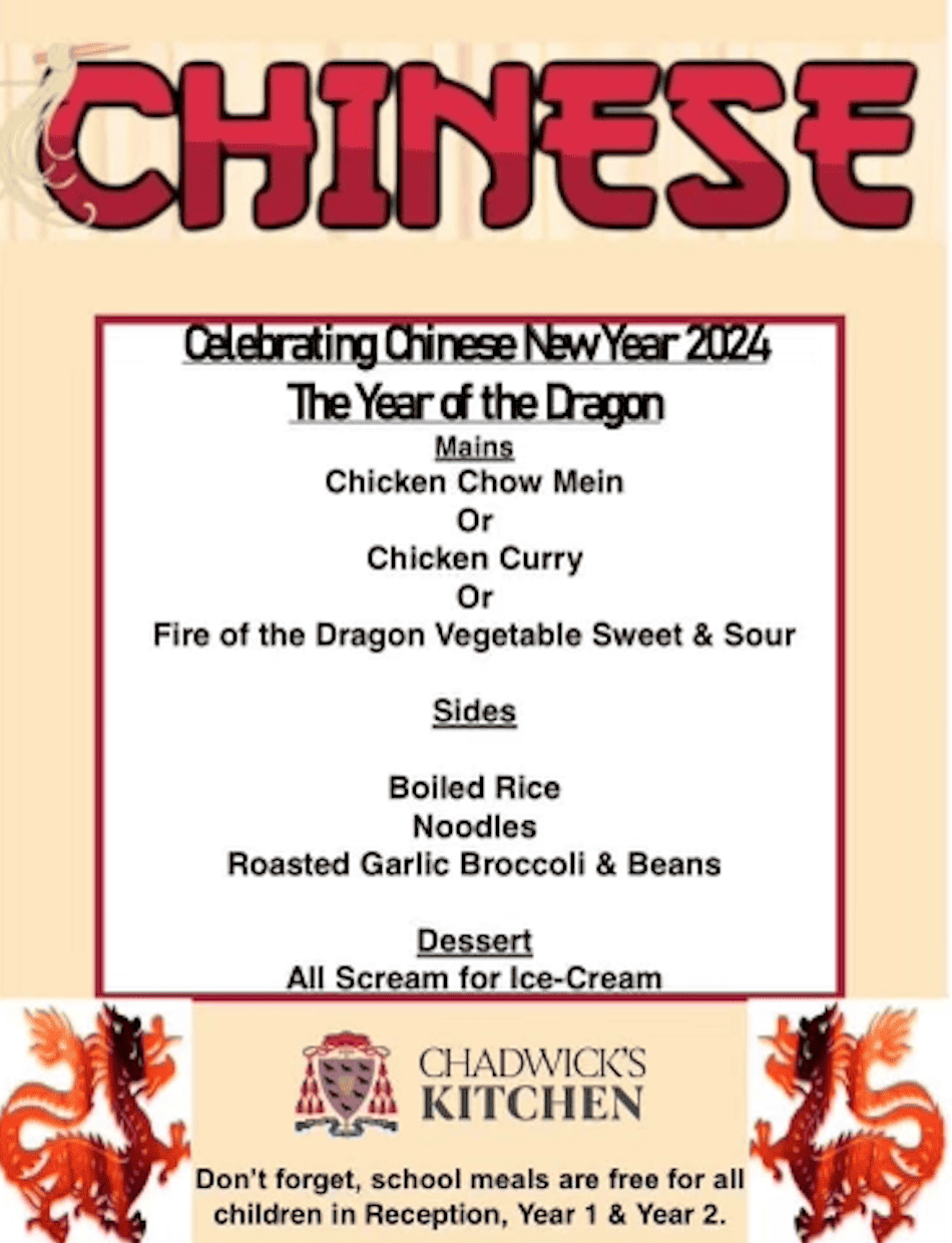Our lovely kitchen staff are offering a Chinese treat to celebrate Chinese New Year on Tuesday 6th February. Please see the picture below for menu choices.