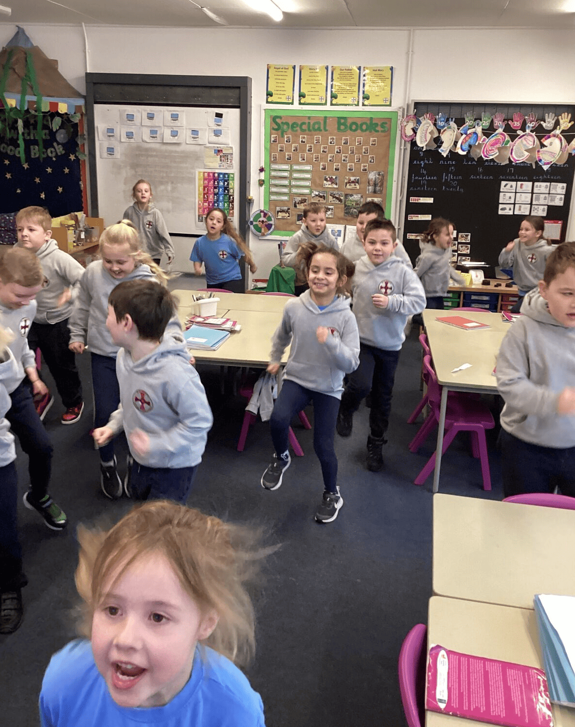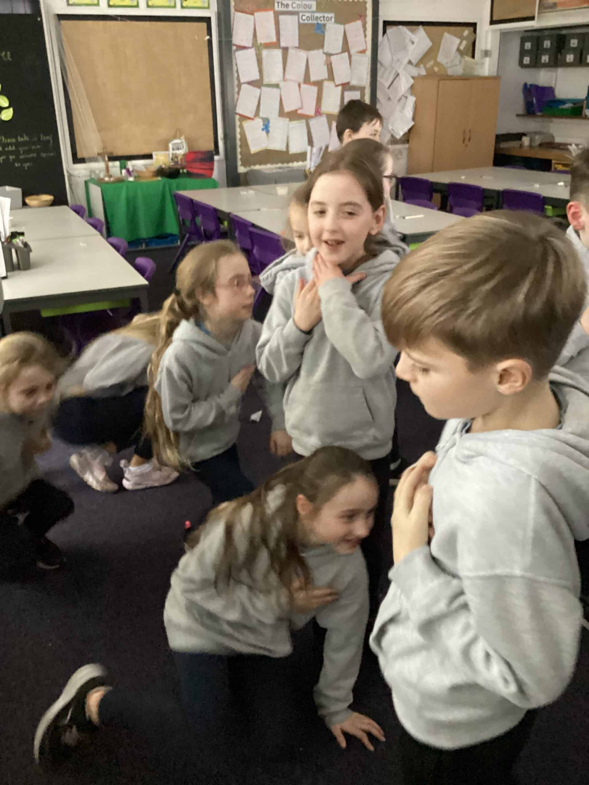 Today we were talking about the importance of being active for our physical health and our mental health. We felt our hearts beating before running around and then again after. We could feel our hearts beating much faster after. To help to restore our normal heart rate, we practised some deep breathing techniques.