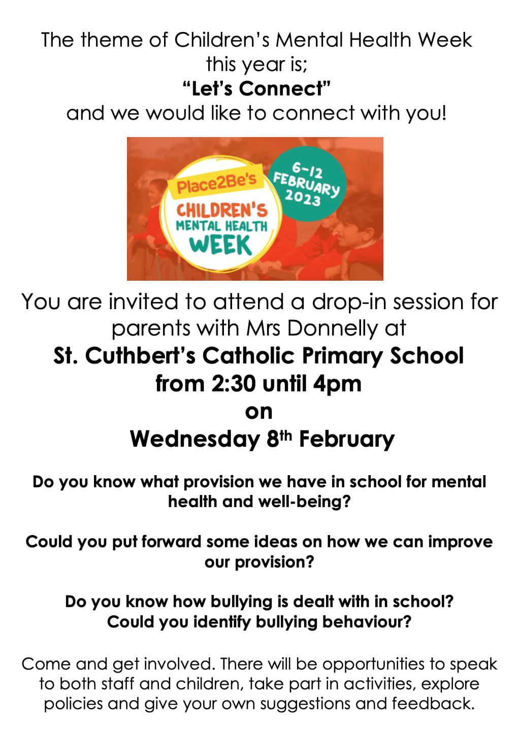 We are holding a drop in for parents to attend on Wednesday 8th February to help us to raise awareness during Children’s Mental Health Week. We would like as many parents as possible to attend.