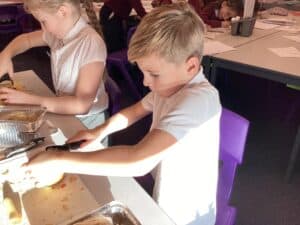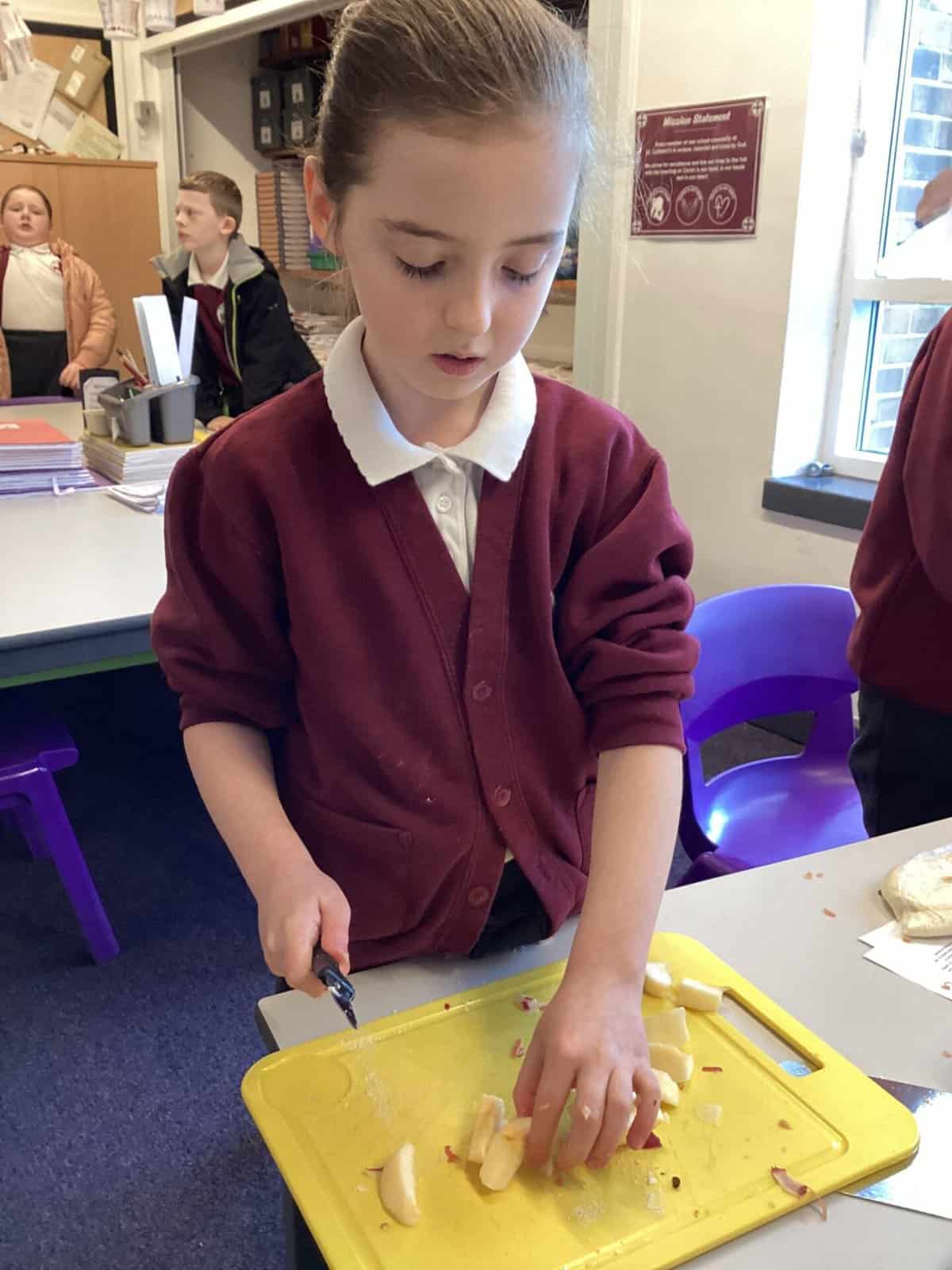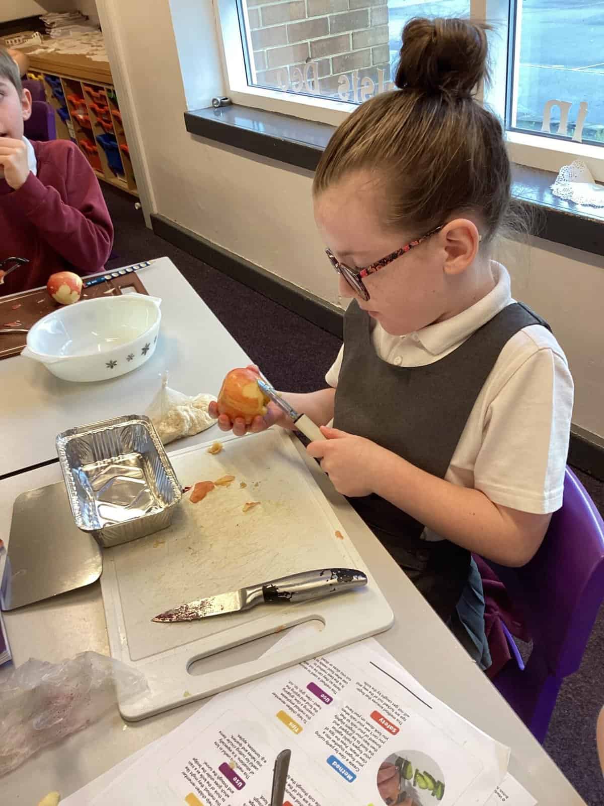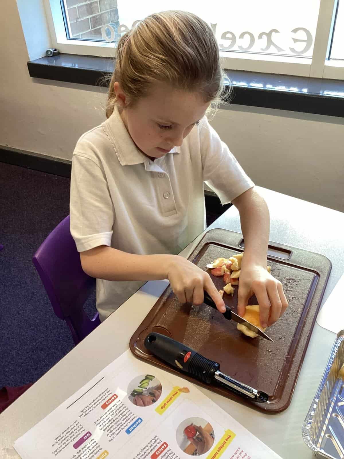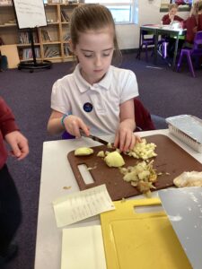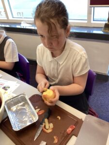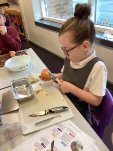 As part of our DT work we were set the task of making a fruit crumble. We started by tasting different seasonal fruits and spices. After deciding what flavour we wanted our crumble to be we set about making it. We learnt new skills like how to rub in butter and flour to make our crumble topping We also discovered how to chop and peel fruit safely. The best part was taking our crumble home to share with our families!