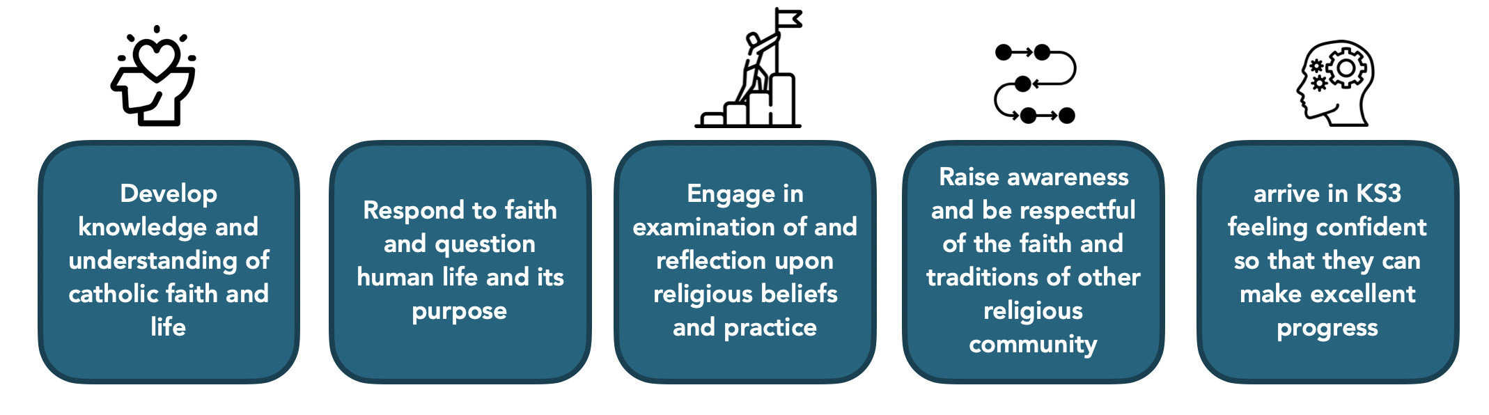 We want our pupils to explore the Catholic faith and teachings. In line with Gospel Values, pupils will make good moral and ethical choices based on the teaching from scripture and understand how these teachings link to religious worship, catholic life and understand how this has an impact on Christian beliefs and actions. We want pupils to understand the importance of the liturgical year and the seven sacraments. This will enable them to discern their vocation to be active citizens in service to the world.