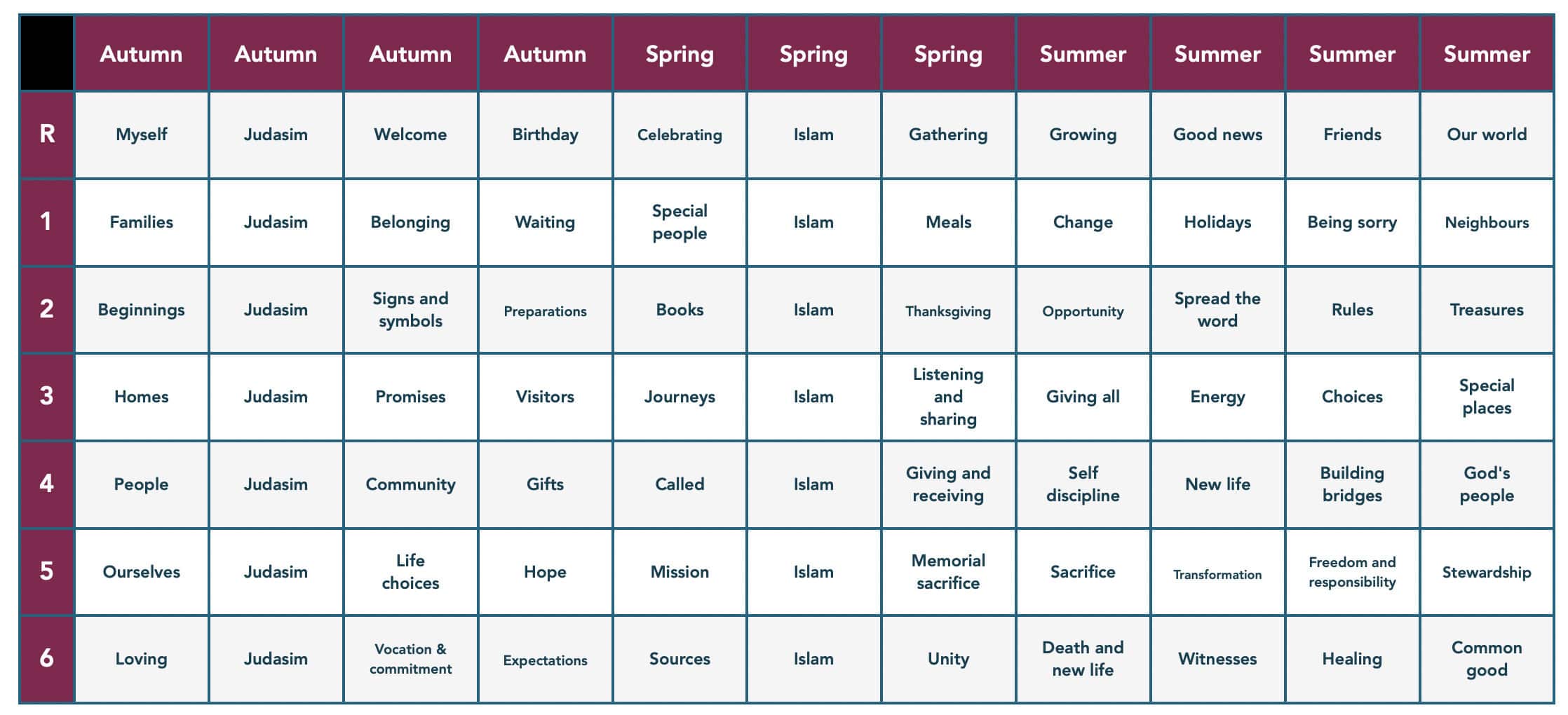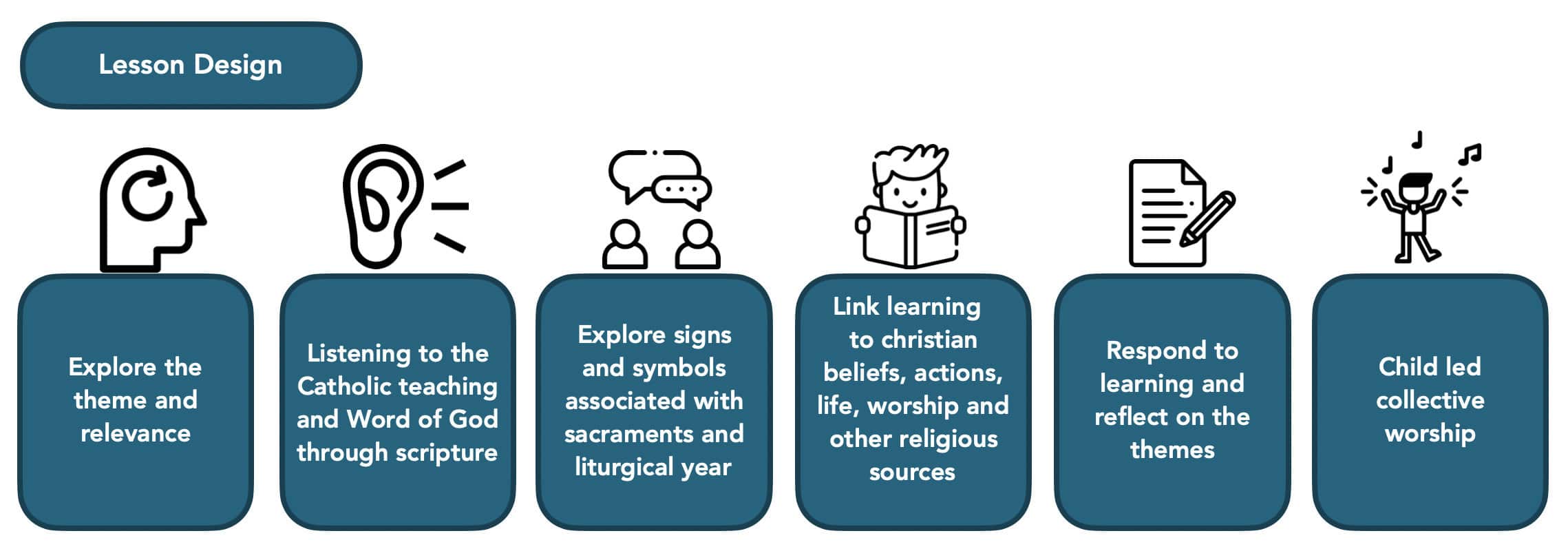 A variety of teaching and learning strategies will be used and adapted appropriately to meet the needs and learning styles of pupils to allow them to access the full curriculum. The Come and See programme used for the teaching of religious education addresses four main areas of study which is outlined in the curriculum directory provided by Hexham and Newcastle Dioceses. These are: Revelation, Church, Celebration and life in Christ. Two other faiths – Judaism and Islam – are taught from EYFS to Y6. 10% of our curriculum time is allocated to the teaching of RE. The sequence of topics in RE follow the Come and See programme with the exception of Year 4 who move topics to coincide with their sacramental preparation. Time is given to children in lesson to reflect on themes and learning. Each topic contains an explore unit which introduces the theme, a reveal units which explores the Word of God, key questioning and Christian teachings and a respond unit which allows for reflection of themes and teaching covered. The respond unit also allows children to plan a collective worship based on the Word of God covered and the key themes.