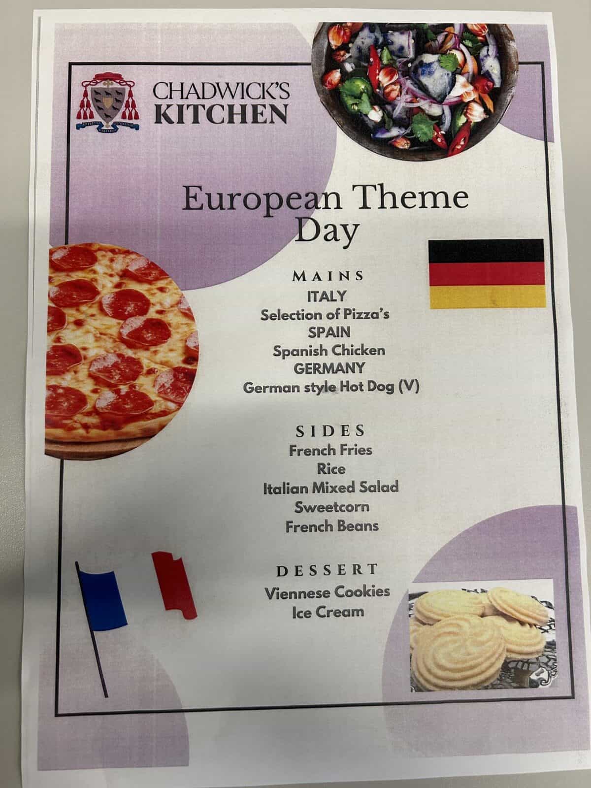 Our kitchen staff are providing a special dinner for children on Thursday 26th September. It is European Day of Languages and we have some dishes inspired by European cuisine. See the picture below for menu choices.