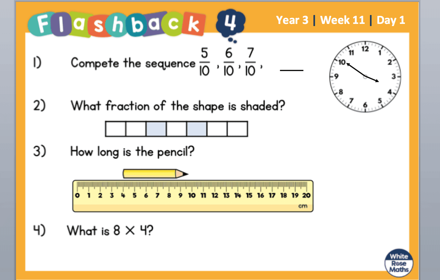 You also have a flashback 4 and for a further challenge I have added challenge 4 from last weeks White Rose home learning. You can access White Rose home learning by visiting whiterosemaths.com/homelearning/year-3/