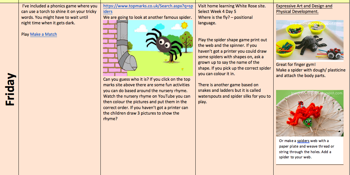 The end of another week lets hope you have enjoyed finding out about spiders !! Today we are having some fun looking at another famous spider. I wonder if you can guess who it is by looking at the picture ? I’ve also included some fun activities to do on line based on the nursery rhyme. There are some maths games to play to help you with your numbers and some craft ideas based on spiders. Let’s hope you have fun and then have a good rest at the weekend. I hope the sun shines. xxx
