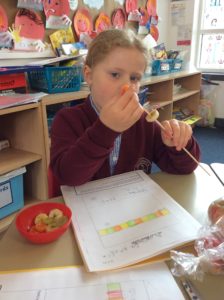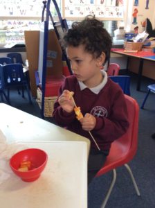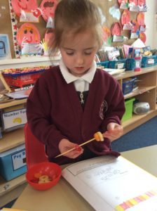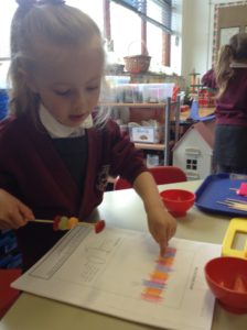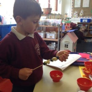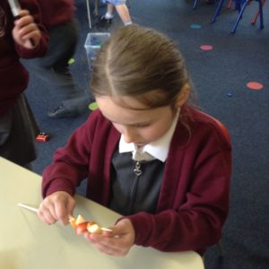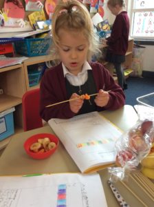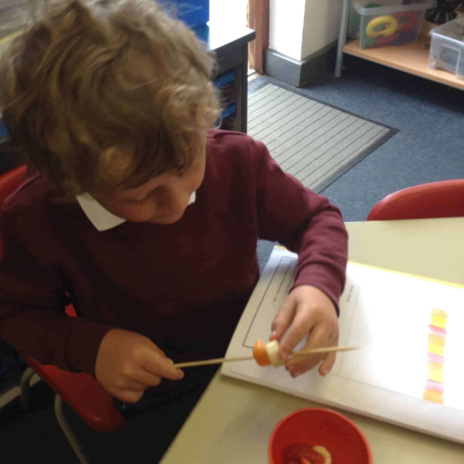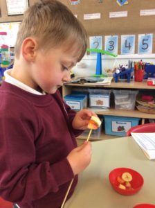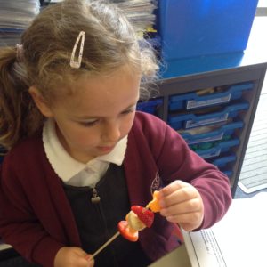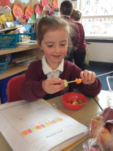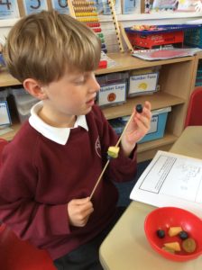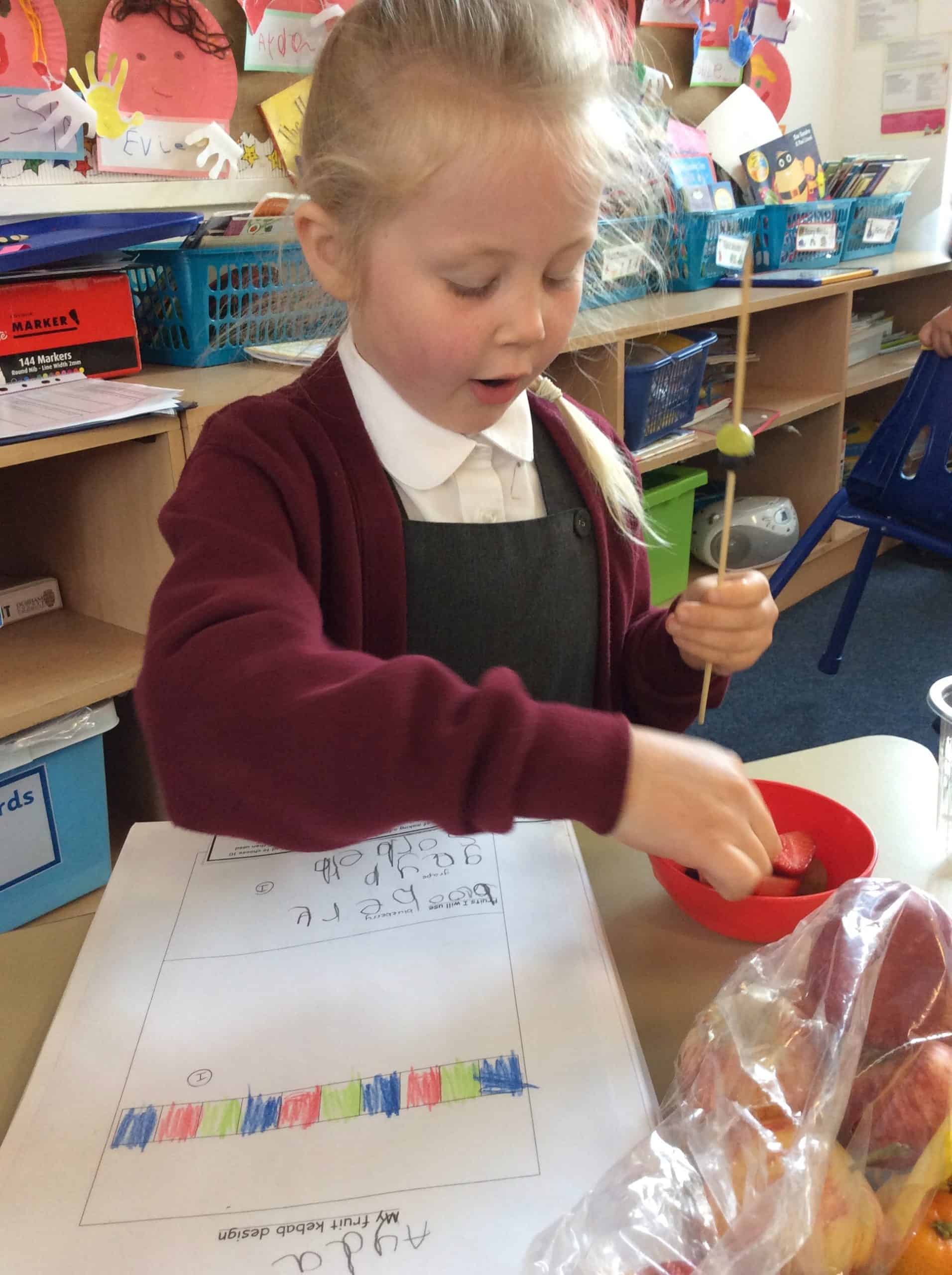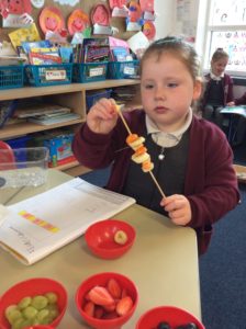 This week we read the book about Oliver’s Fruit Salad which was all about a little boy who thought he didn’t like fruit. Our challenge was to design our own fruit kebab. We could choose up to three fruits and the fruits had to be arranged in a repeated pattern. Once we created our design we had to follow the design to make our own kebabs. We found out that we also liked fruits just like the little boy Oliver.
