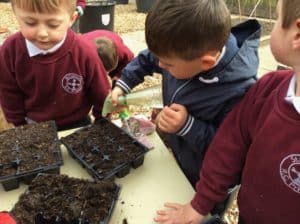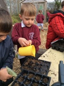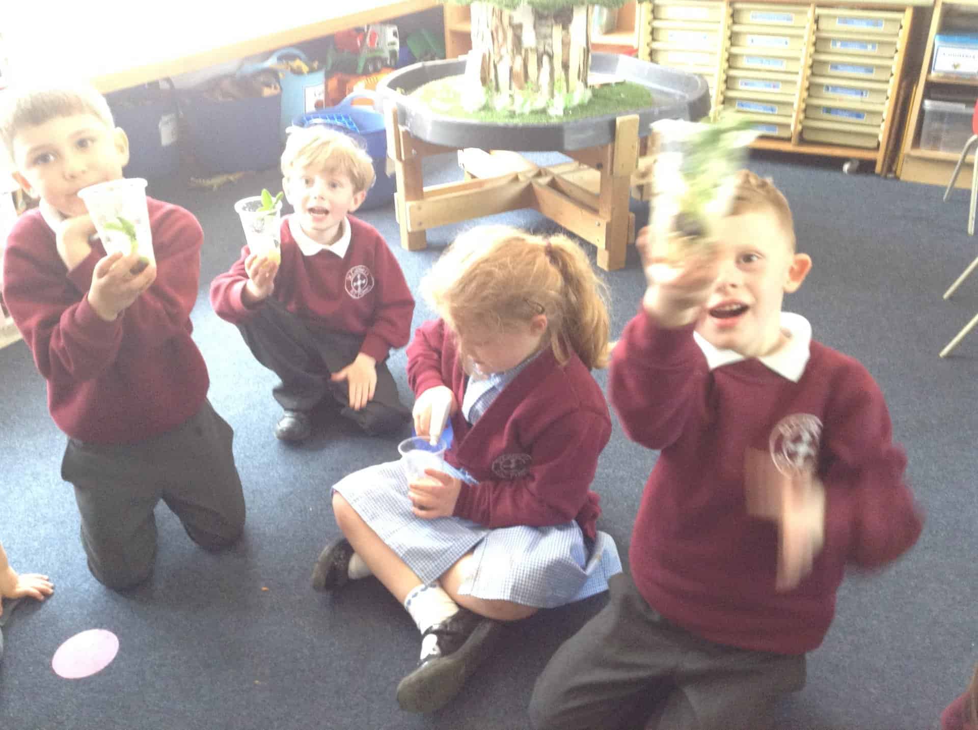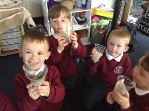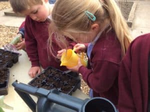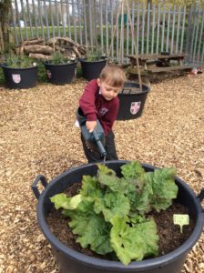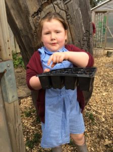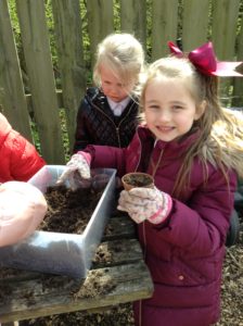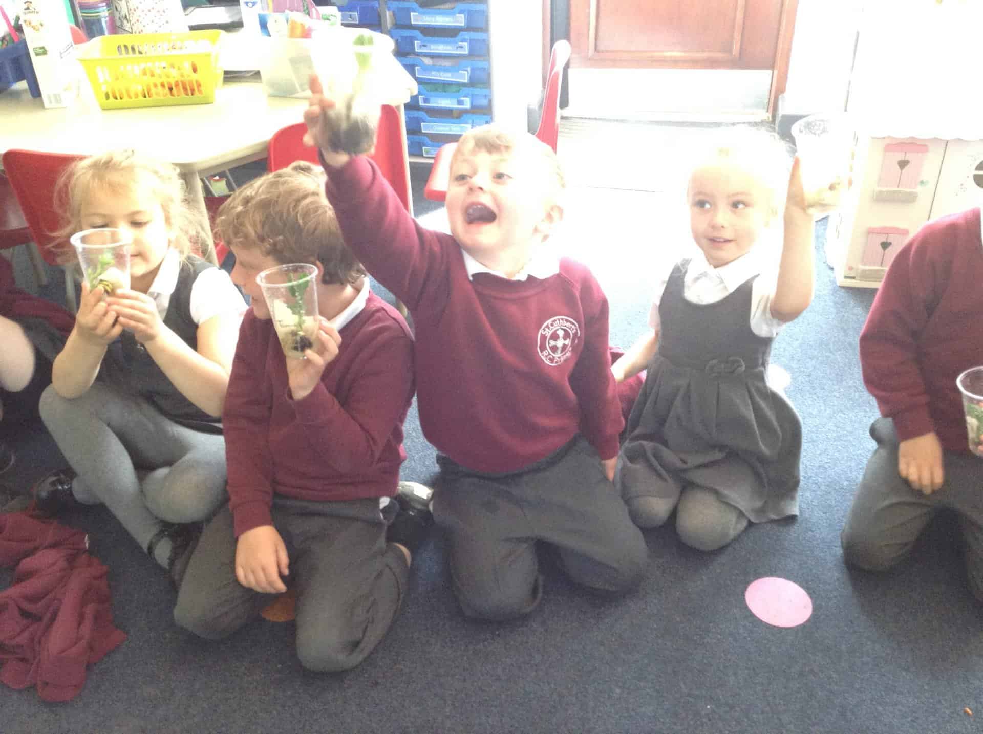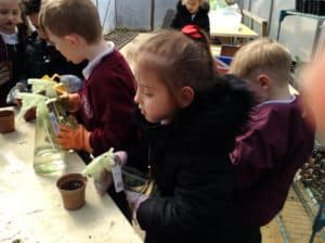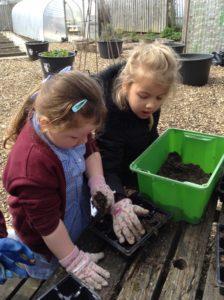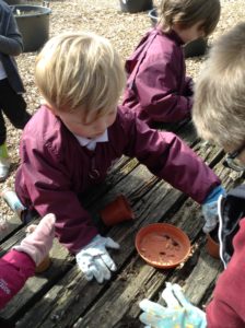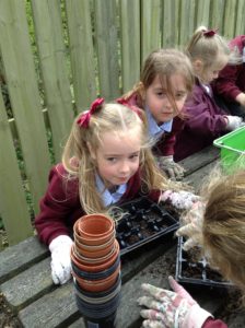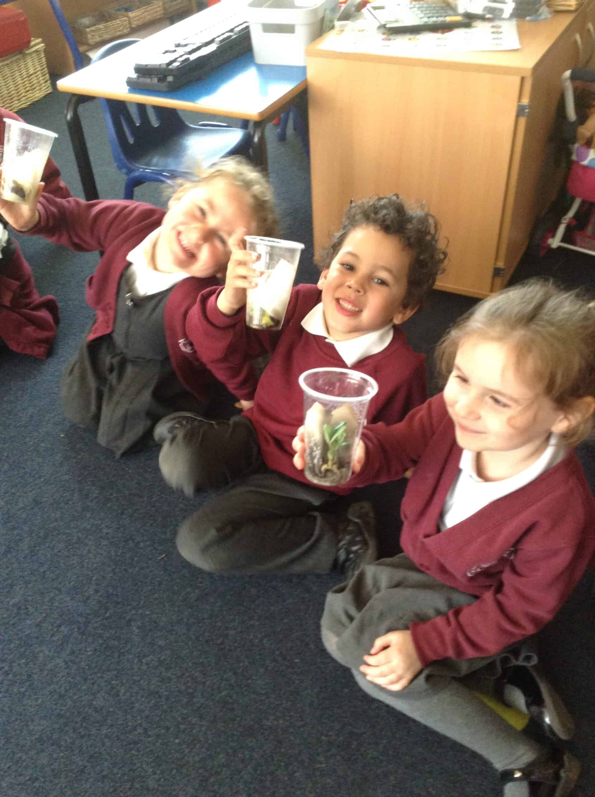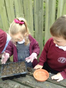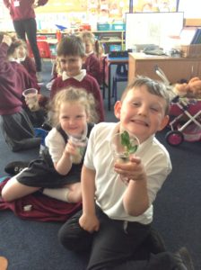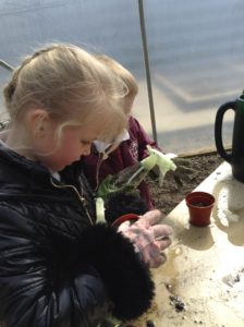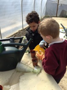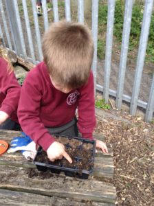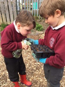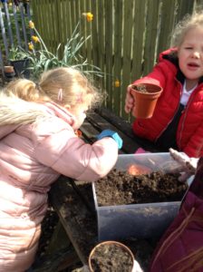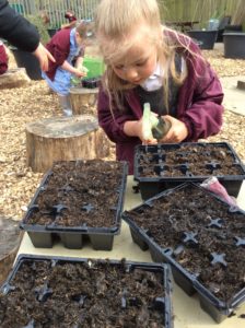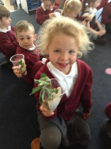 A few weeks ago we listened to the story of, ” Oliver and his Vegetables ” and, “Jack and the Beanstalk”. We decided to try and grow some of our own vegetables and our own bean stalks to see if they would grow as tall as Jack’s beanstalk. Over the last few weeks we have been watering the seeds and watching the plants grow. The roots grew first then the shoots and they grew leaves and grew taller.This week some of our beans had grown tall enough to plant in our vegetable beds in the allotment.