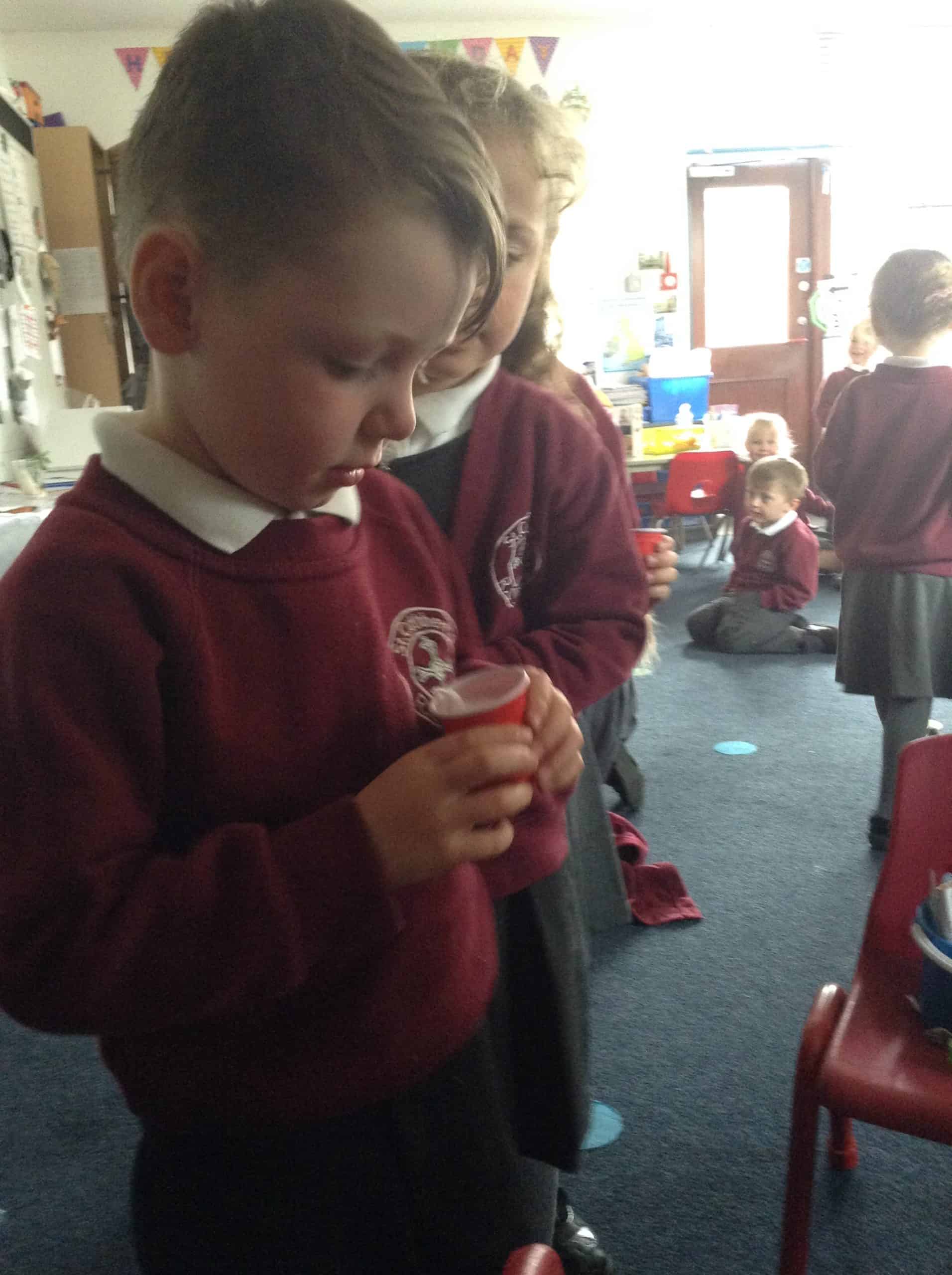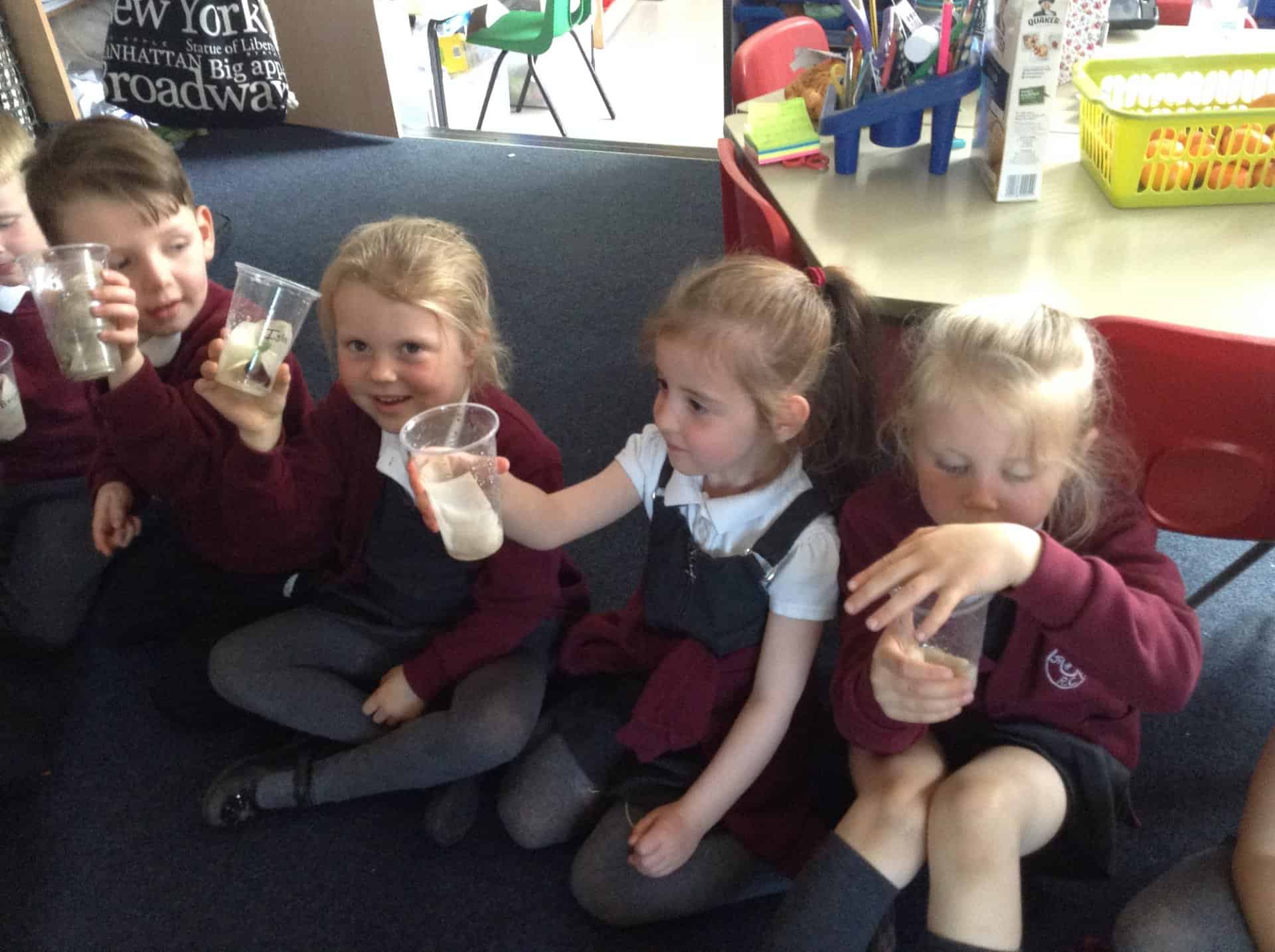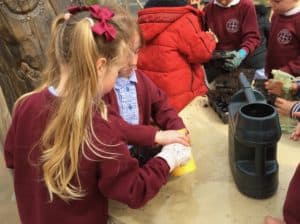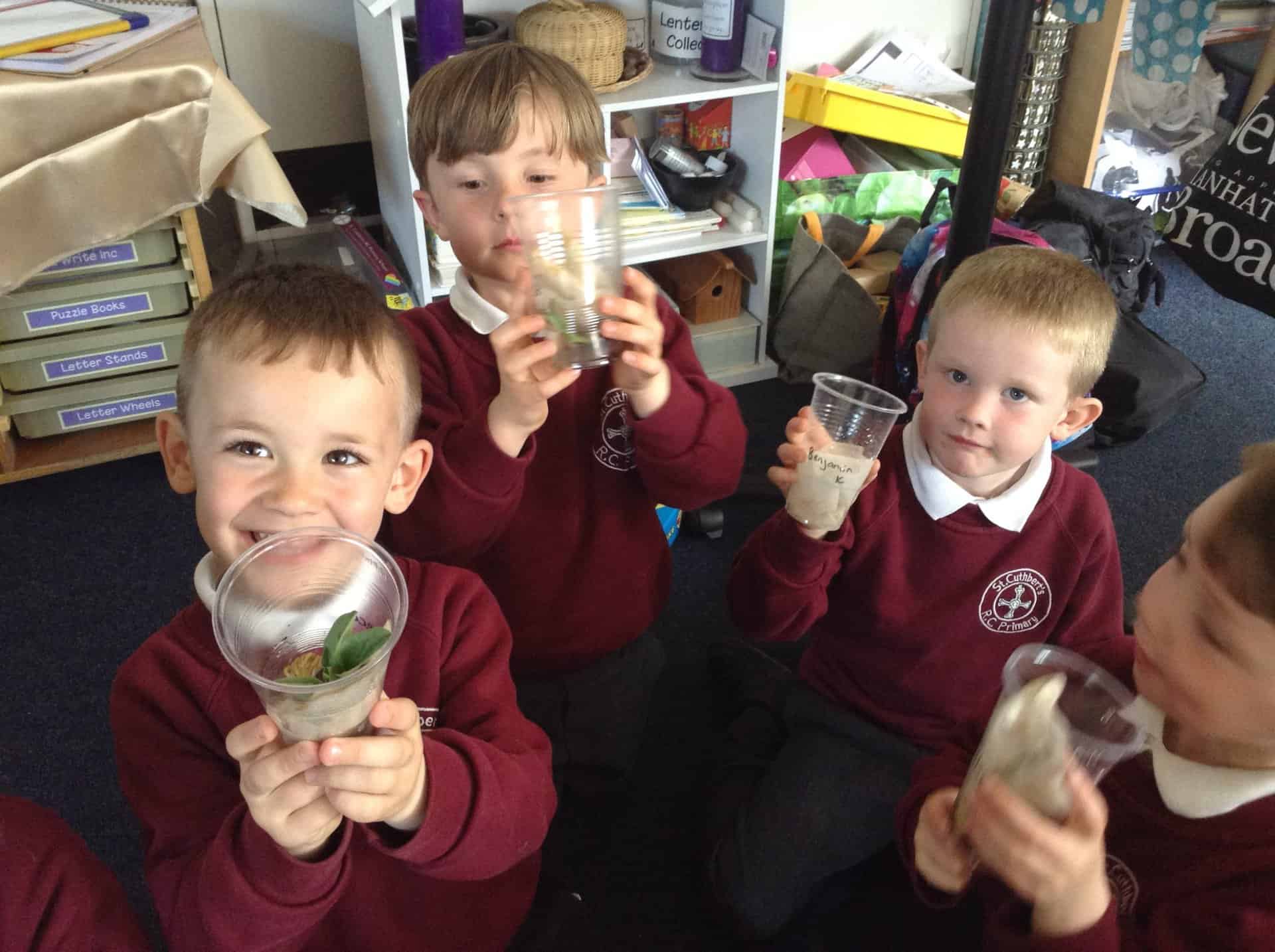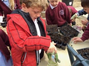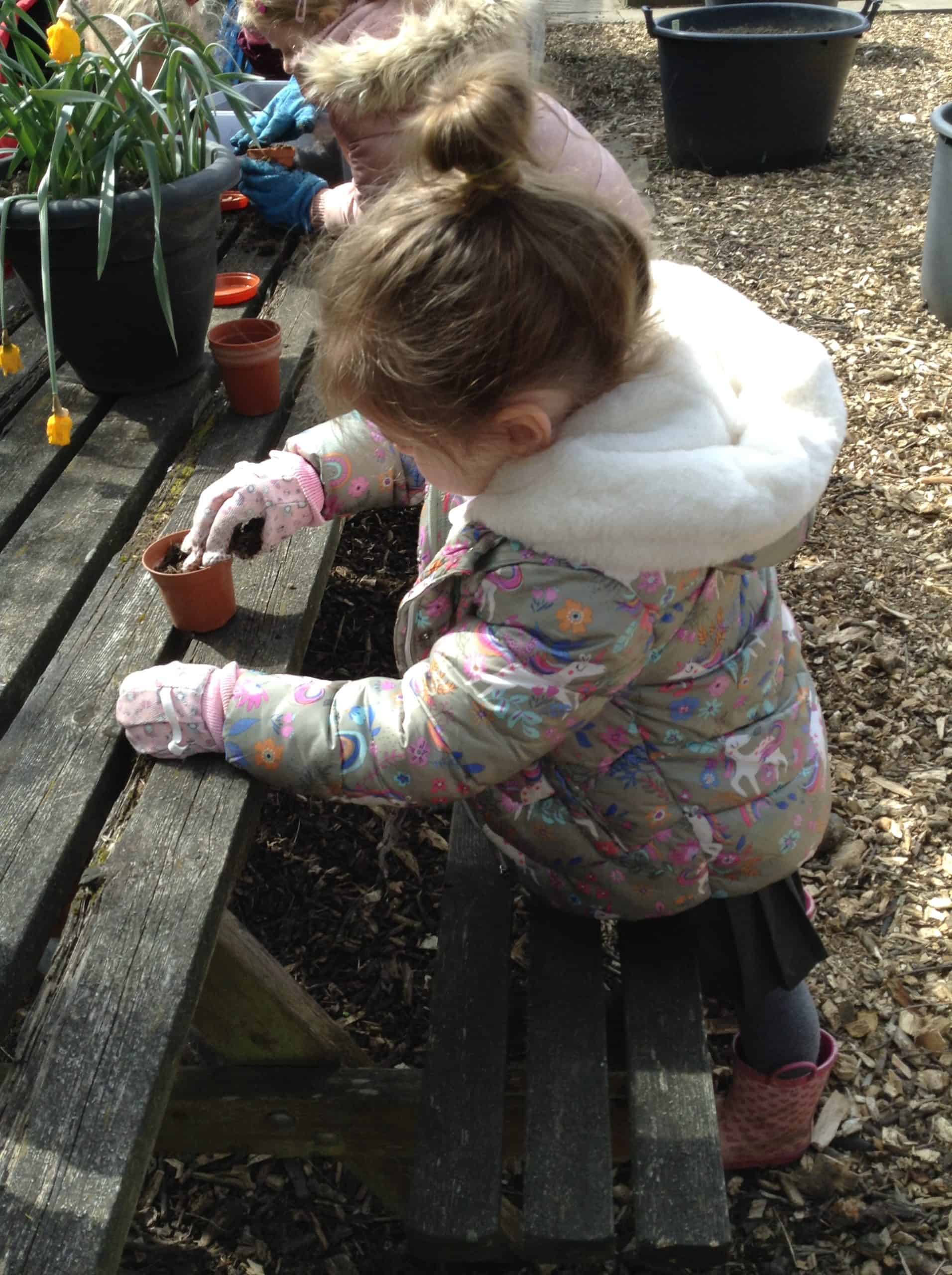 A few weeks ago we listened to the story of, ” Oliver and his Vegetables ” and, “Jack and the Beanstalk”. We decided to try and grow some of our own vegetables and our own bean stalks to see if they would grow as tall as Jack’s beanstalk. Over the last few weeks we have been watering the seeds and watching the plants grow. The roots grew first then the shoots and they grew leaves and grew taller.This week some of our beans had grown tall enough to plant in our vegetable beds in the allotment.