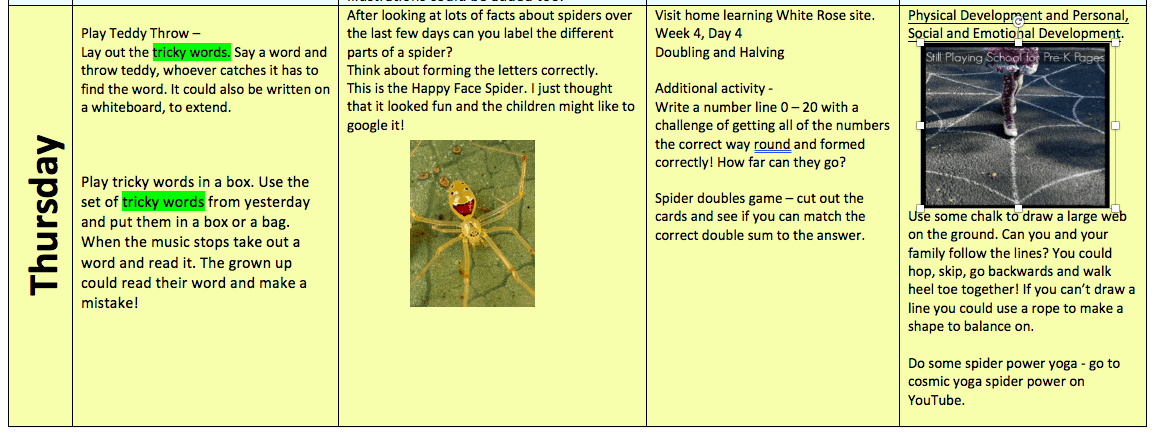 In your Whiterose maths work we are looking at doubling and halving. I’ve also included some double work sheets. I’ve also included some physical challenges linked to spiders I wonder if you can move like a spider?