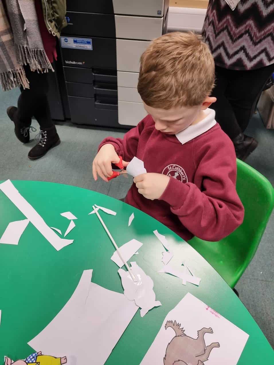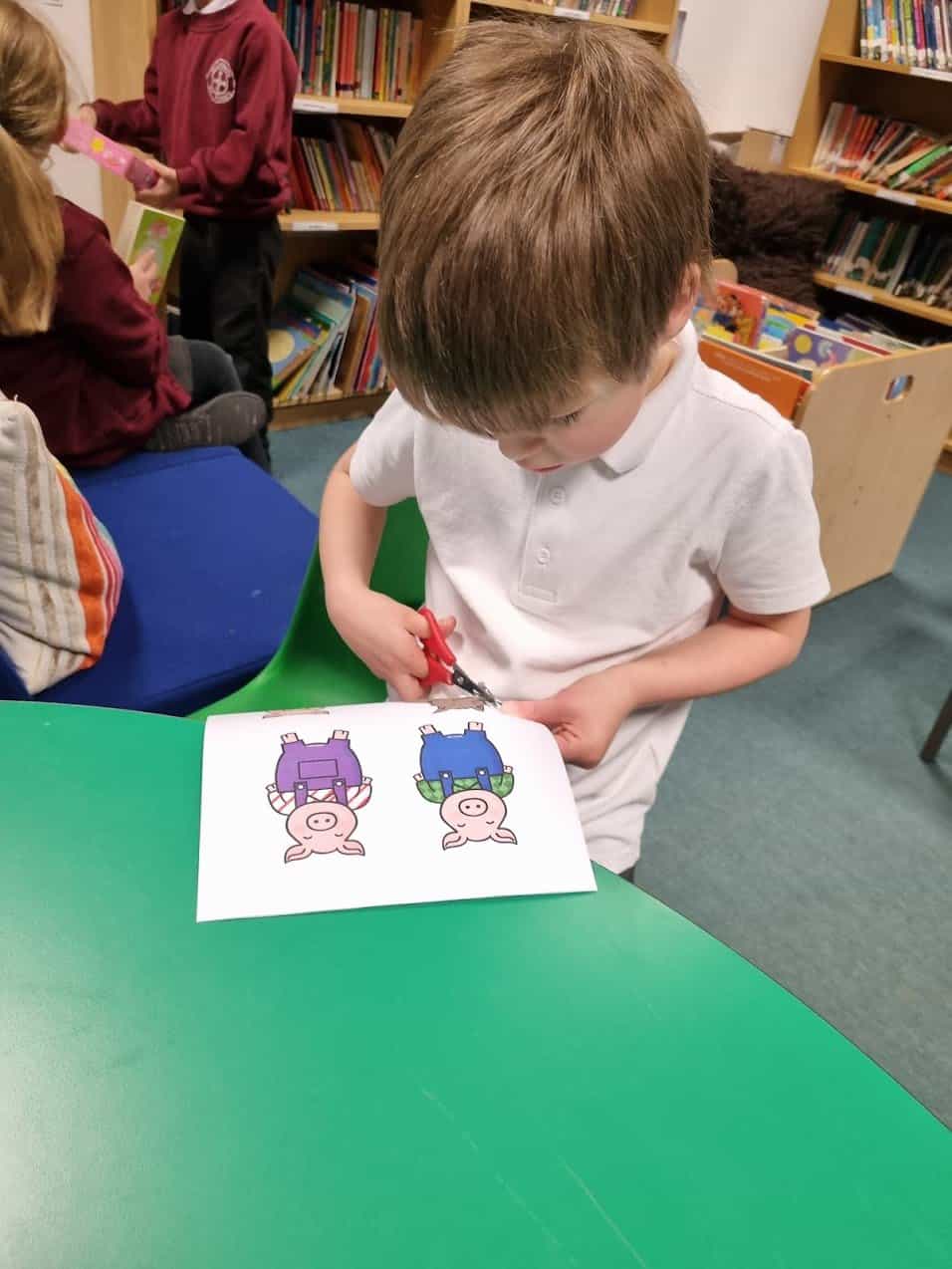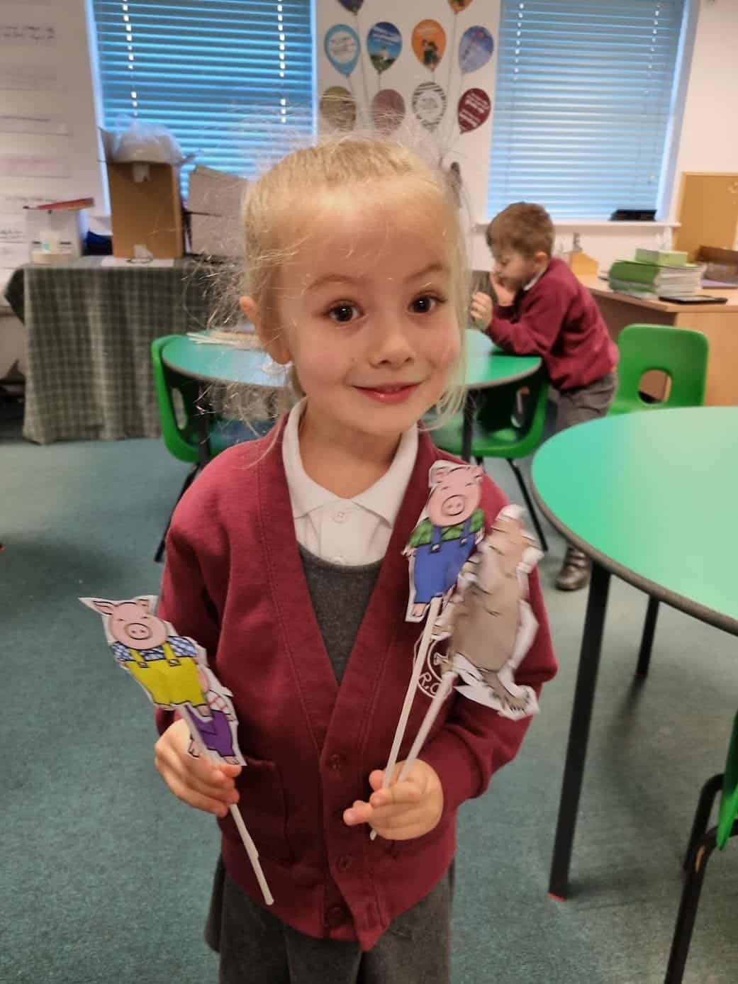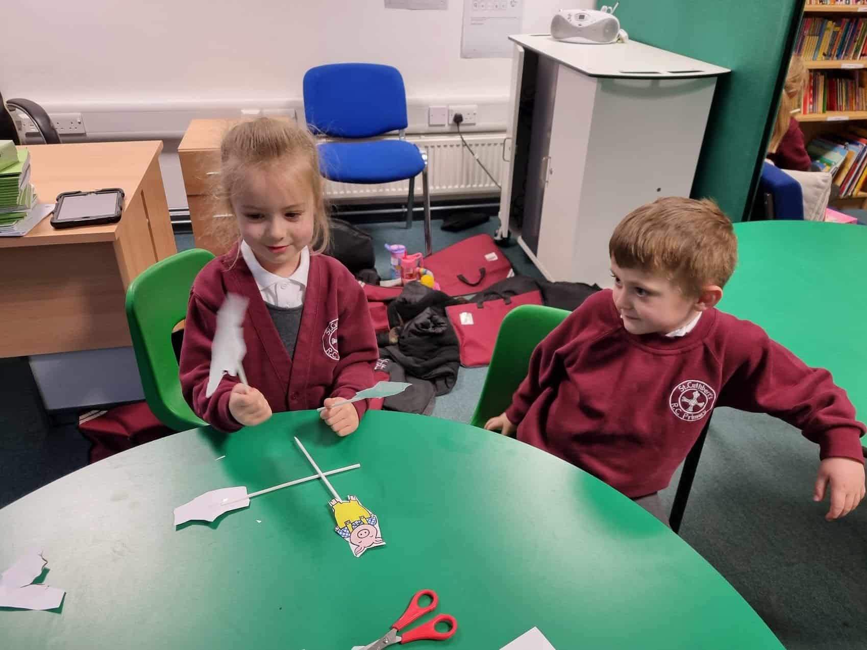 We had a lovely time in this week’s little library club. Mrs Wilkinson read us the story of ‘The True Story of the Three Little Pigs.’ We really enjoyed it and we couldn’t believe that the wolf wasn’t in fact big and bad but simply had a sneezy cold! Mrs Donnelly then  helped us with our stick puppets and we told each other the true story.  W also enjoyed sharing some books from the library.