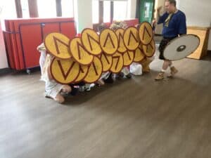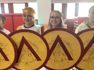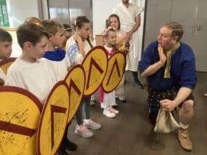 The Battle Formations and Tactics session was the highlight of the day, where the children got their very own spear and shield to use. We learnt about the famous formations and battle tactics that the Greeks used to conquer lands far and wide, such as the phalanx formation.