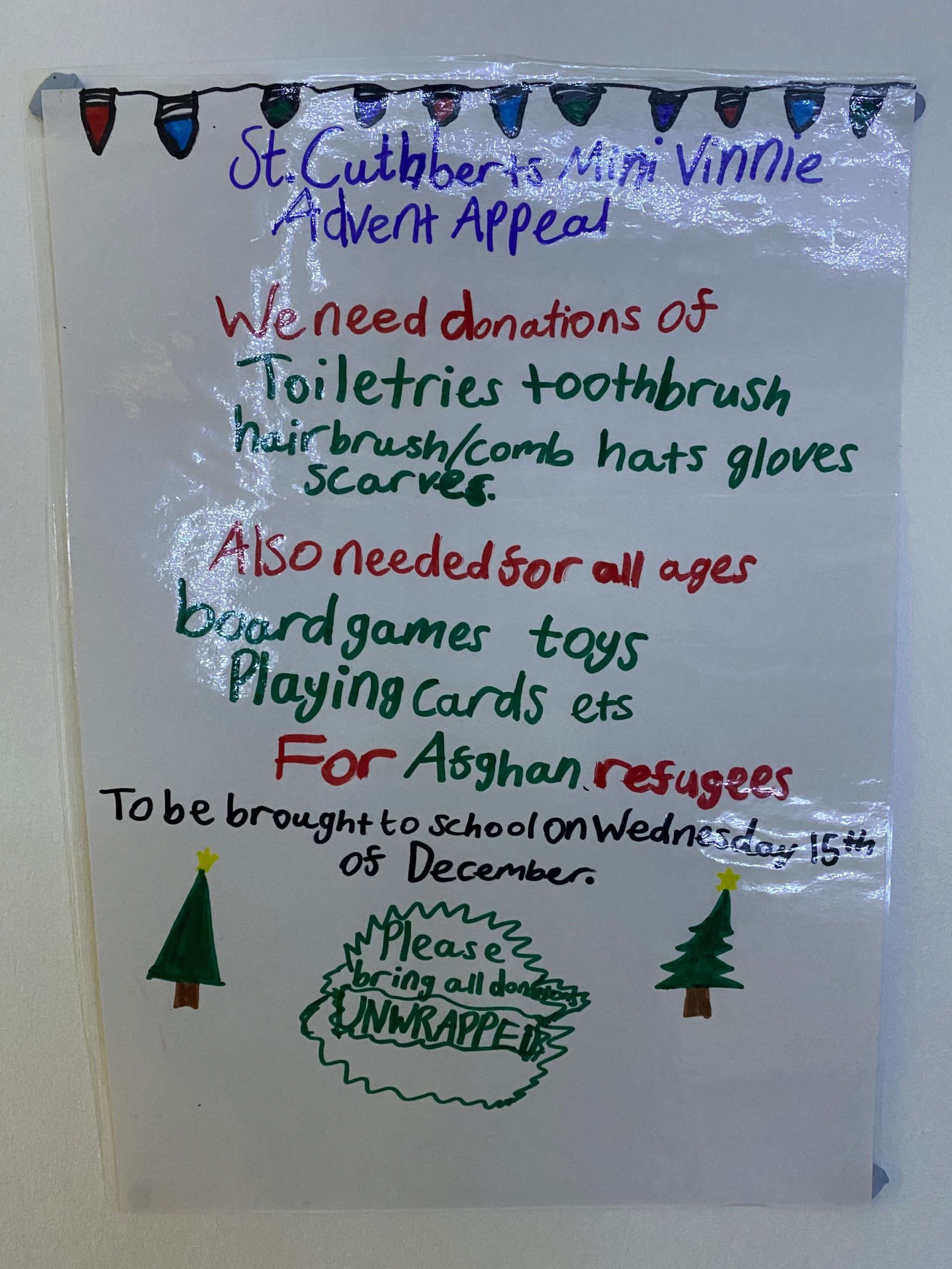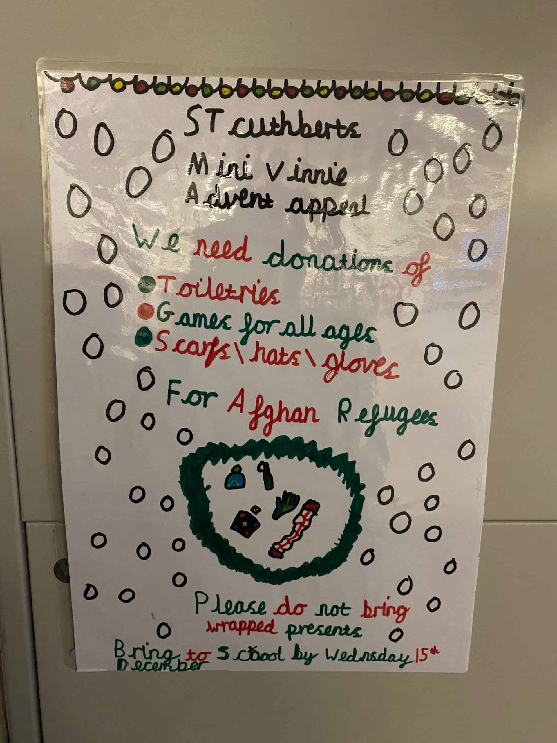 As you may have seen recently, many refugees have been uprooted and relocated from Afghanistan to the North East of England. The SVP society at St Cuthbert’s House are collecting donations for these families.