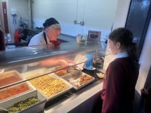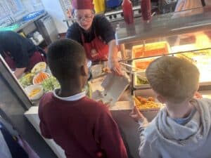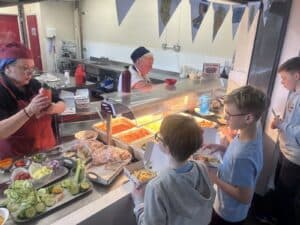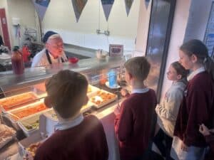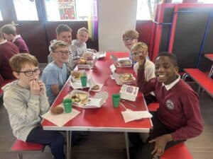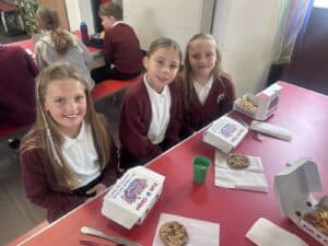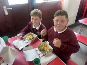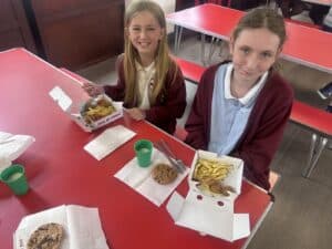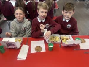 On Friday, to celebrate National Fish & Chip Day, year 5 swapped their plates for cardboard boxes and enjoyed a traditional fish and chip lunch. They had a choice of fish or fish bites, accompanied by chips and either beans, peas or hoops and fished with curry, tomato sauce or tartare sauce. Lunch time was topped off with a wonderfully tasty chocolate chip cookie.