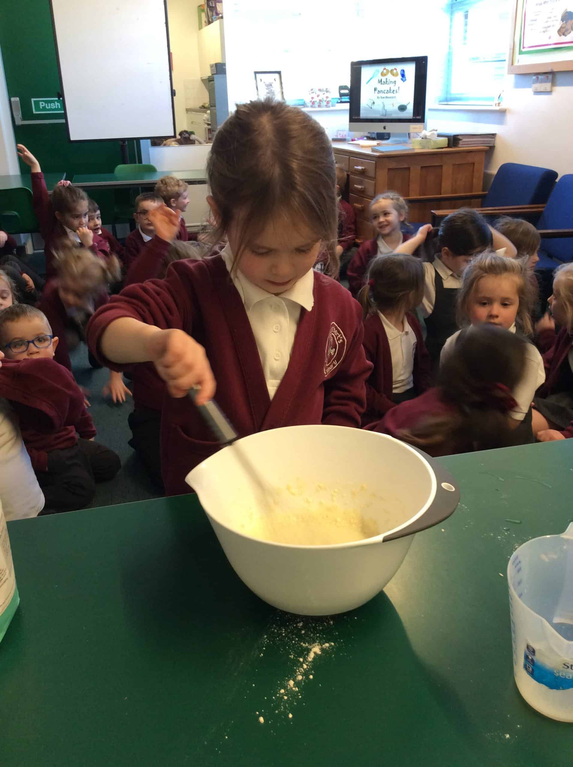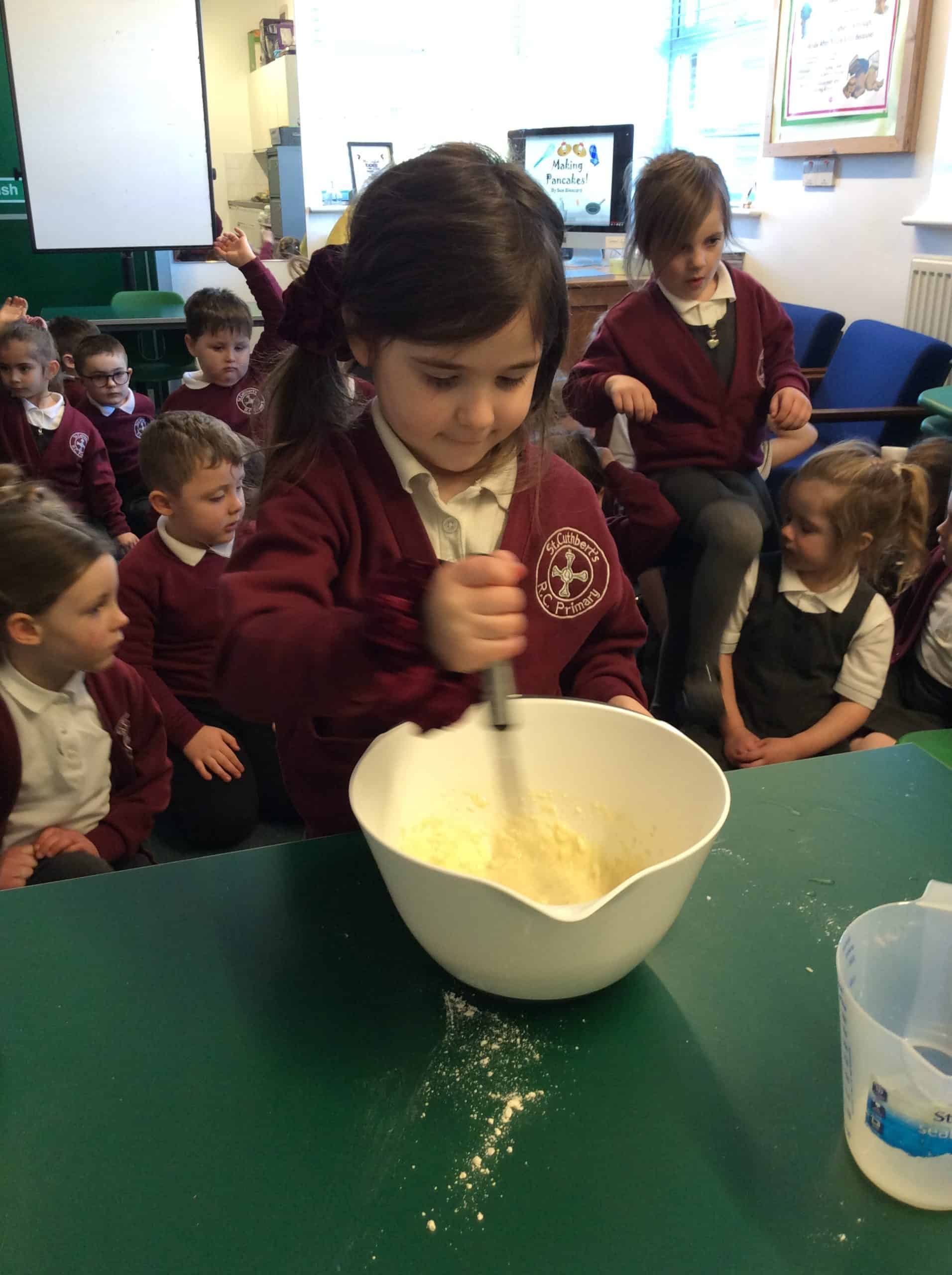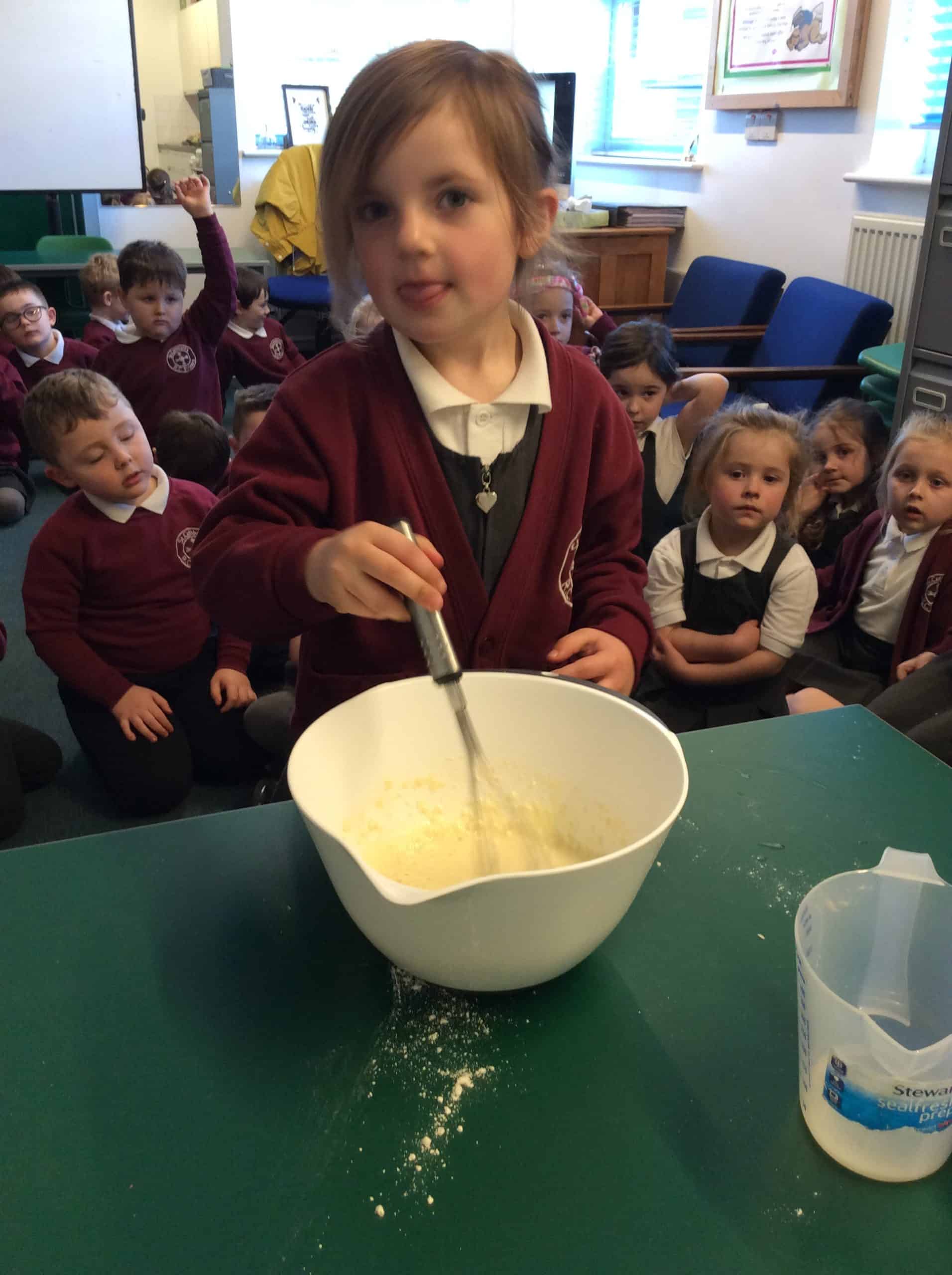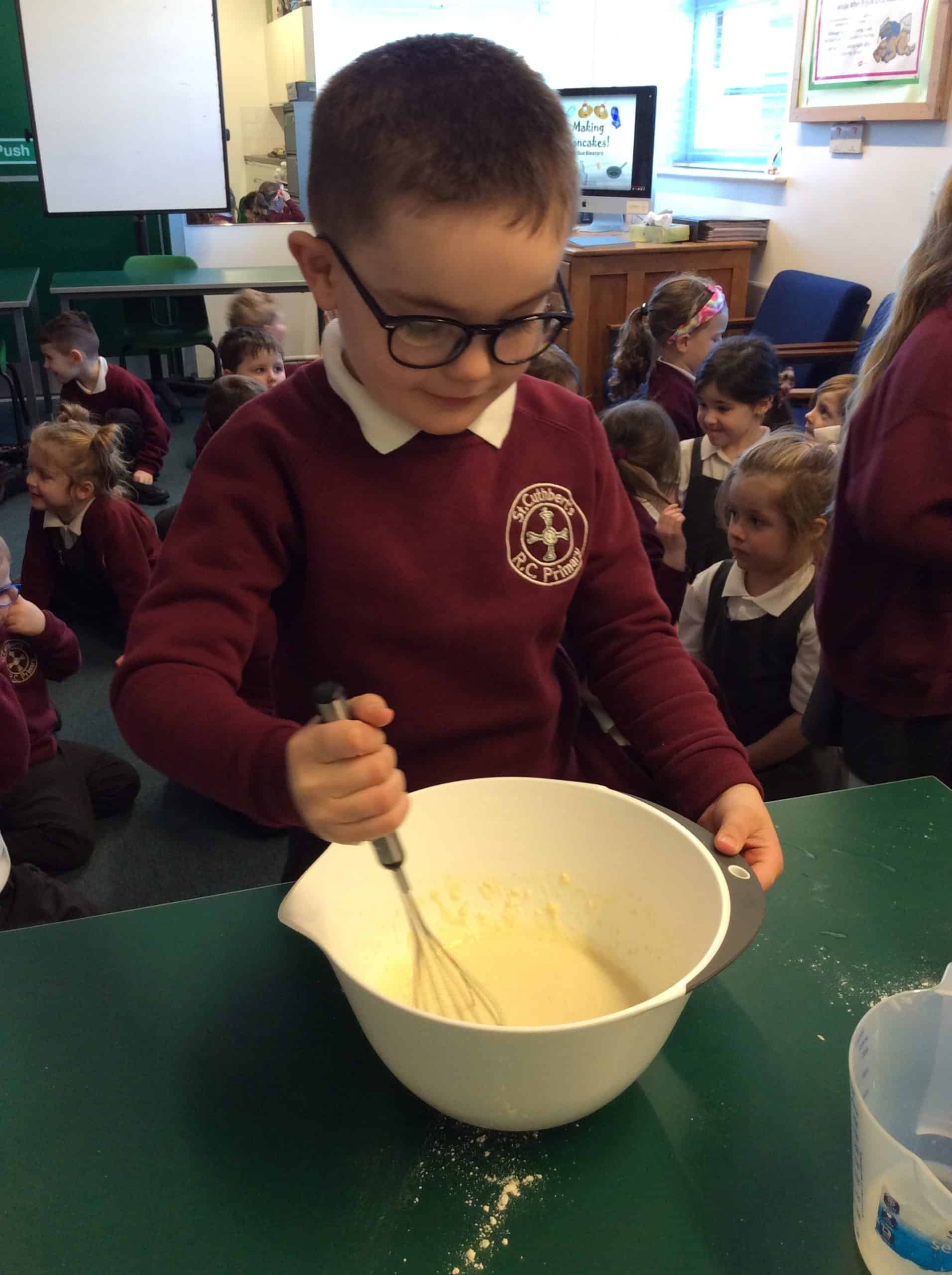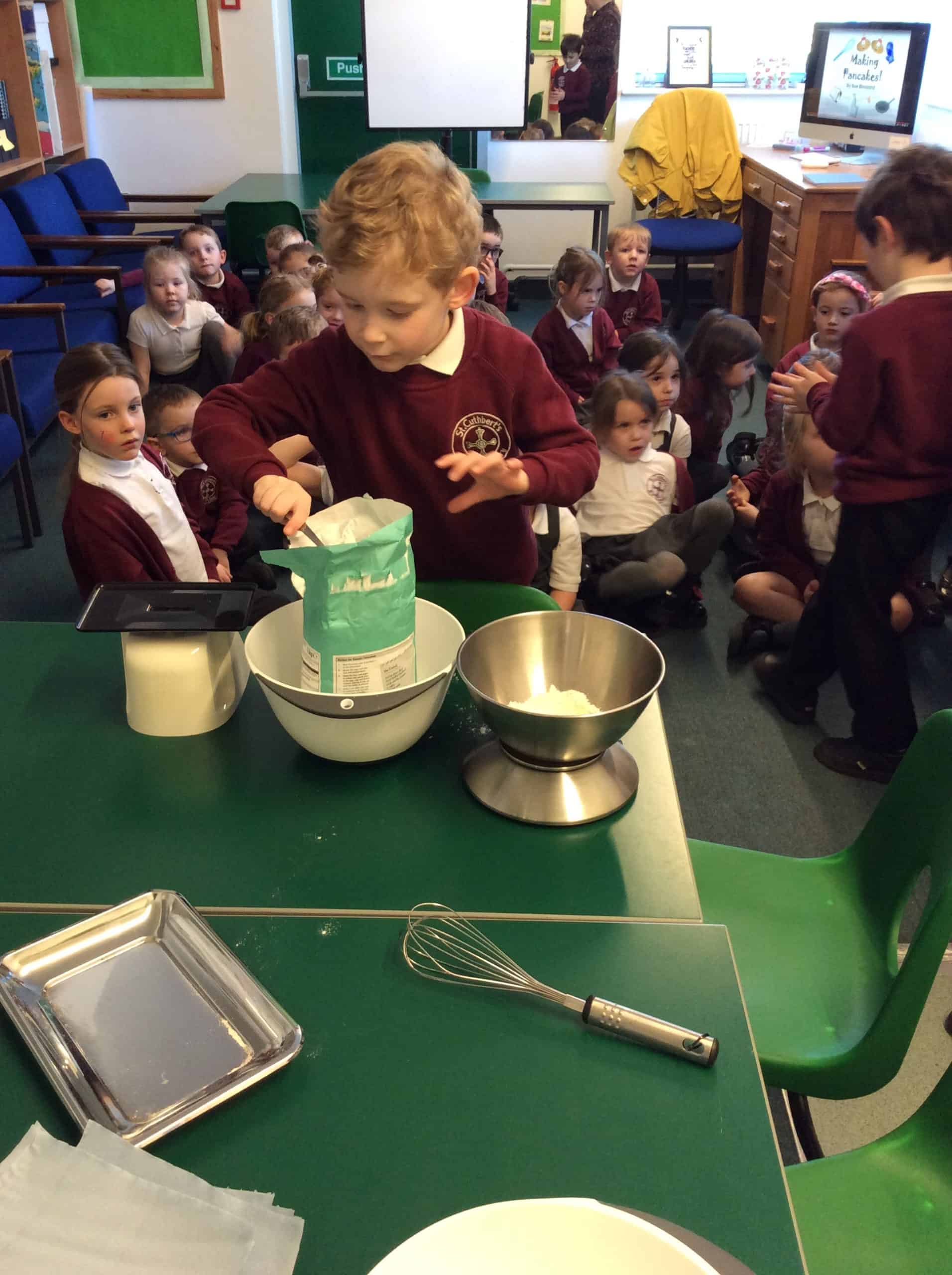 It was Pancake Day today and we decided to make our own pancakes in school. We listened to a song to help us remember the ingredients we needed and what we had to do. We each helped to add the ingredients and mix them together. The best part was when we were given some pancakes to eat.