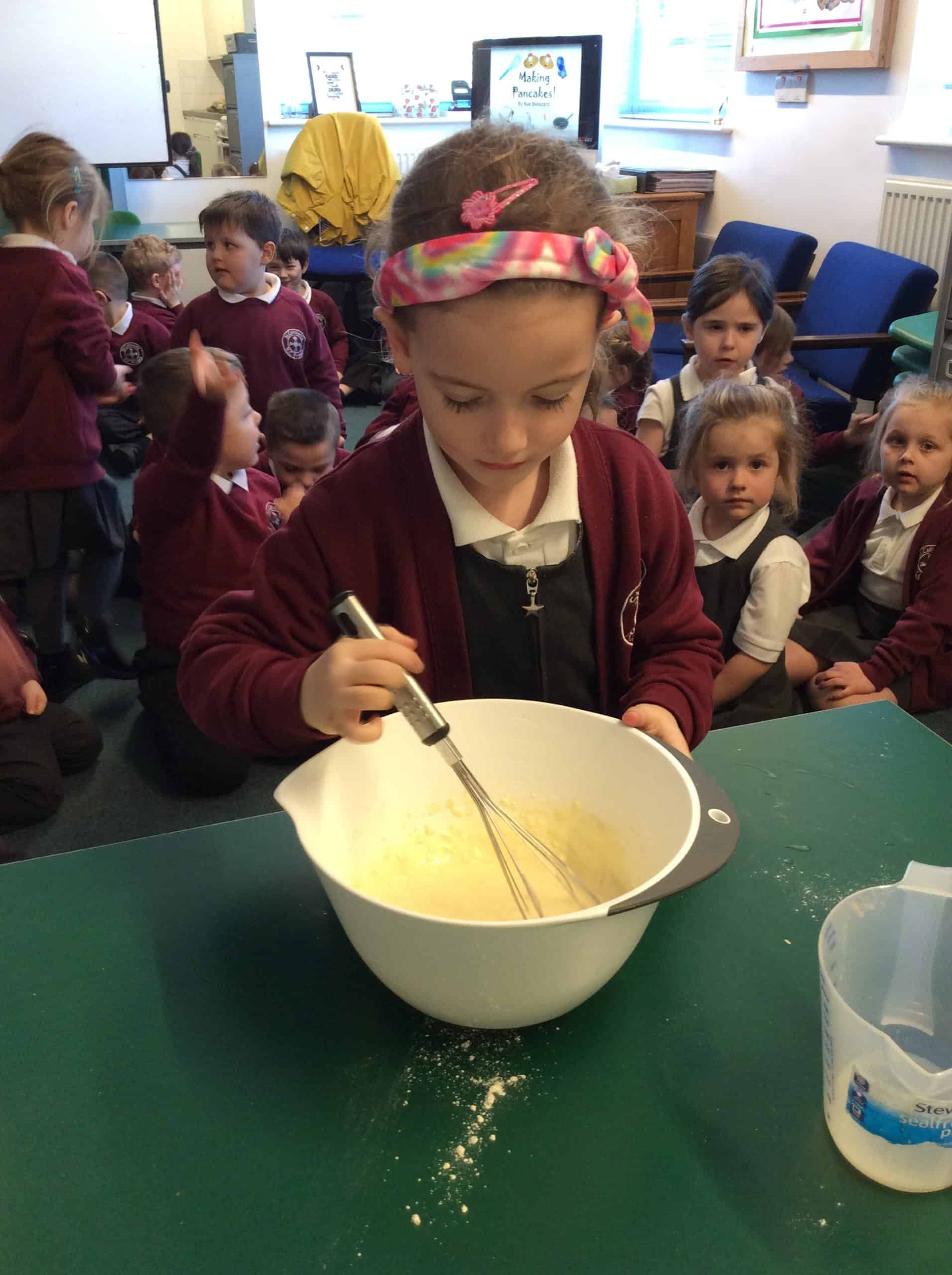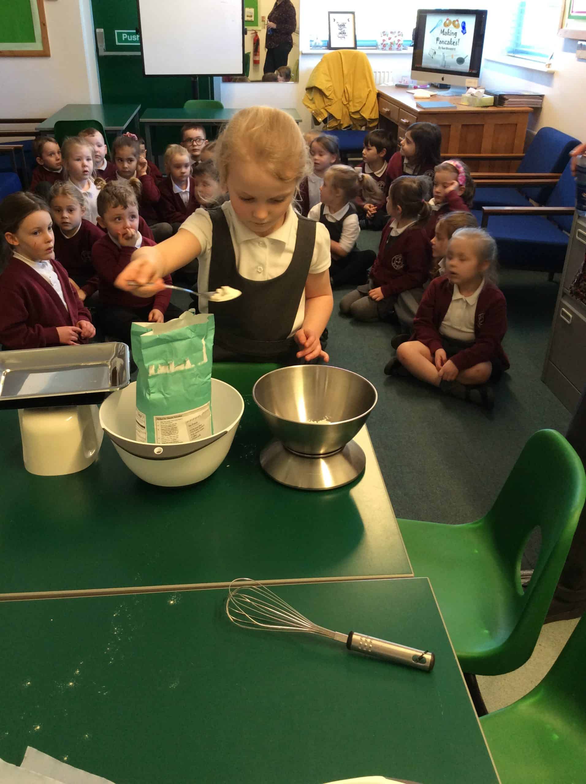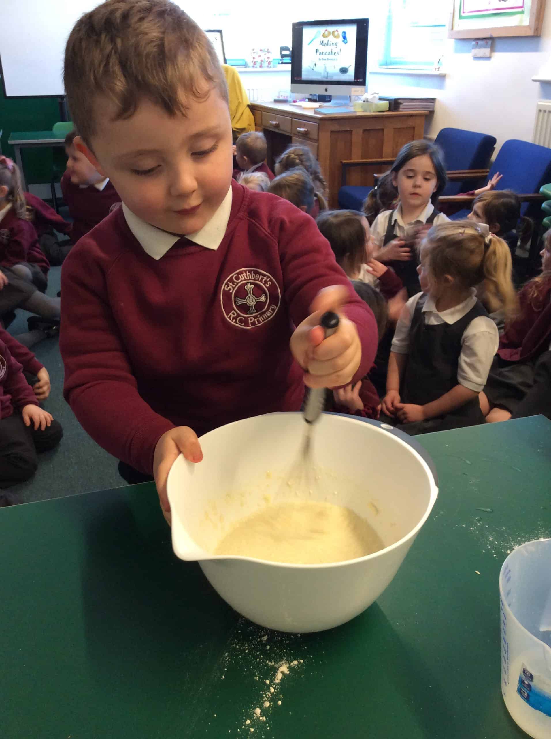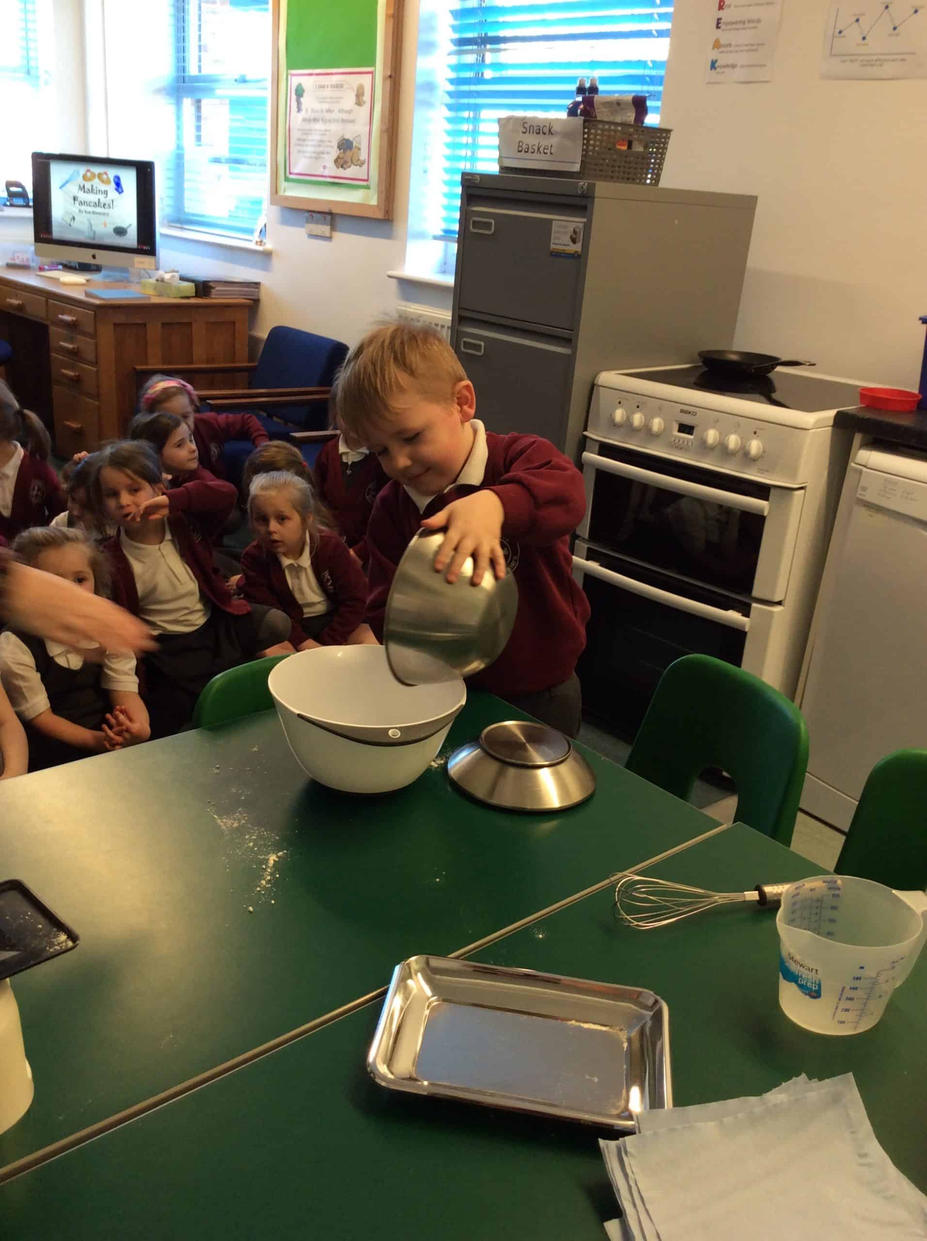 It was Pancake Day today and we decided to make our own pancakes in school. We listened to a song to help us remember the ingredients we needed and what we had to do. We each helped to add the ingredients and mix them together. The best part was when we were given some pancakes to eat.