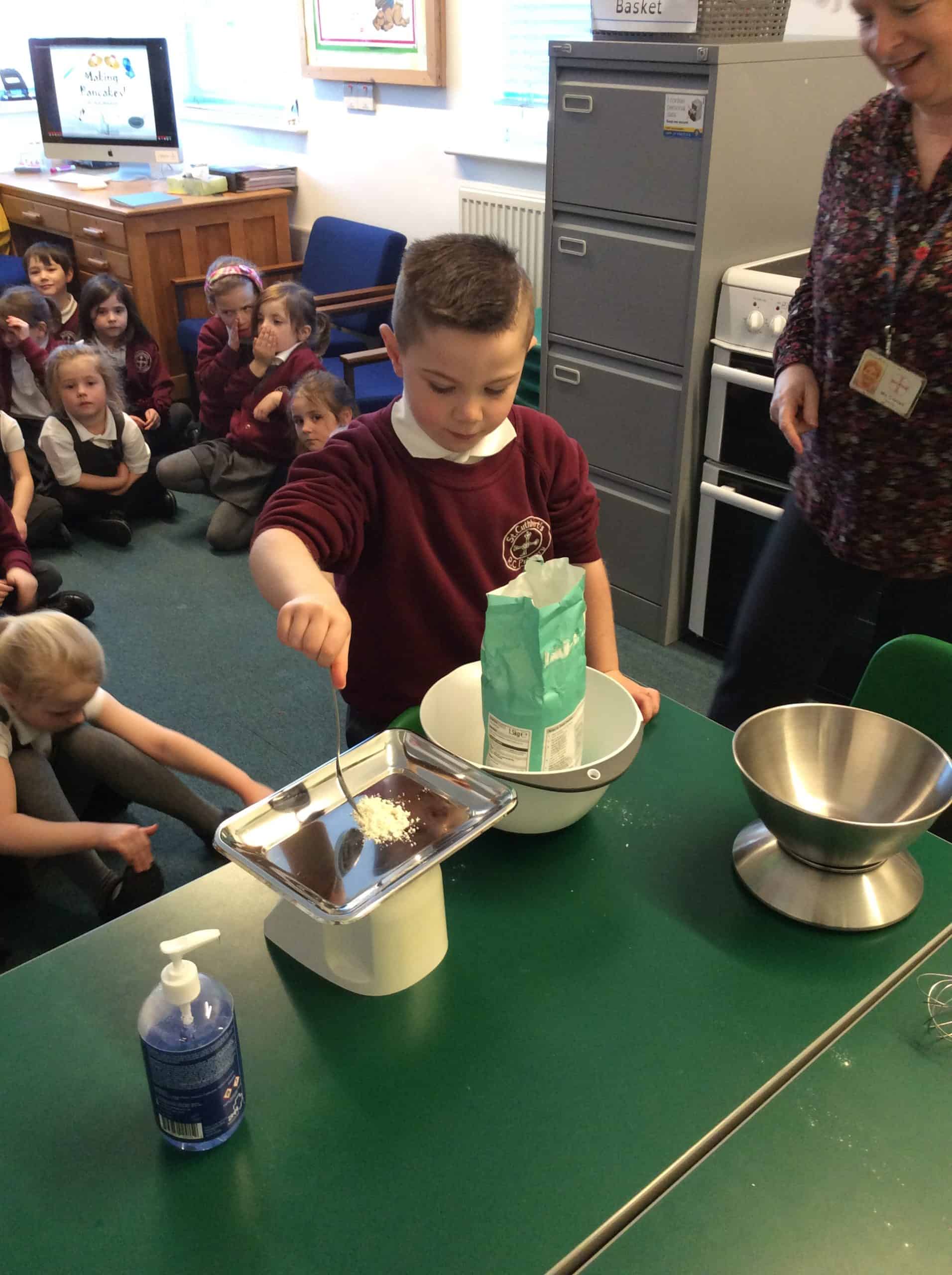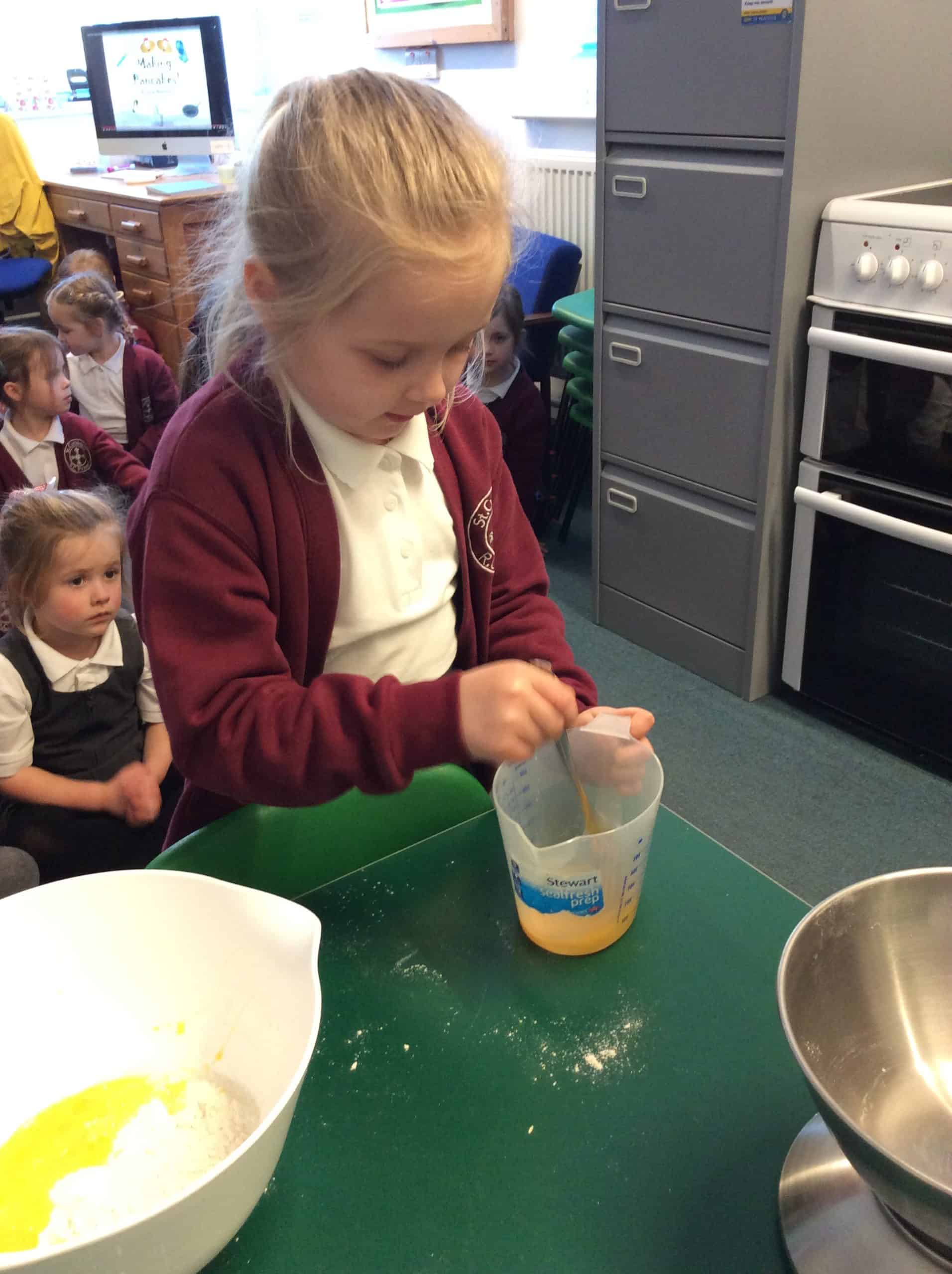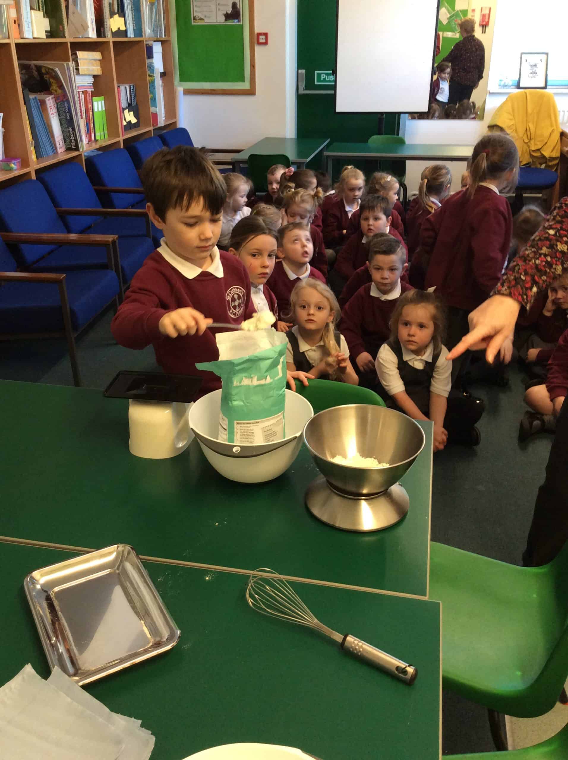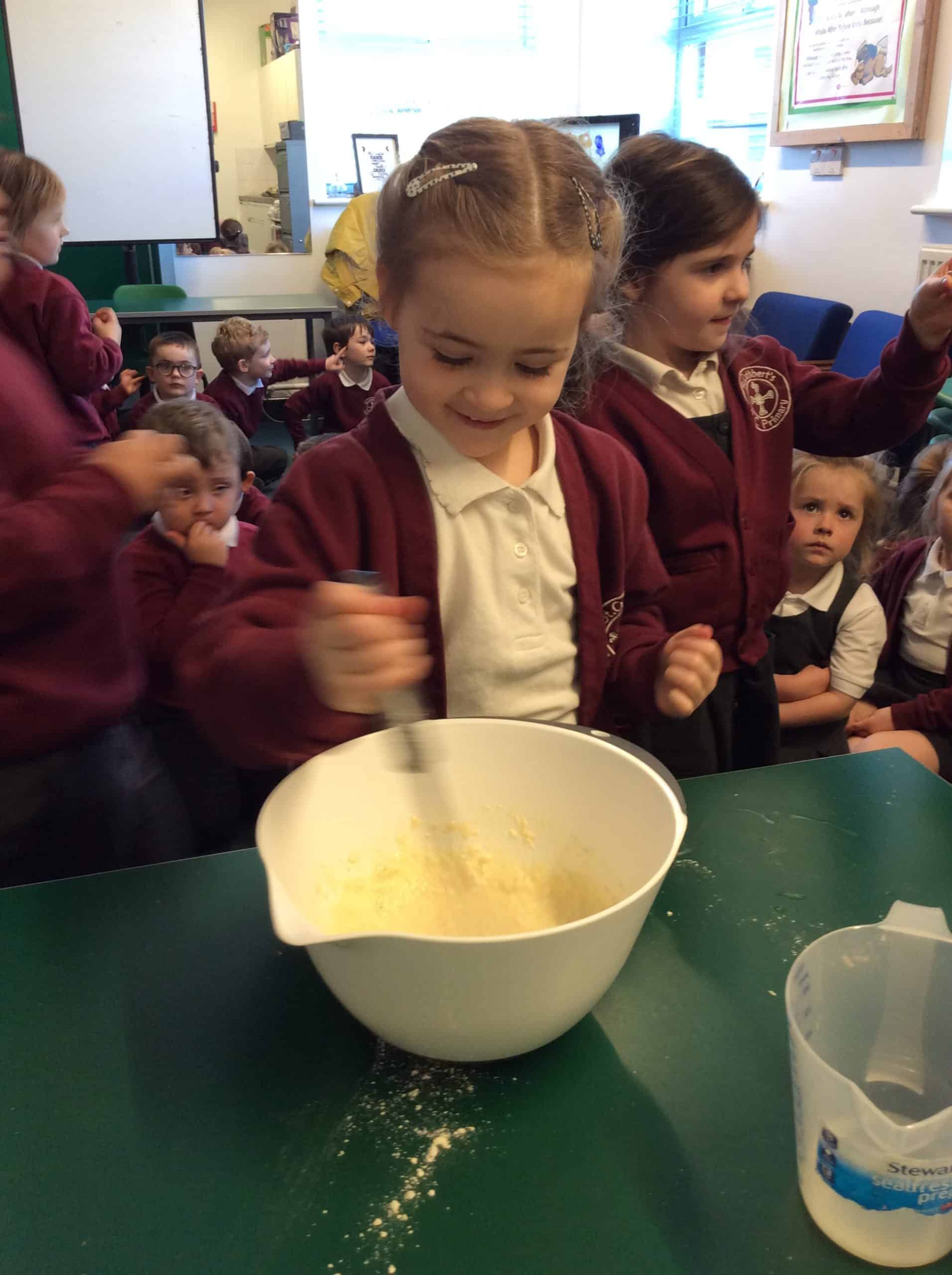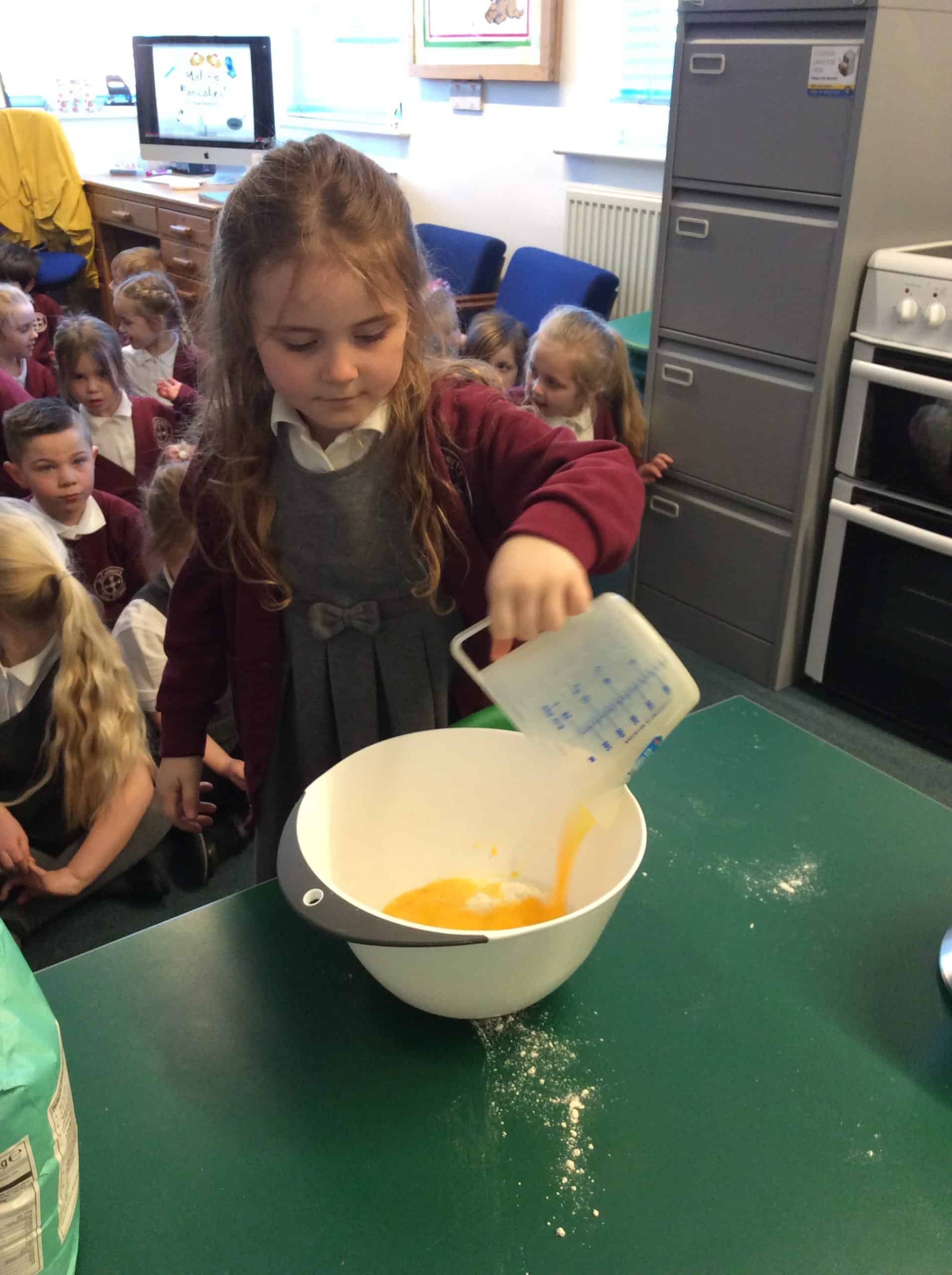 It was Pancake Day today and we decided to make our own pancakes in school. We listened to a song to help us remember the ingredients we needed and what we had to do. We each helped to add the ingredients and mix them together. The best part was when we were given some pancakes to eat.
