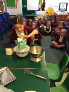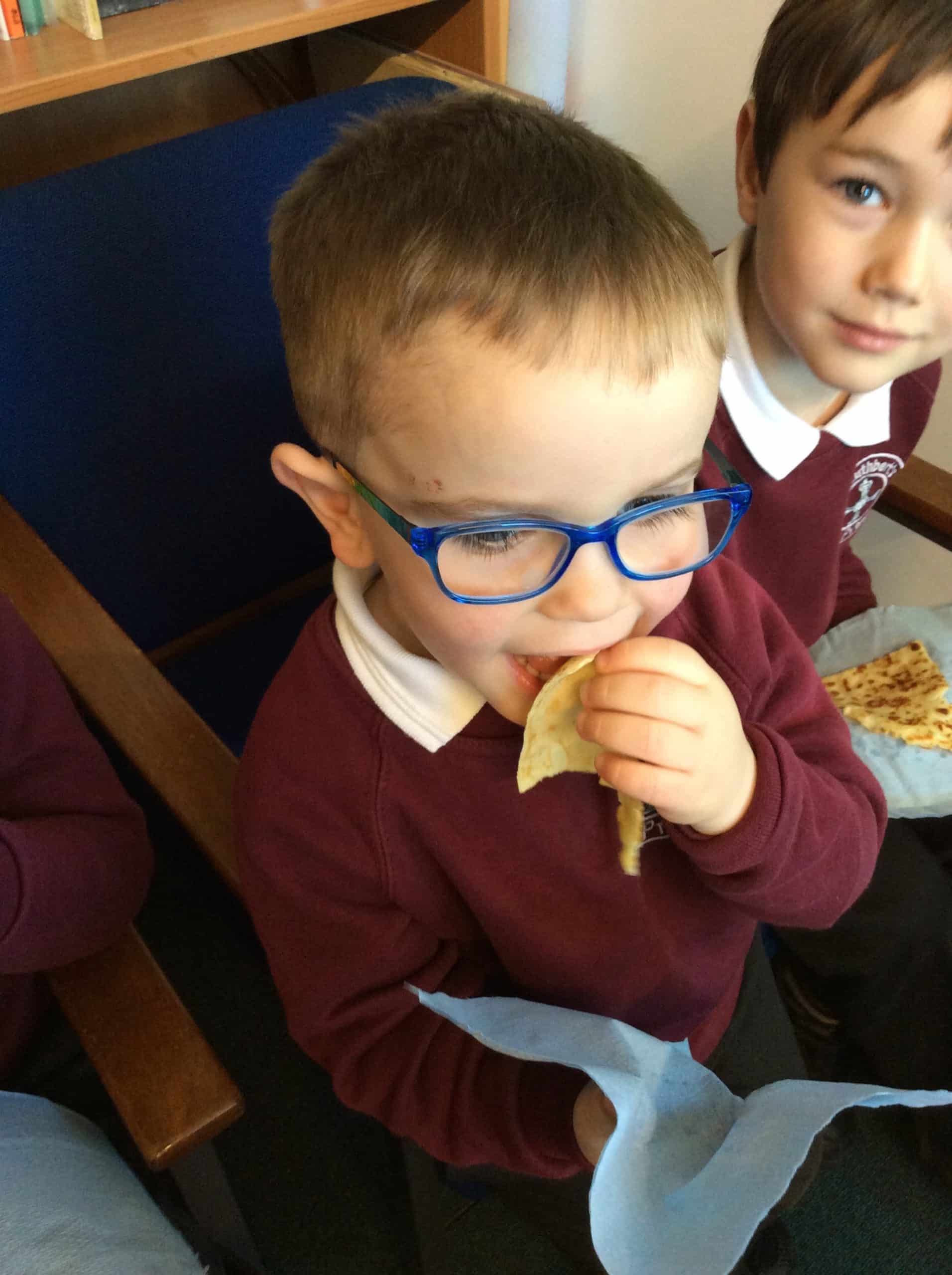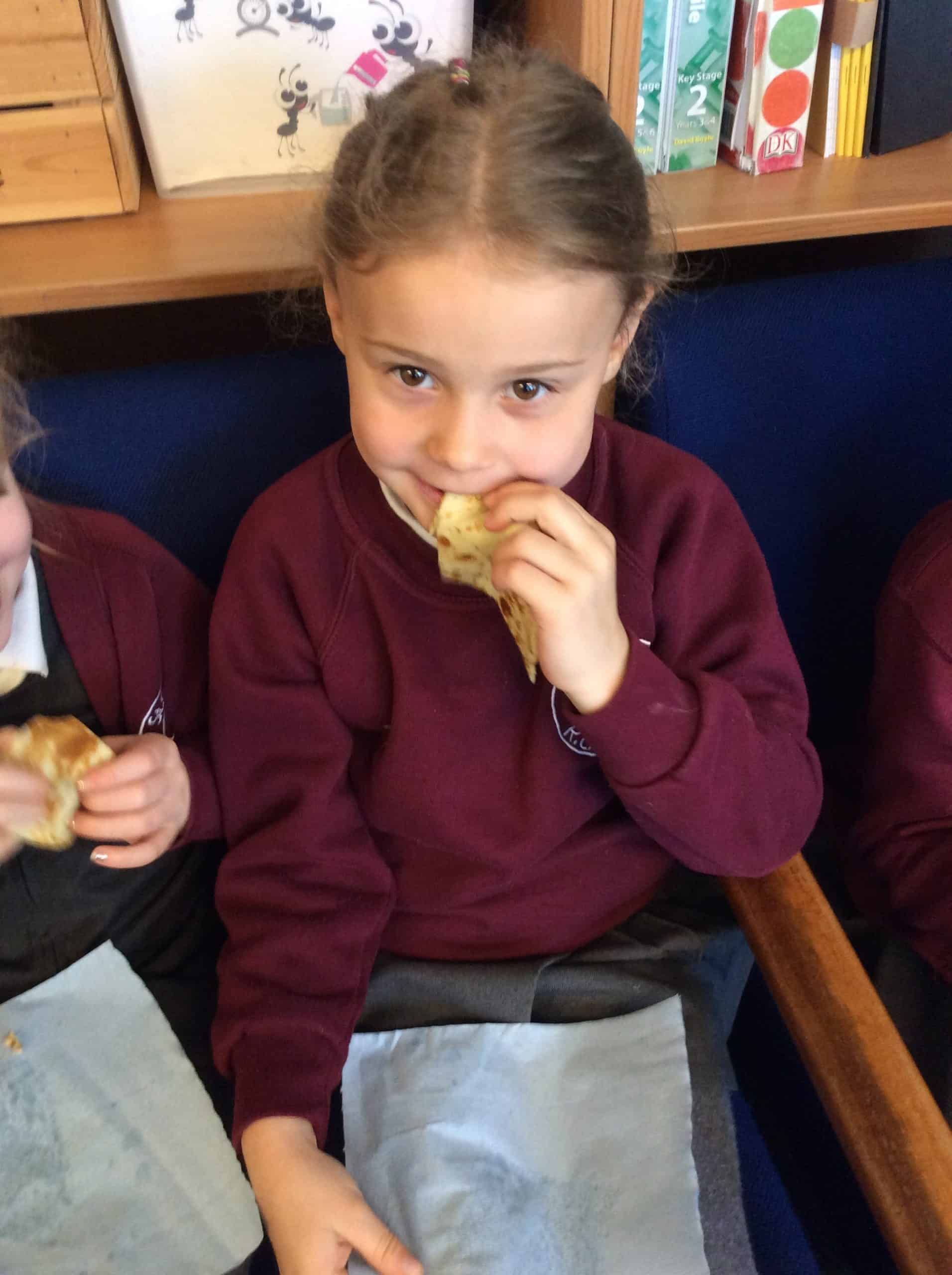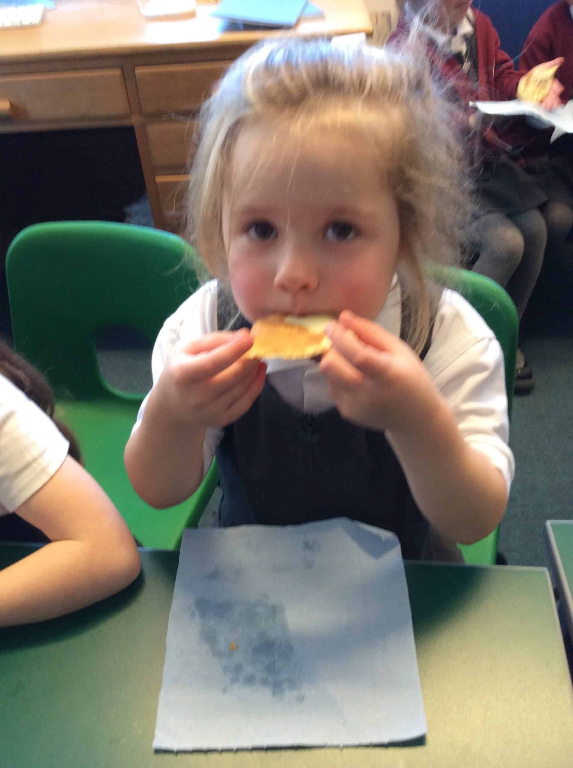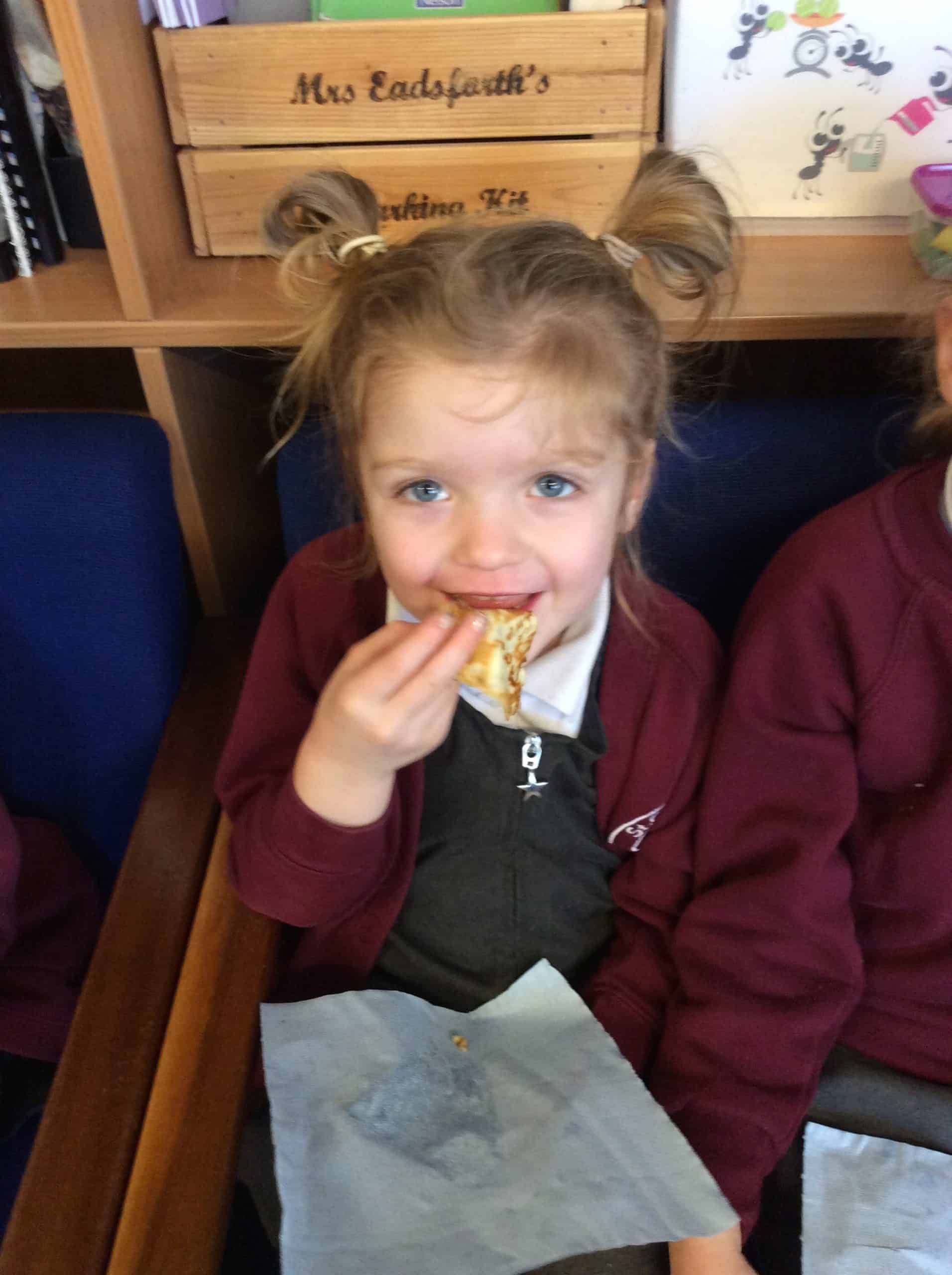 It was Pancake Day today and we decided to make our own pancakes in school. We listened to a song to help us remember the ingredients we needed and what we had to do. We each helped to add the ingredients and mix them together. The best part was when we were given some pancakes to eat.