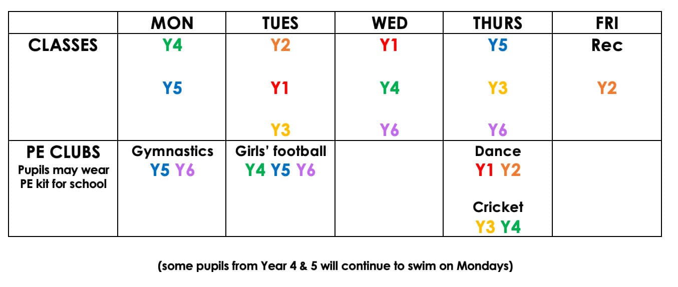 PE Timetable from April until May half term