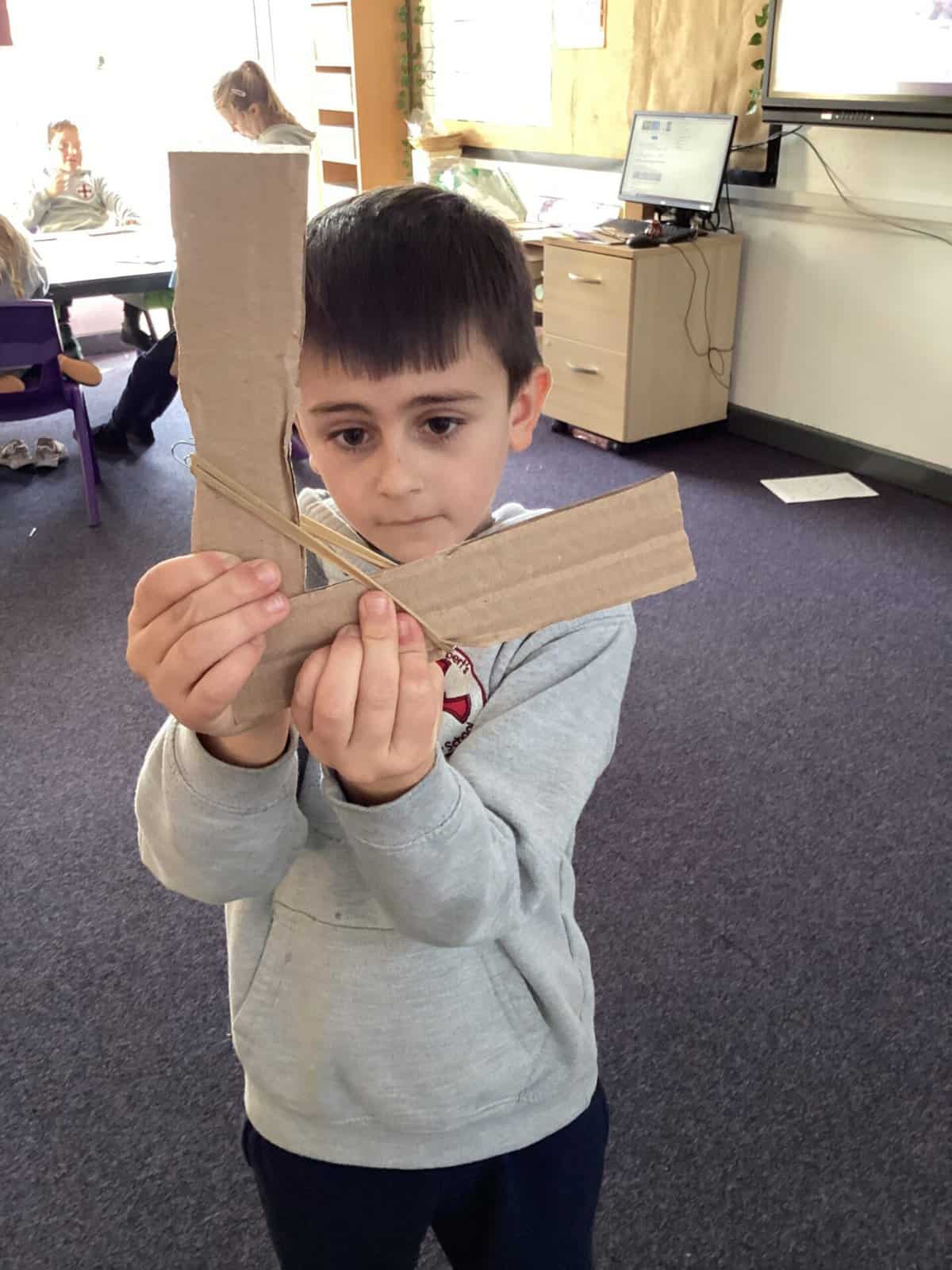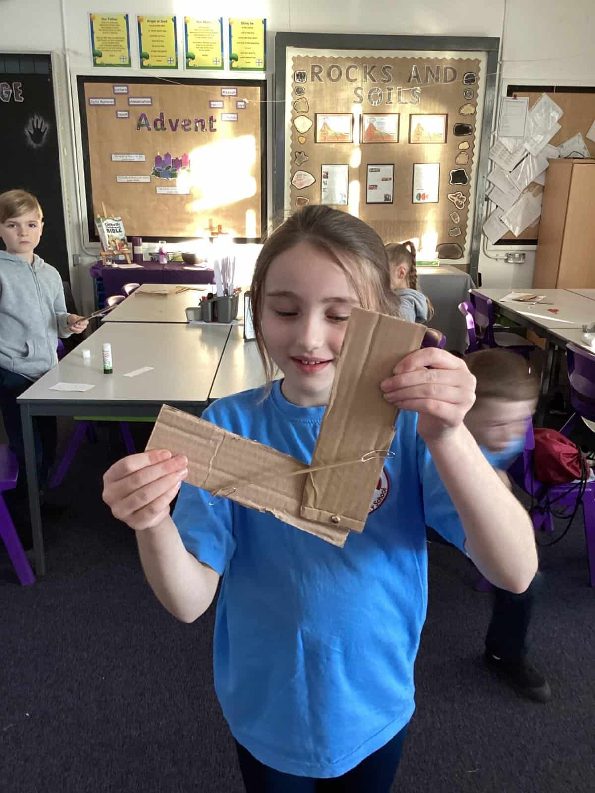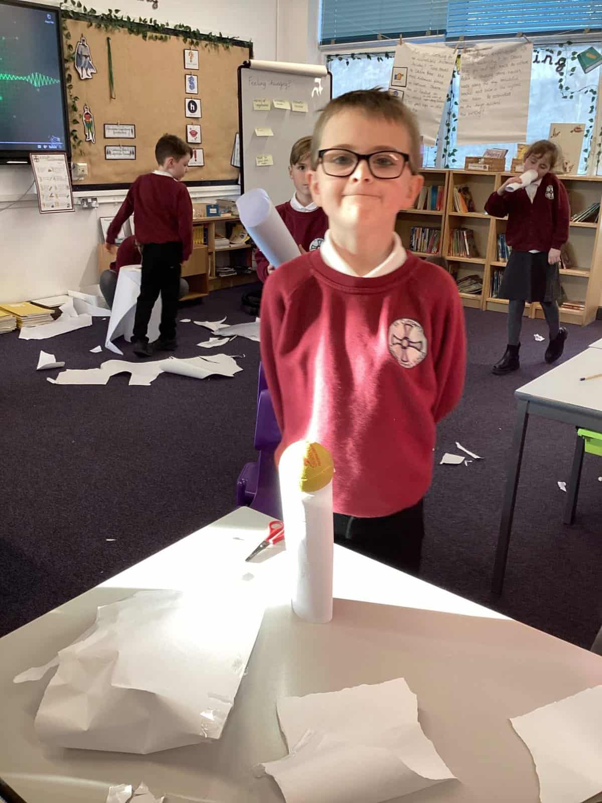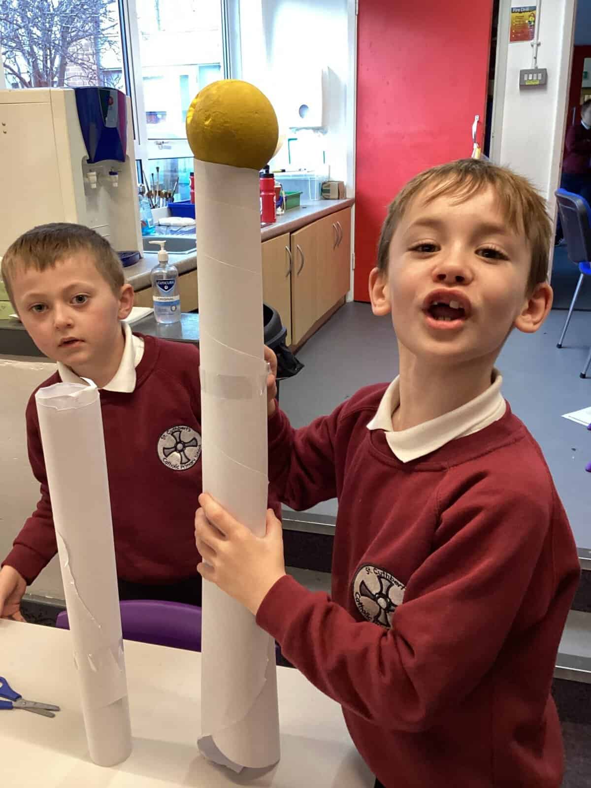 In Science we have been looking at the importance of our skeleton and muscles. We were set two tasks. One was to create a working model showing how the muscles in our arms work. The second one was to show how strong the bones in our legs are by creating a structure that would stand and hold a weight on top.