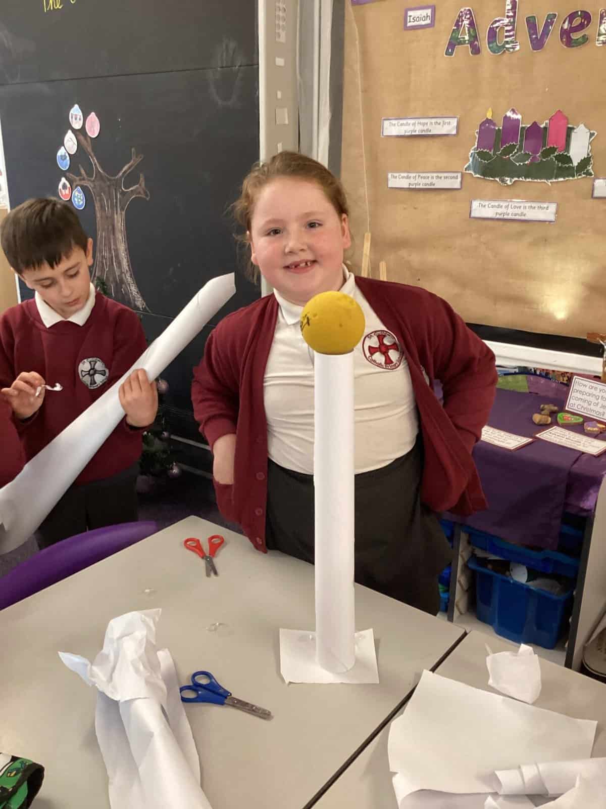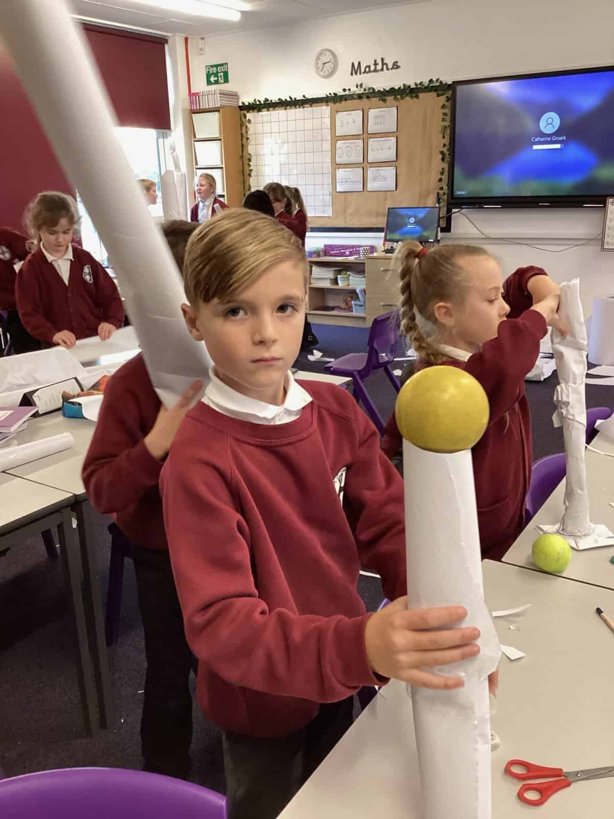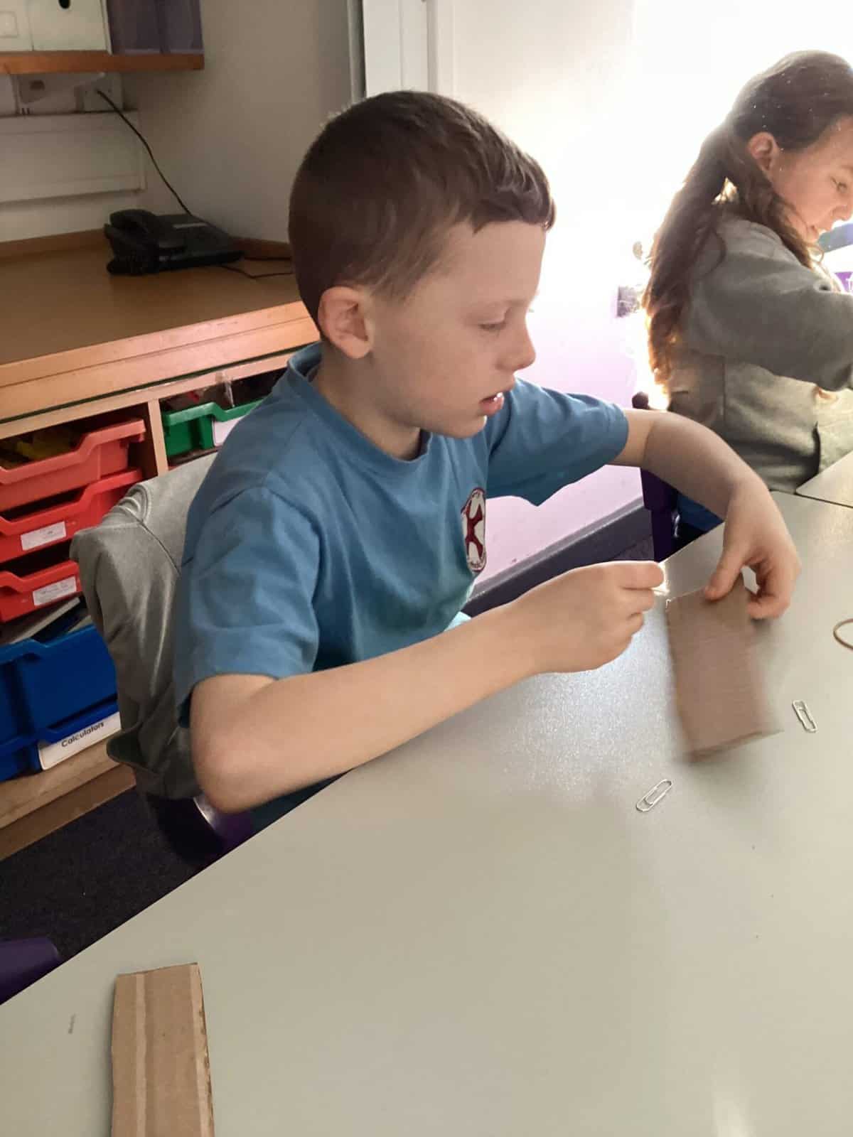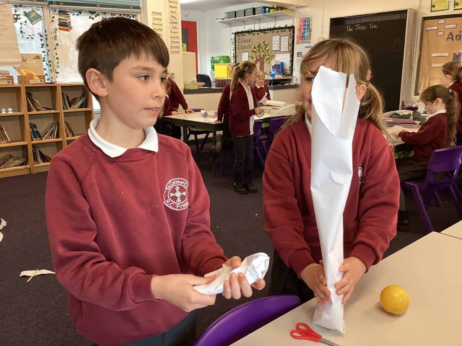 In Science we have been looking at the importance of our skeleton and muscles. We were set two tasks. One was to create a working model showing how the muscles in our arms work. The second one was to show how strong the bones in our legs are by creating a structure that would stand and hold a weight on top.