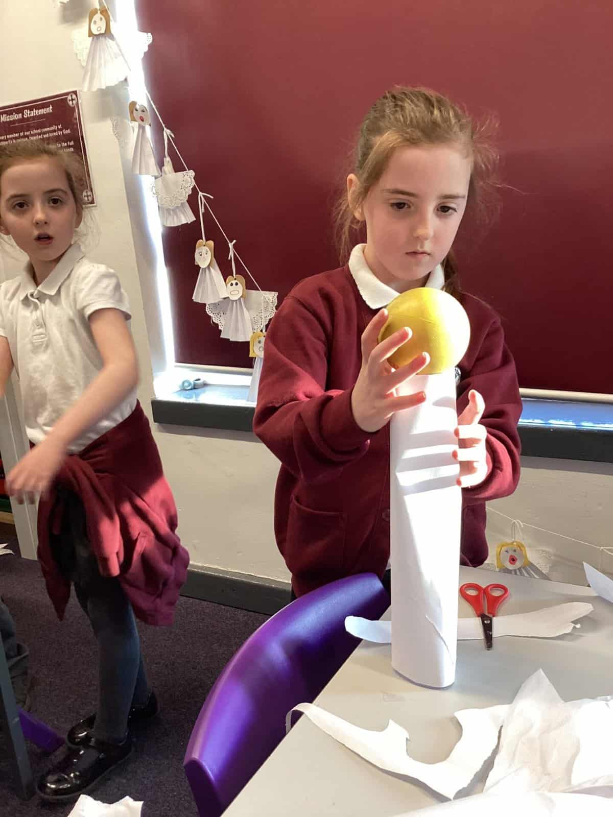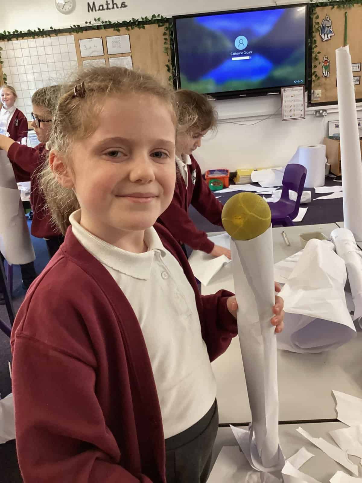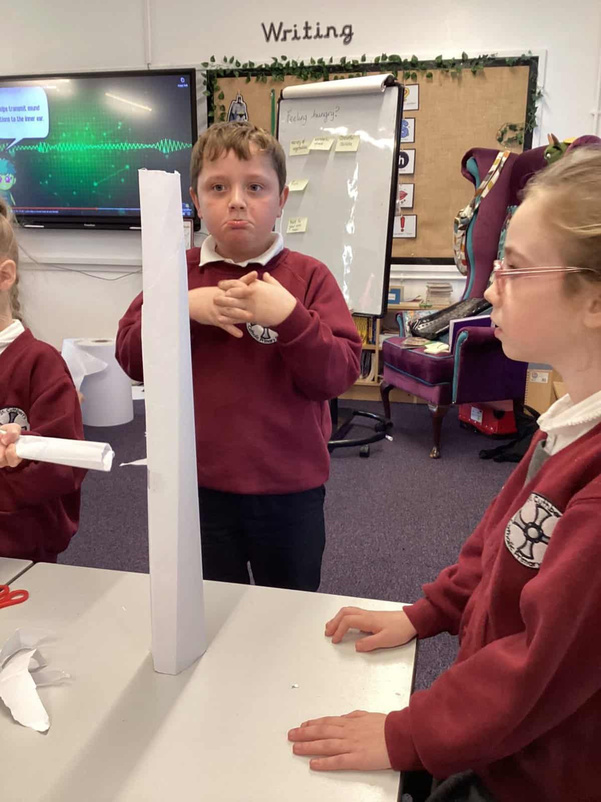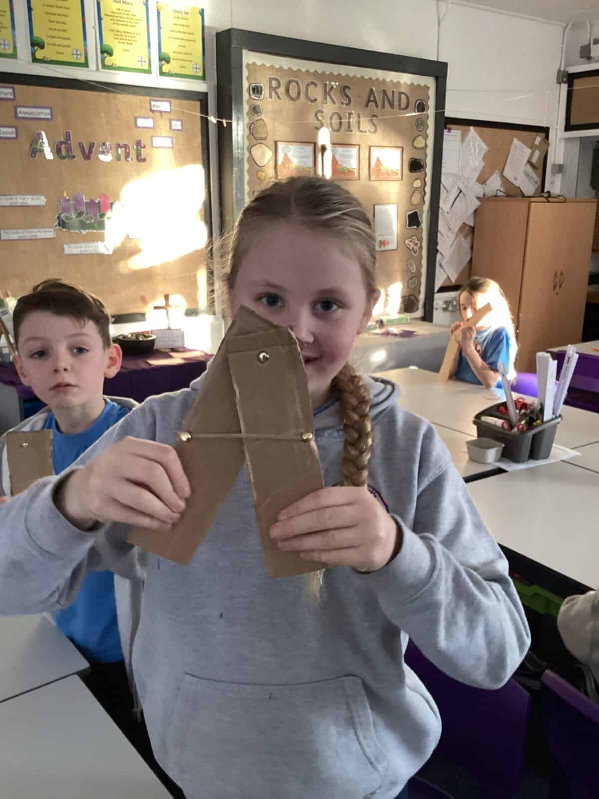 In Science we have been looking at the importance of our skeleton and muscles. We were set two tasks. One was to create a working model showing how the muscles in our arms work. The second one was to show how strong the bones in our legs are by creating a structure that would stand and hold a weight on top.
