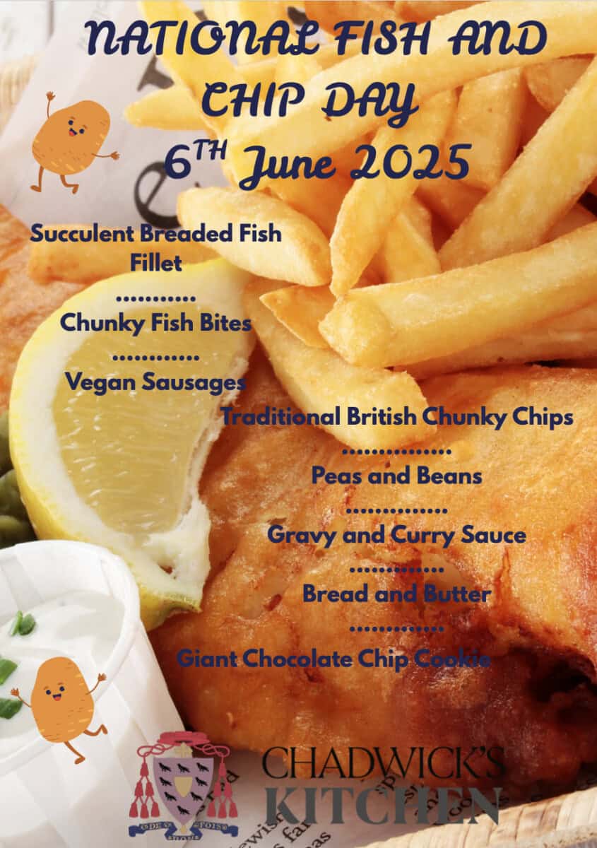 Our wonderful kitchen staff are offering a special school dinner on Friday 6th June to celebrate National Fish and Chip Day. For menu choices, see the picture below.