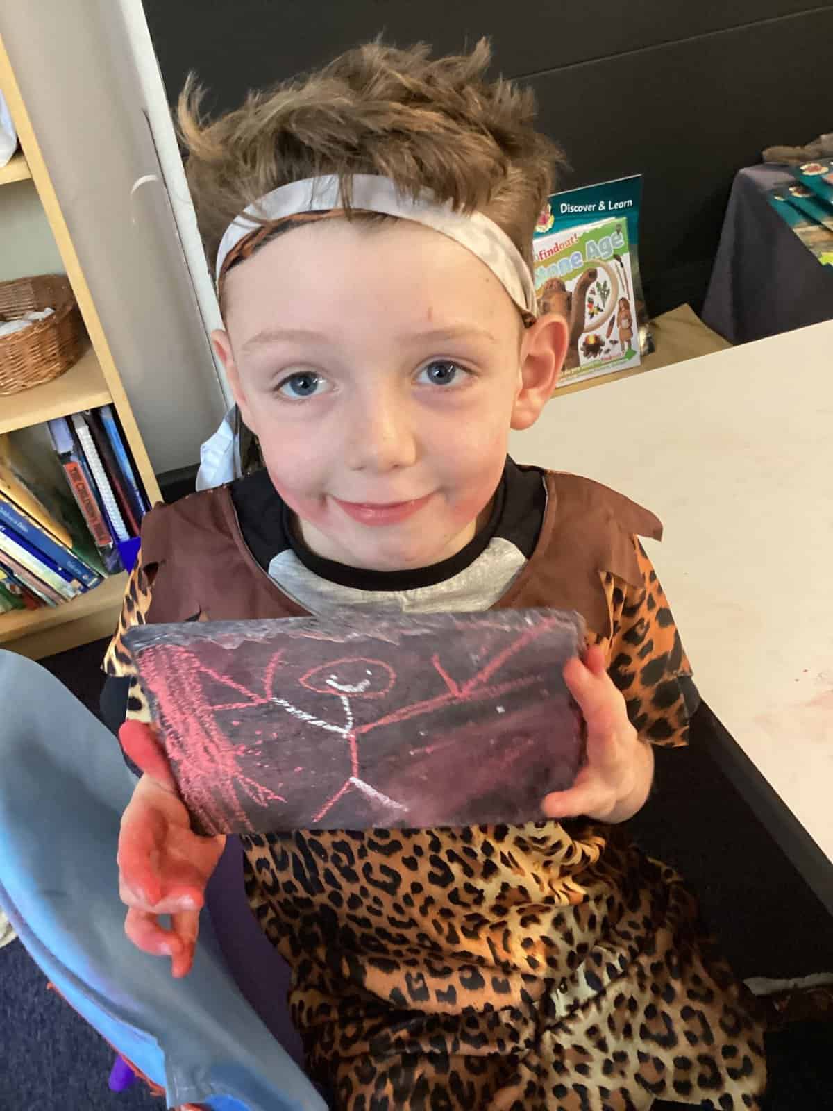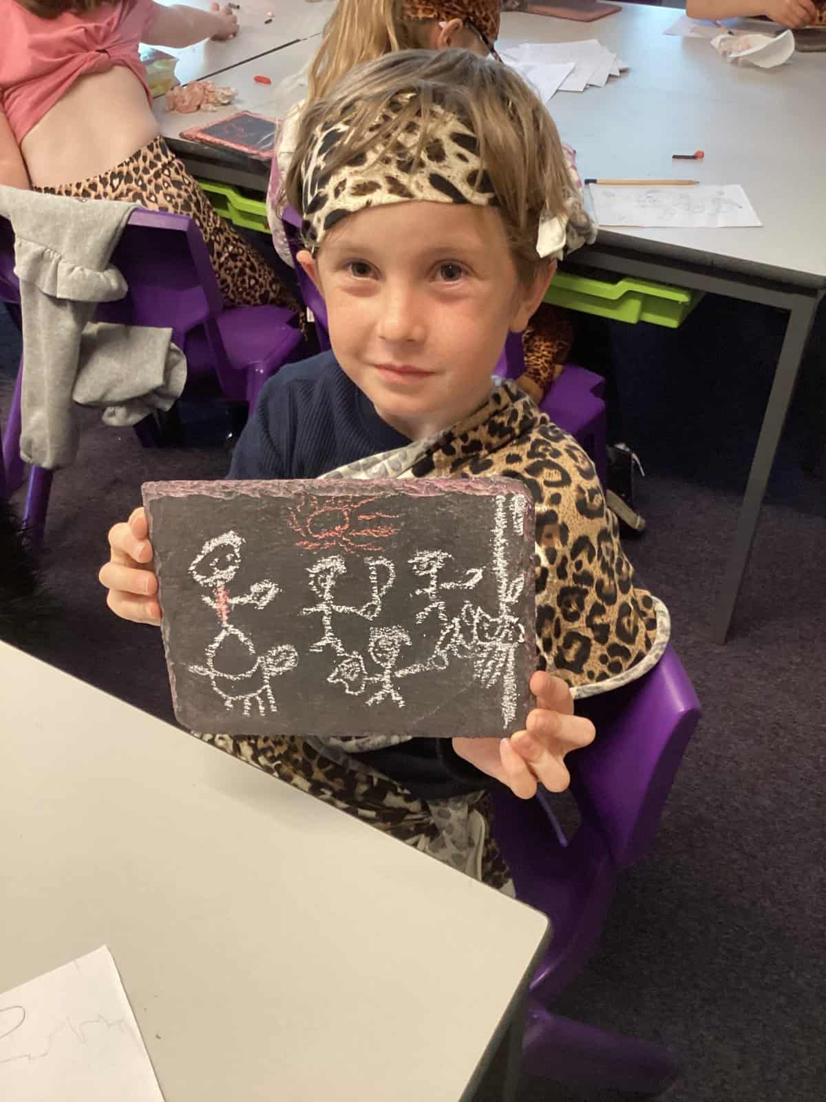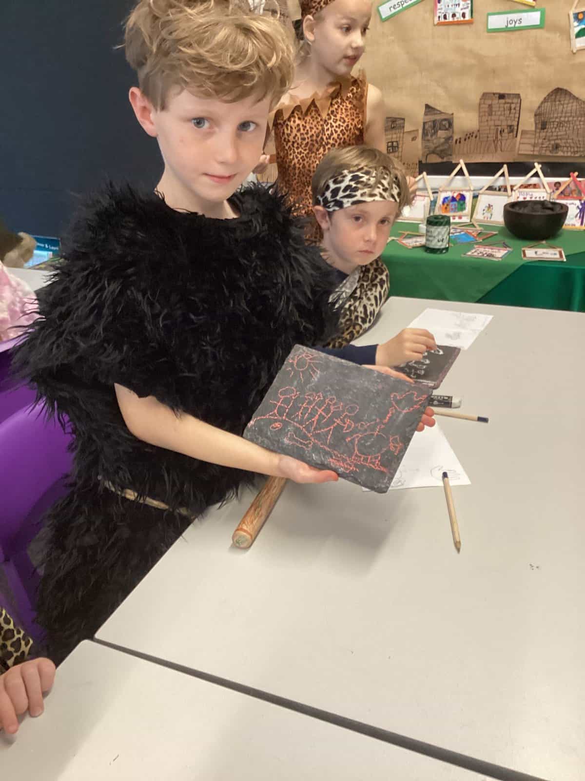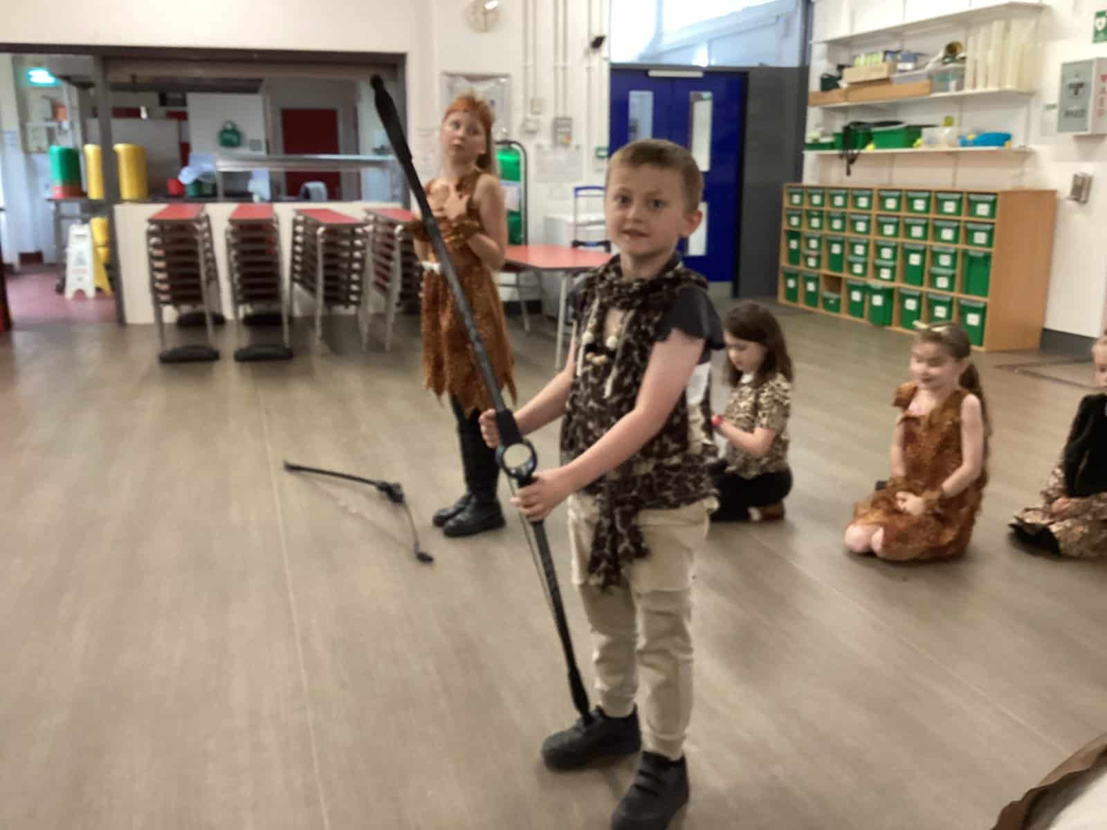 Stevie a person from the Stone Age came to work with us today. We learnt lots of facts about how humans evolved over time. We were able to handle a variety of animal skins and bones that would have been around and think of how we could use them to help us survive. As this historical period is prehistoric we also looked at cave paintings and used chalk and charcoal to create our own. At the end of the day we used some bow and arrows to hunt for our food ! We learnt so much at the same time as having lots of fun. Thank you to all of the grown ups for supporting us with the fabulous costumes.