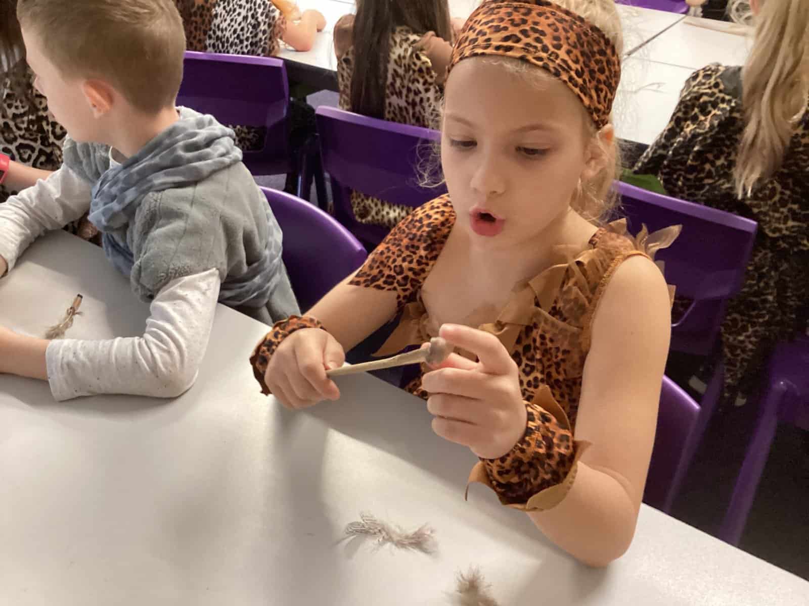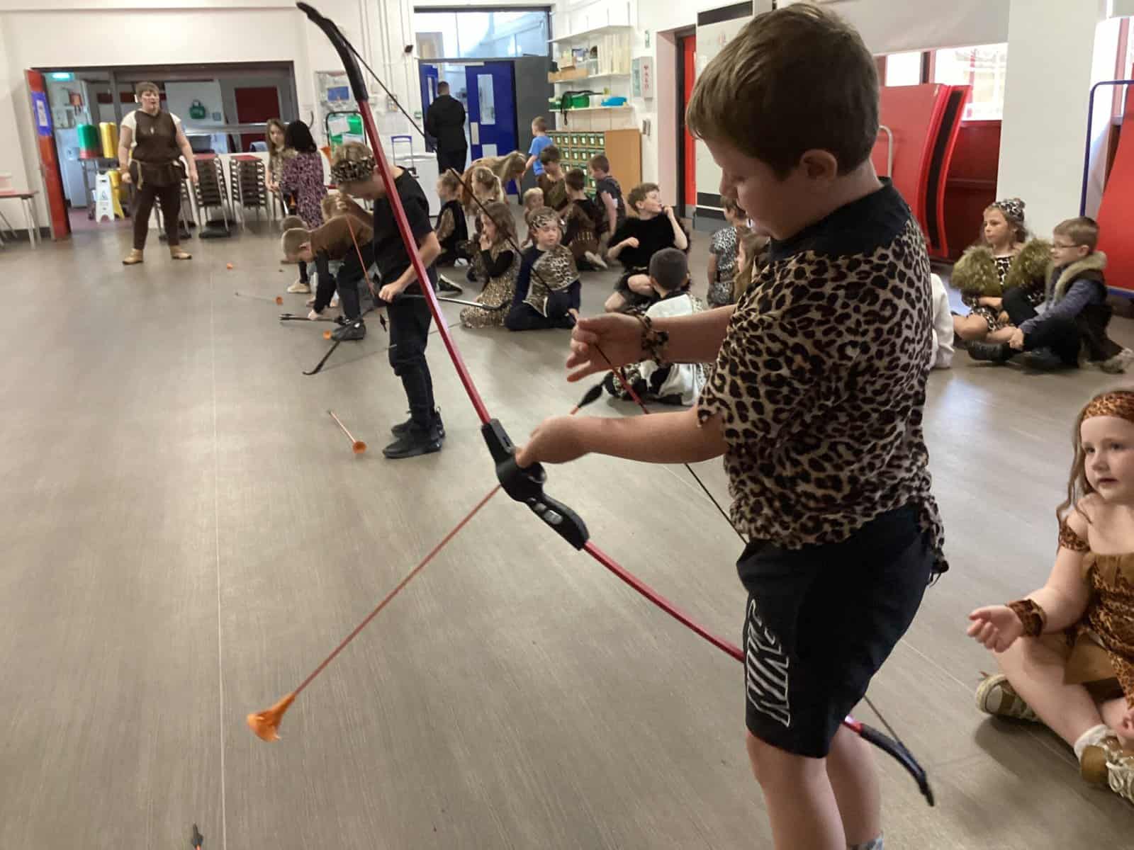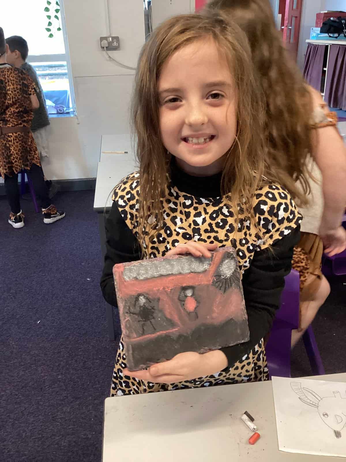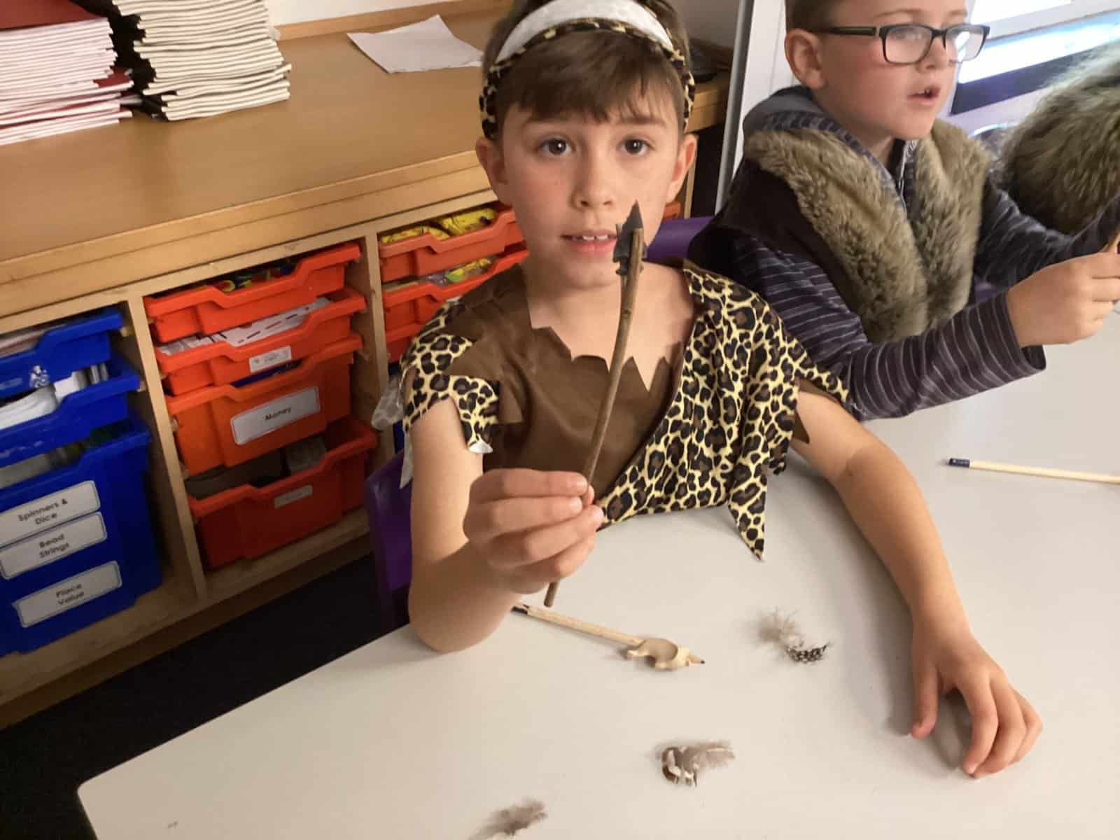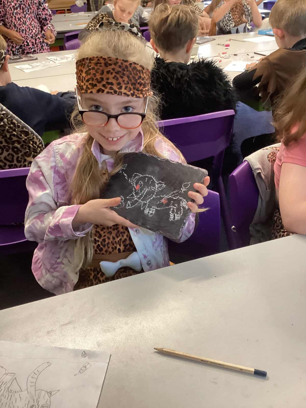 Stevie a person from the Stone Age came to work with us today. We learnt lots of facts about how humans evolved over time. We were able to handle a variety of animal skins and bones that would have been around and think of how we could use them to help us survive. As this historical period is prehistoric we also looked at cave paintings and used chalk and charcoal to create our own. At the end of the day we used some bow and arrows to hunt for our food ! We learnt so much at the same time as having lots of fun. Thank you to all of the grown ups for supporting us with the fabulous costumes.