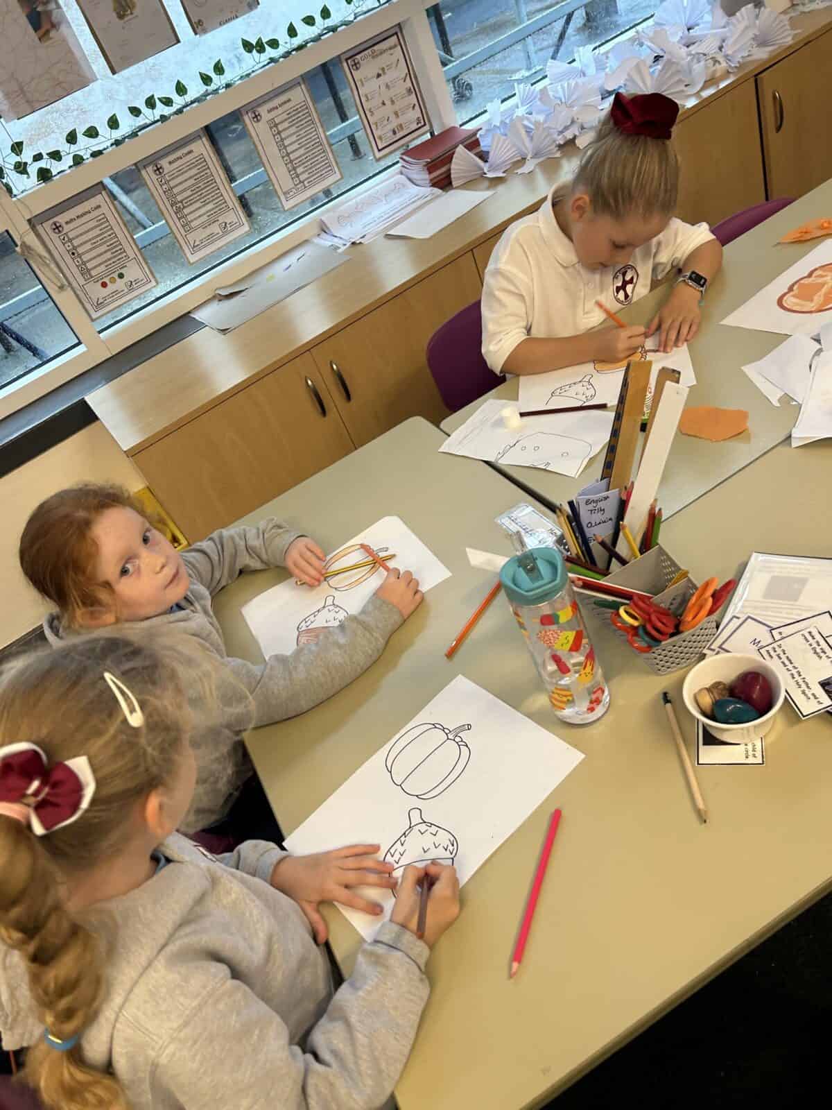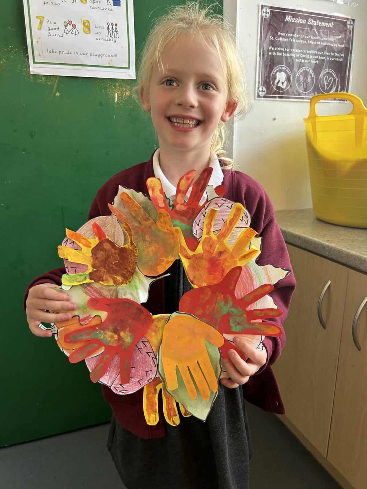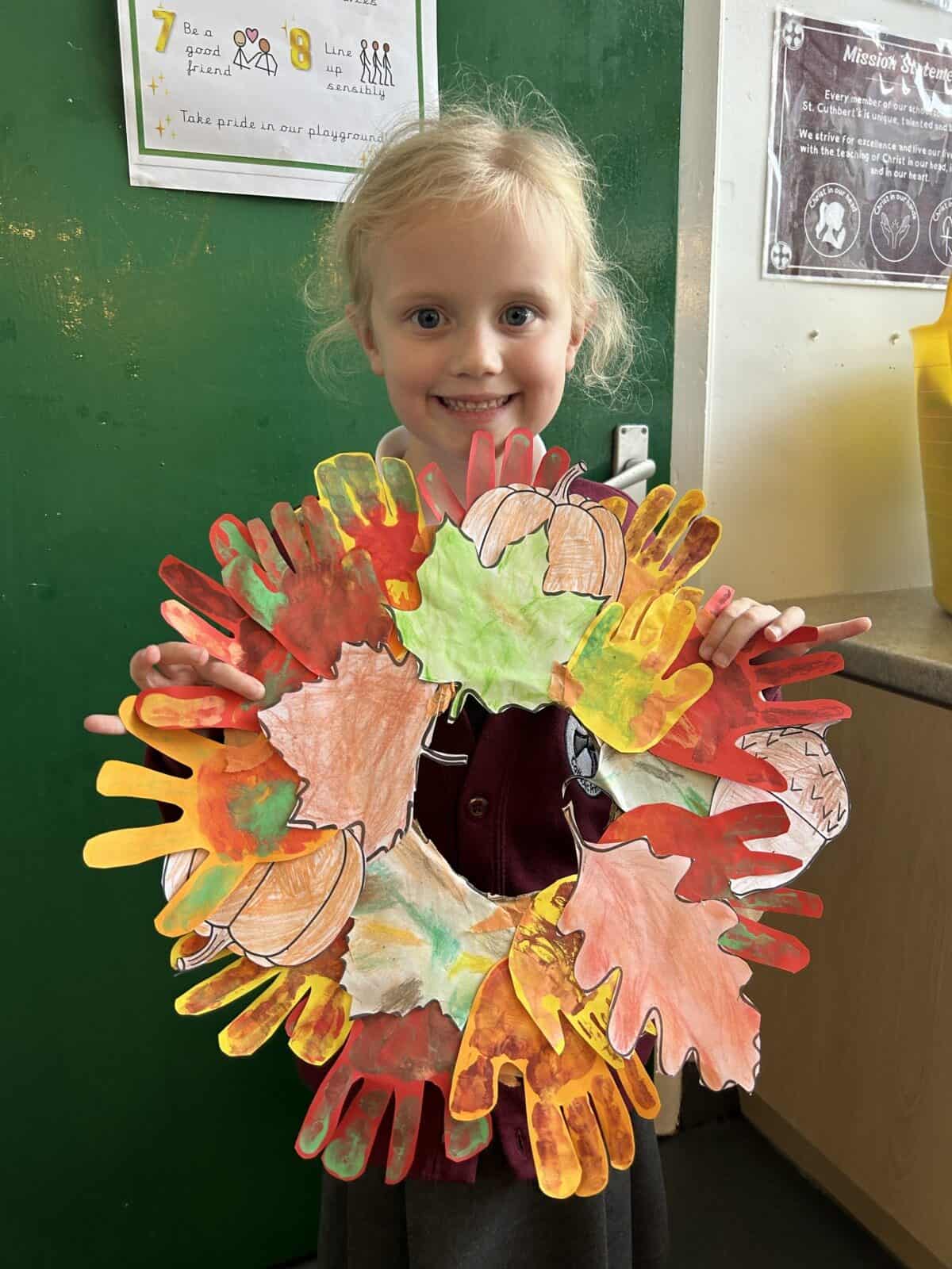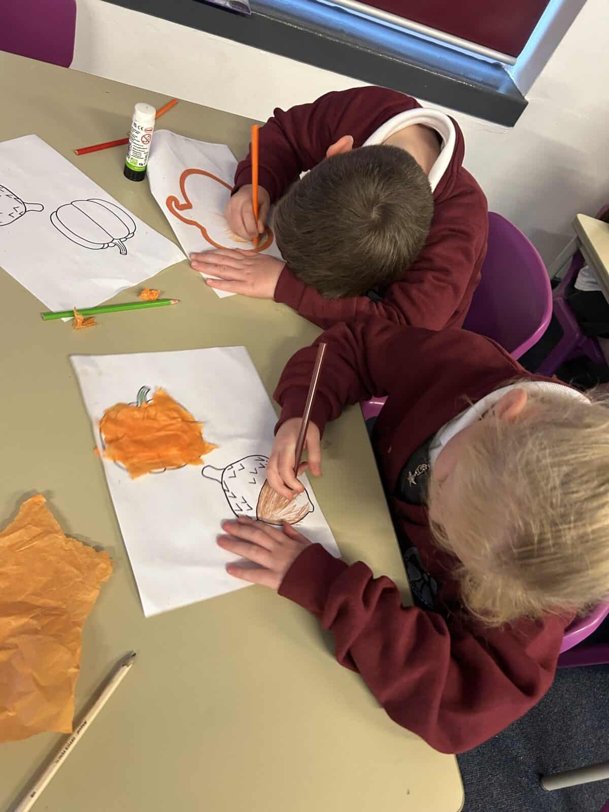 Once complete, we cut out our pumpkins and created wreaths using our artwork from the previous two weeks. The wreath is now being displayed in our main entrance.