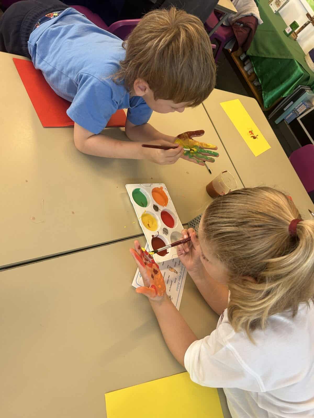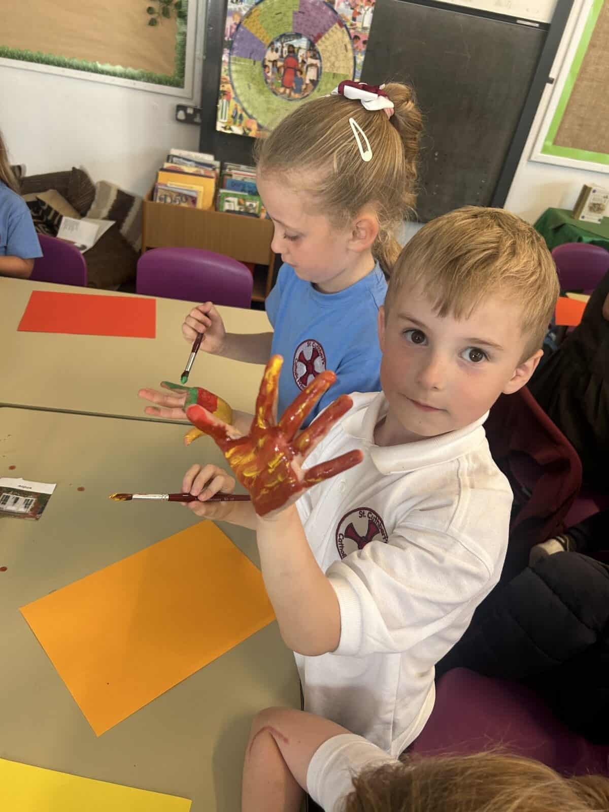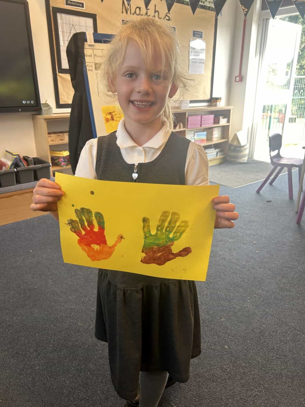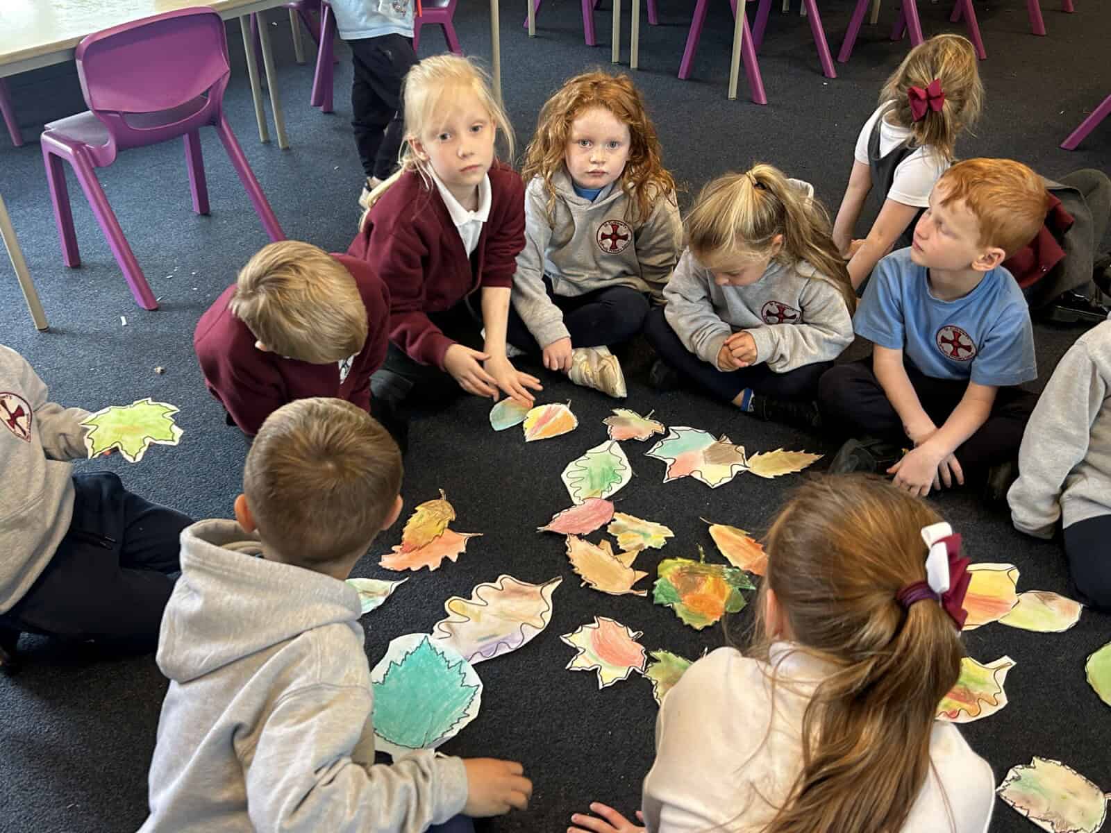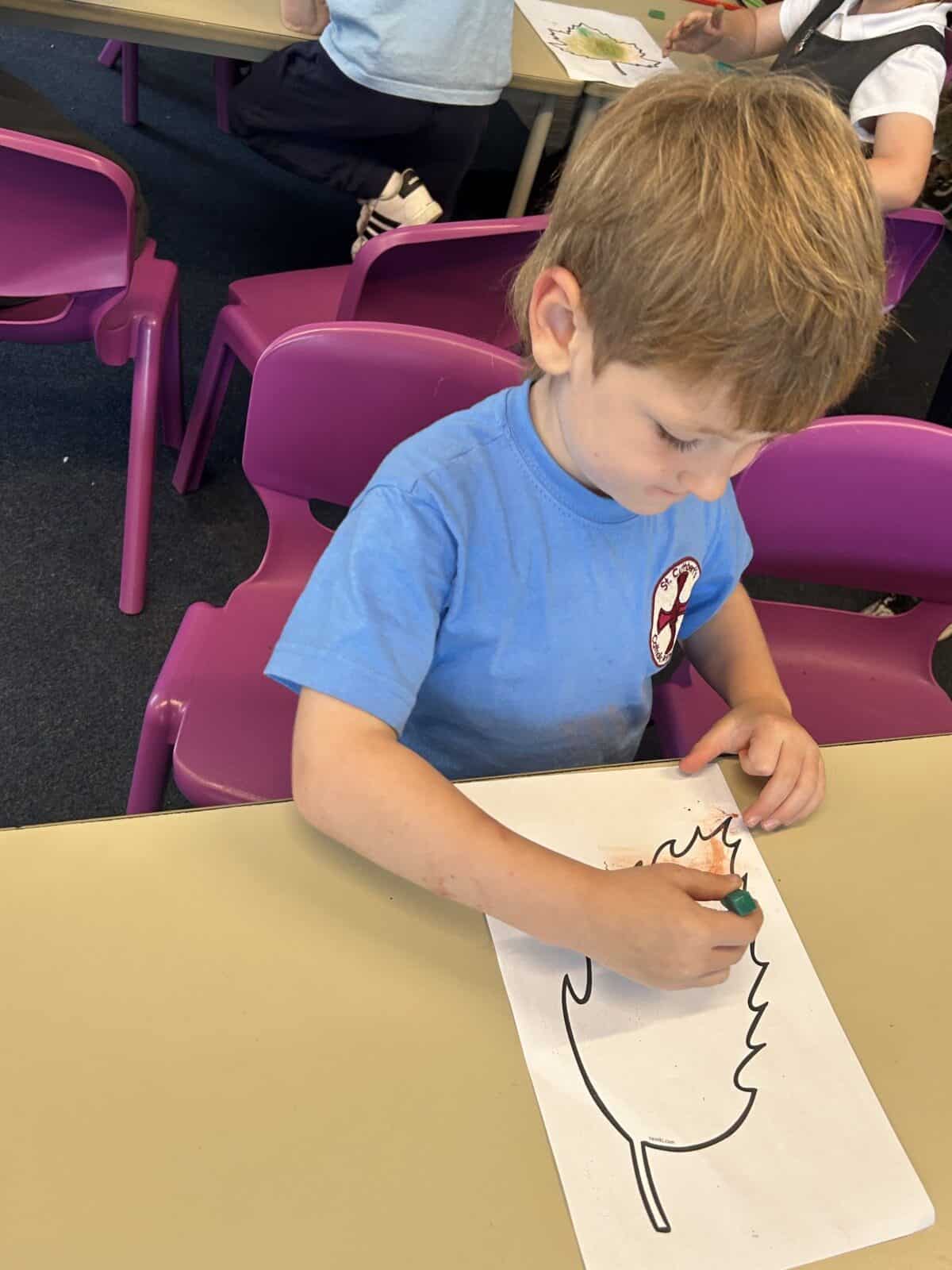 This week, children read Leaf Man and found that leaves go wherever the wind blows. Children then rolled up their sleeves and created autumn coloured hand prints which were then turned into leaves. Along with their chalk leaves, they will be joined together to create autumnal wreaths.
