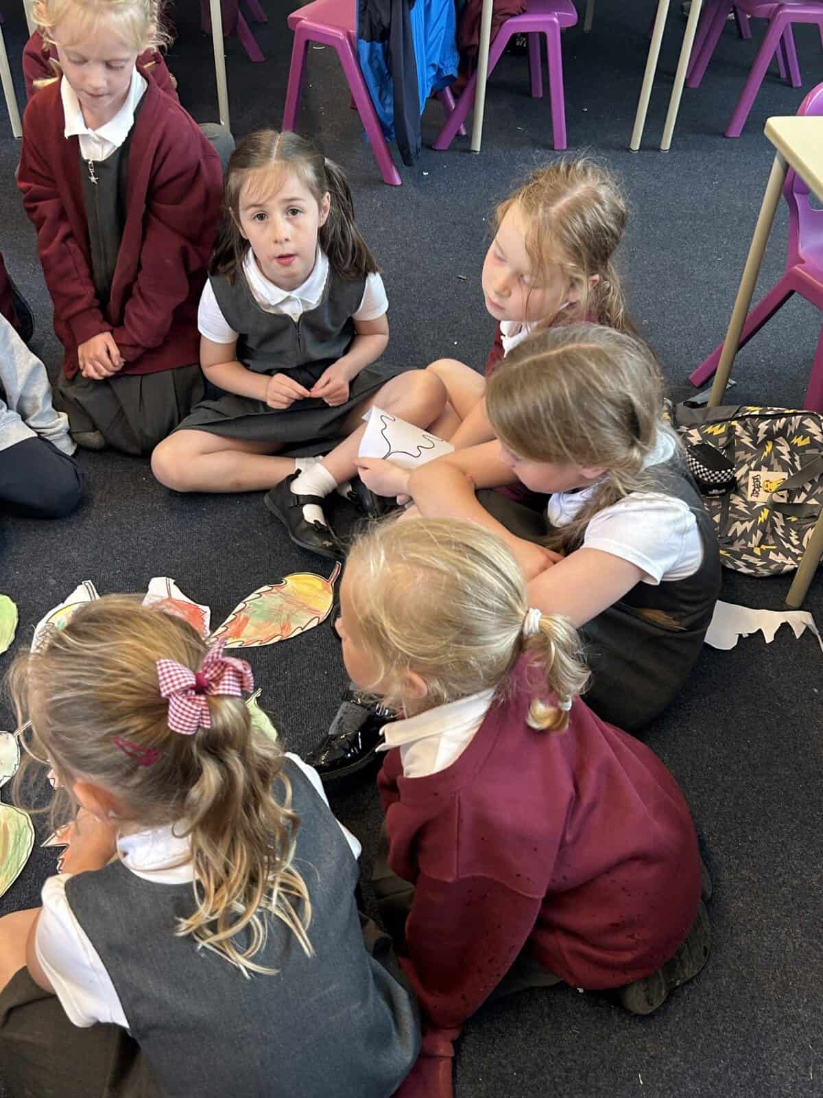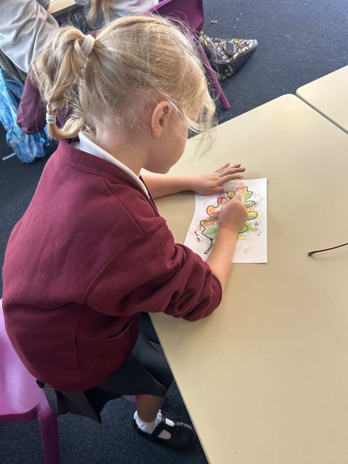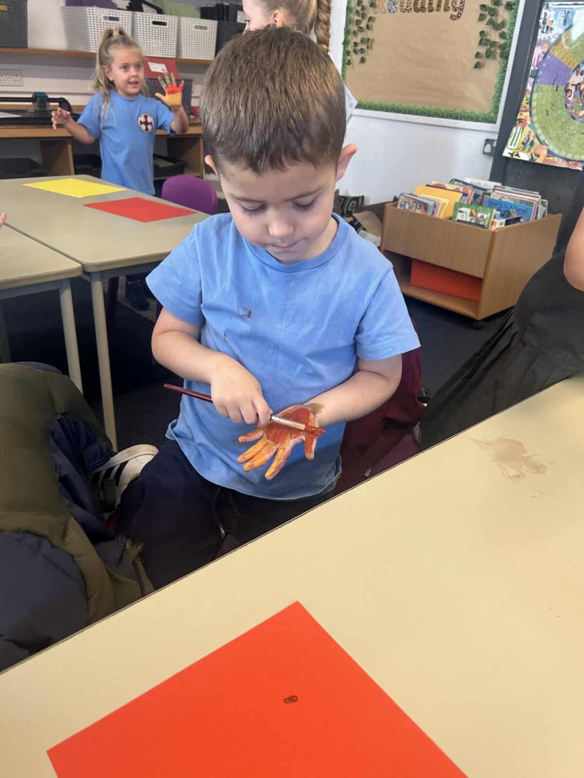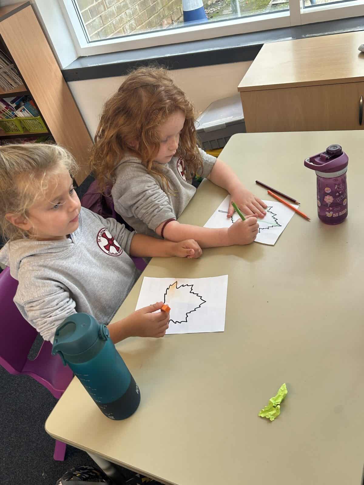 This week, children read Leaf Man and found that leaves go wherever the wind blows. Children then rolled up their sleeves and created autumn coloured hand prints which were then turned into leaves. Along with their chalk leaves, they will be joined together to create autumnal wreaths.