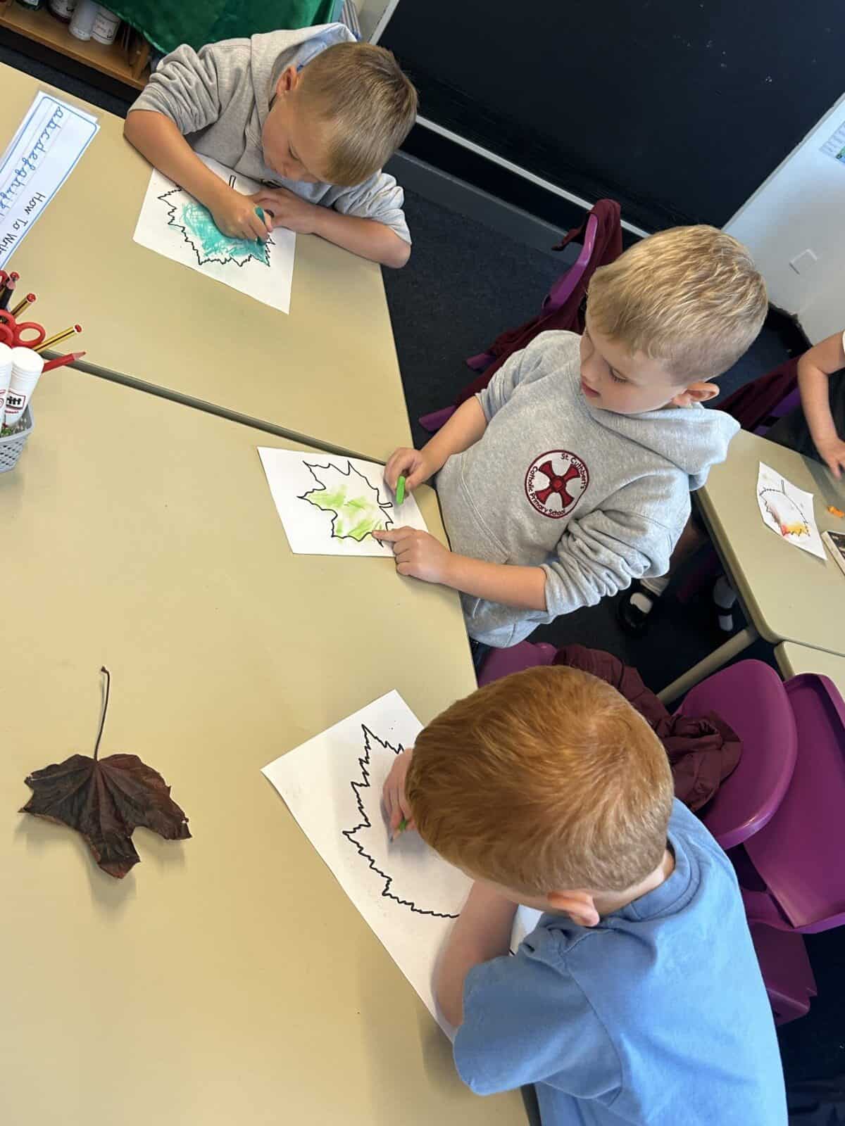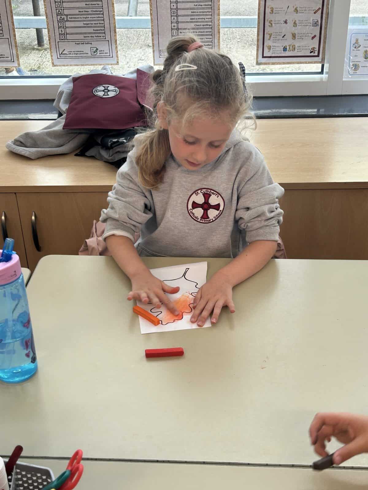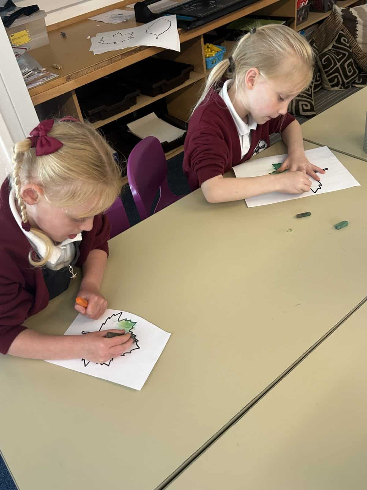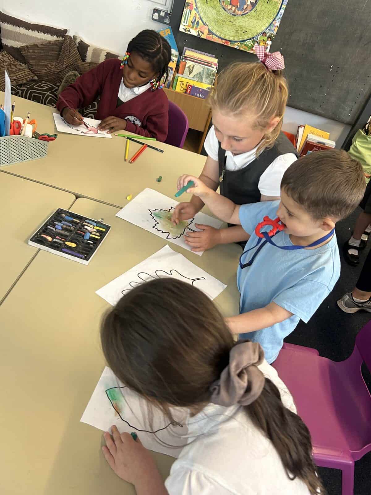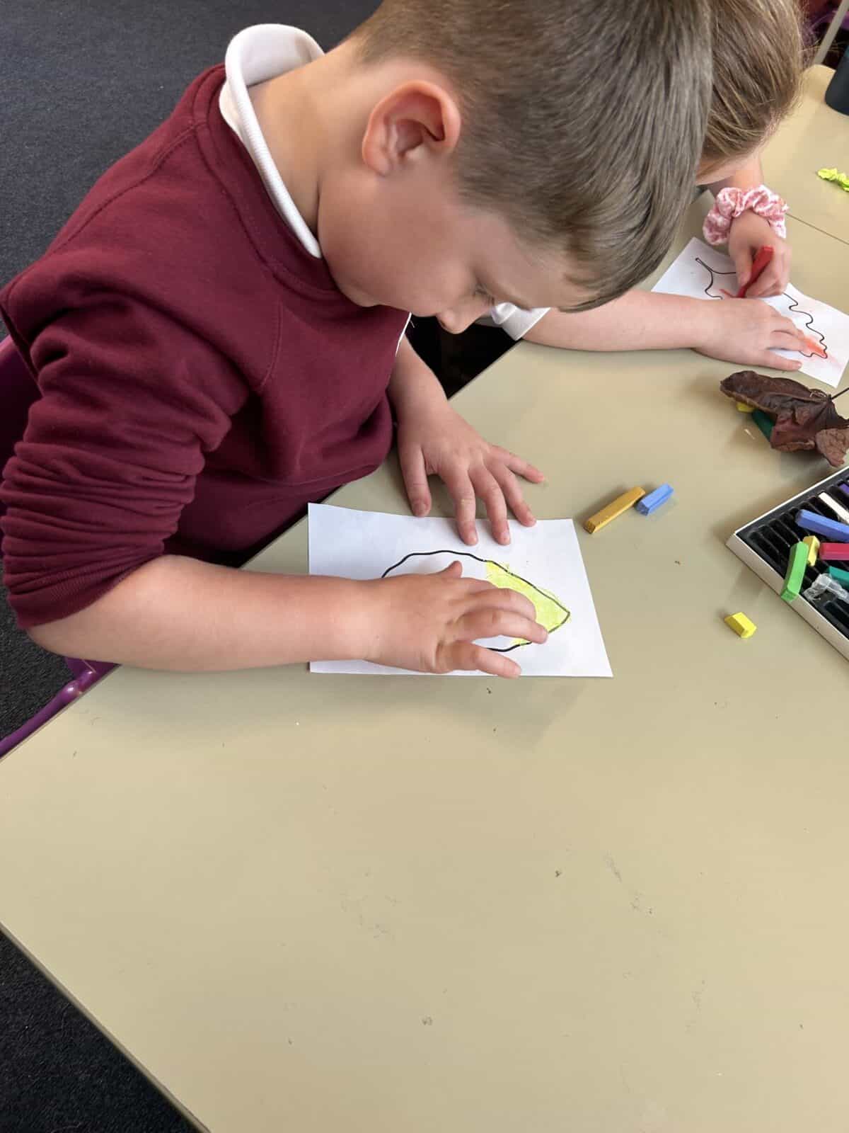 Firstly, the children read The Leaf Thief then created their own autumnal leaves using chalk, learning how to blend.