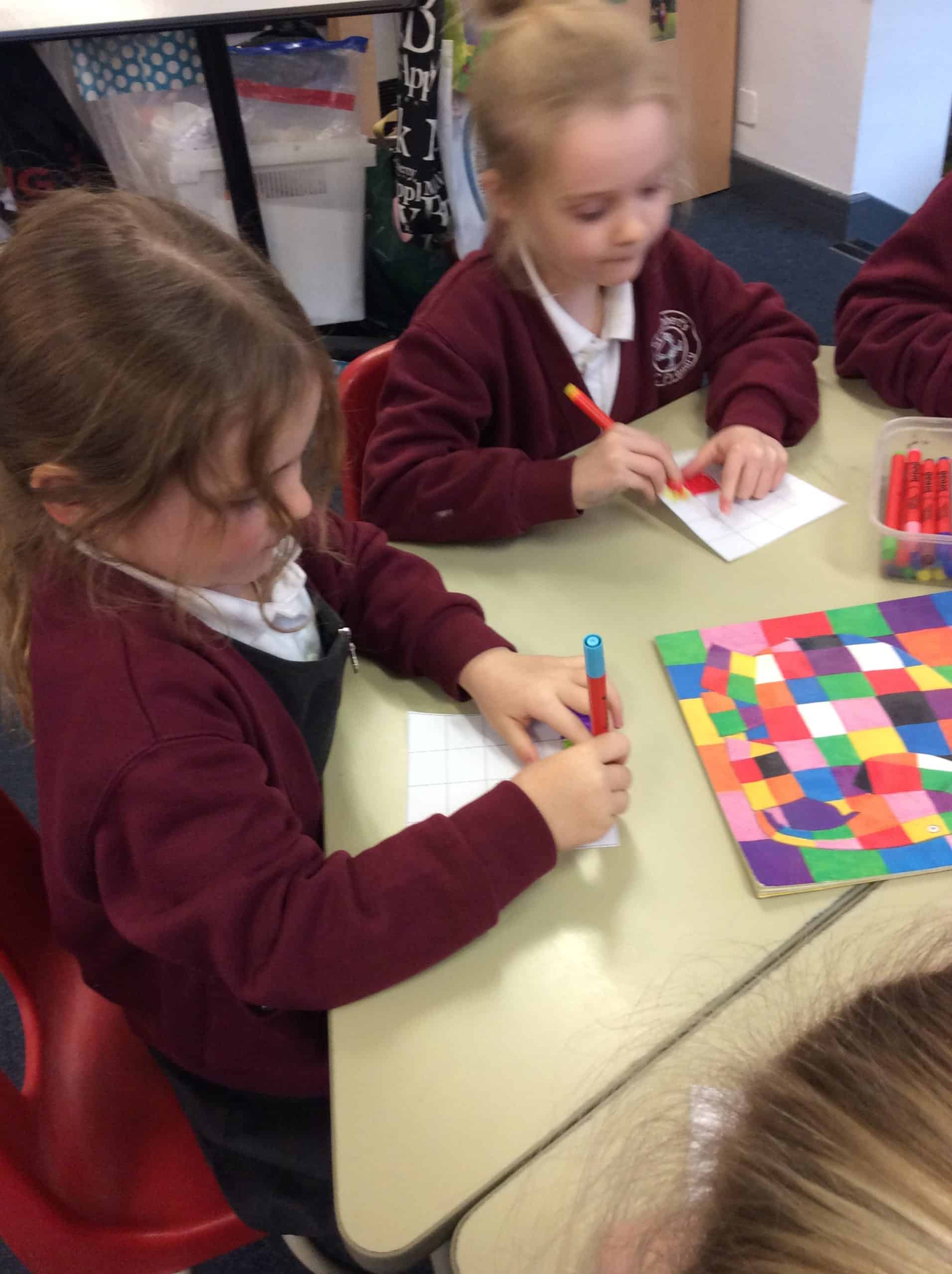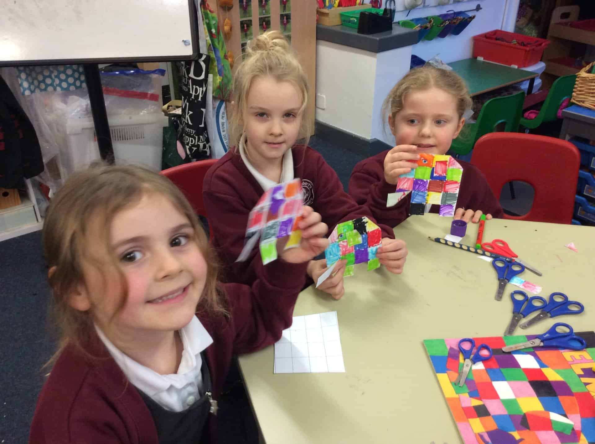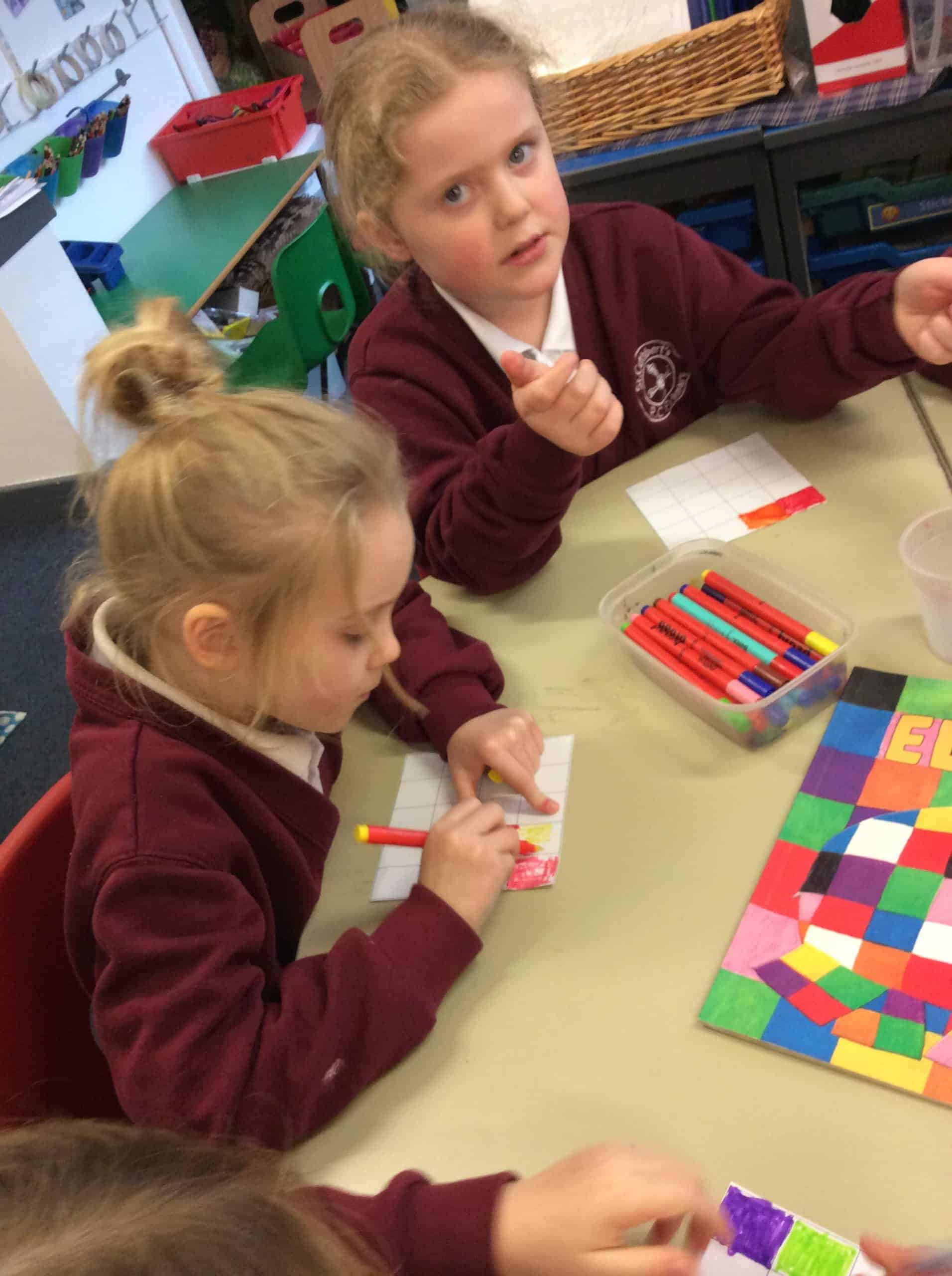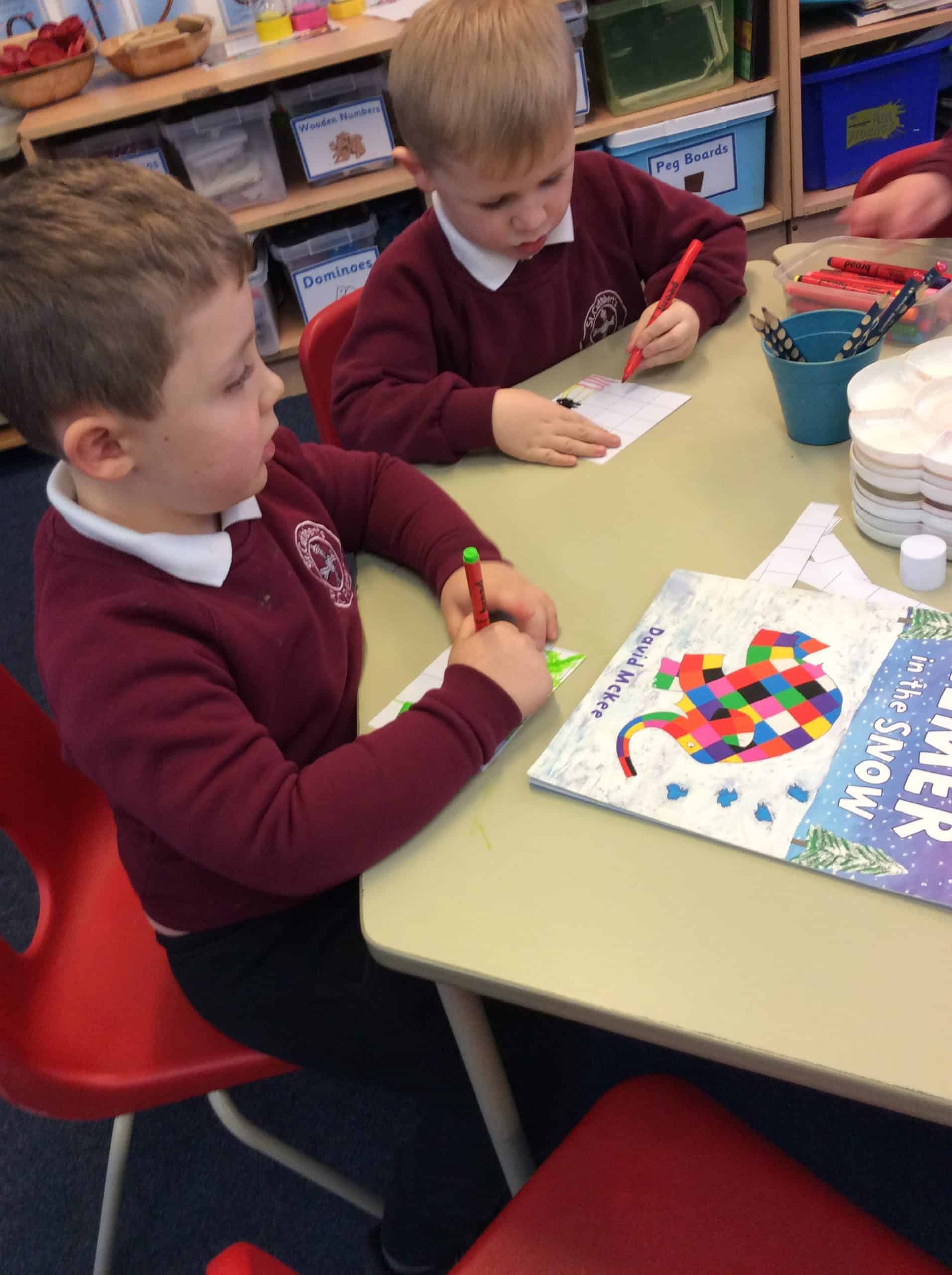 In our first session the children really enjoyed listening to an Elmer story. Their challenge was to then make their own Elmer by making up their own pattern and some careful cutting.