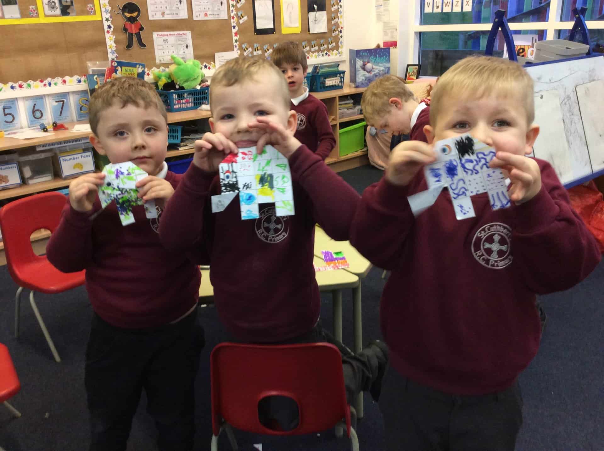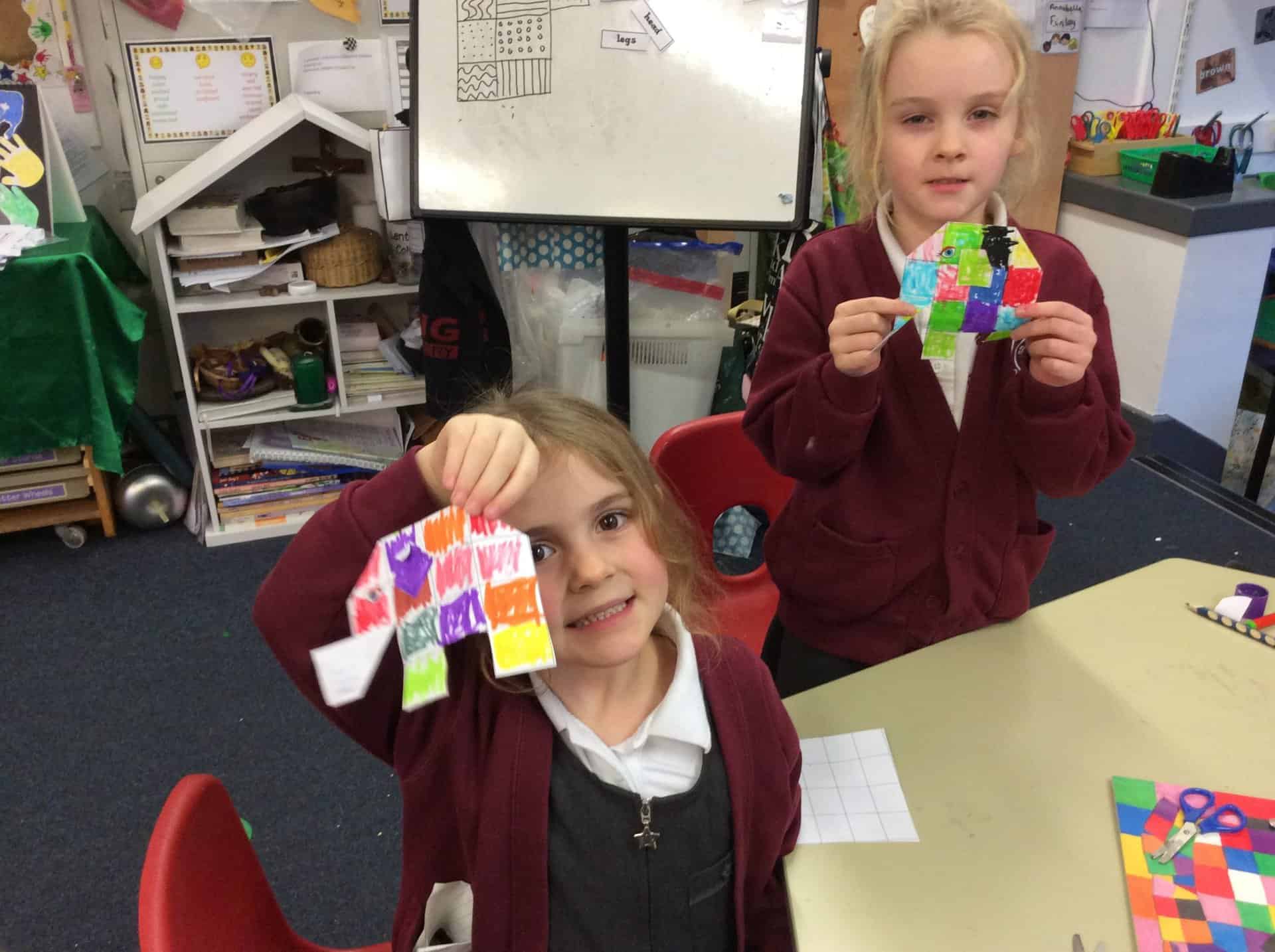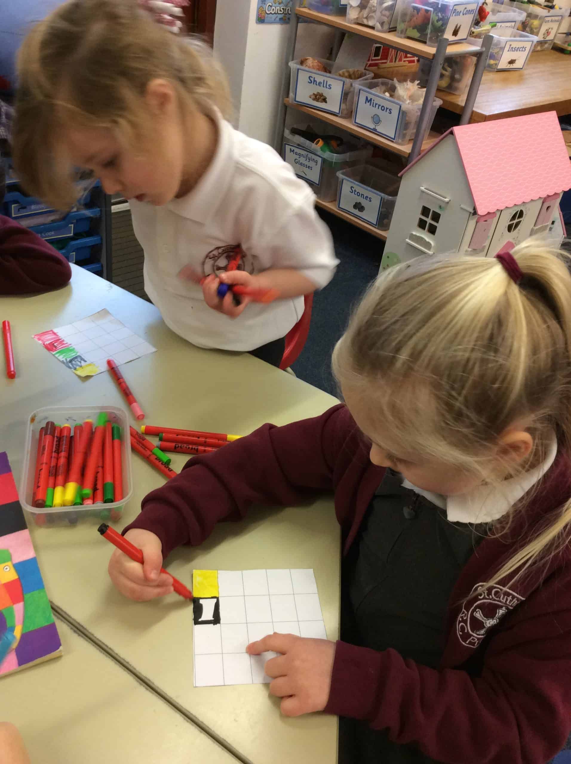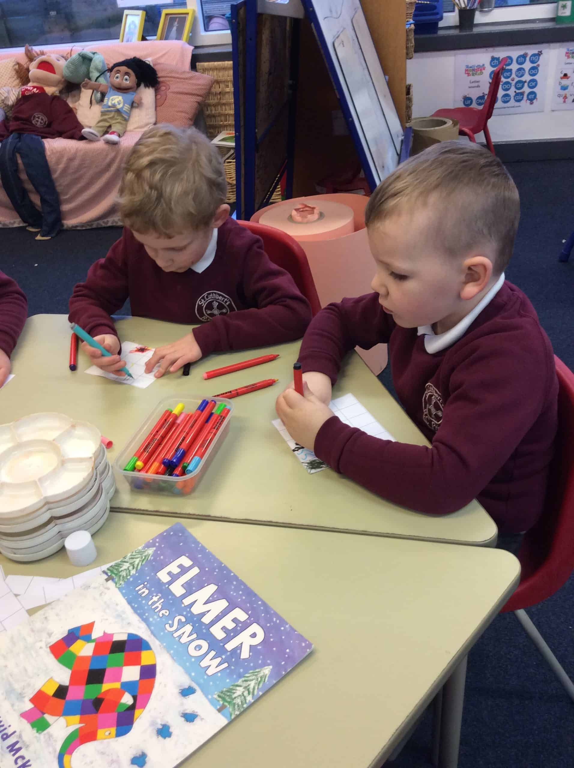In our first session the children really enjoyed listening to an Elmer story. Their challenge was to then make their own Elmer by making up their own pattern and some careful cutting.