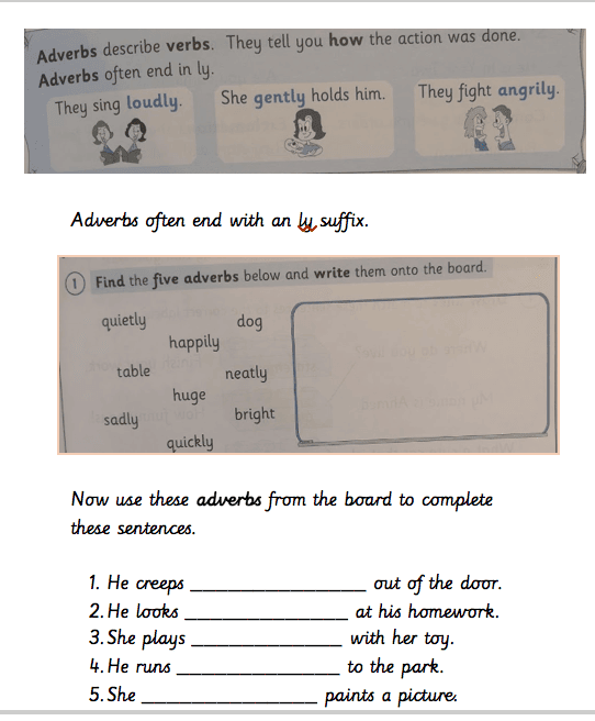 Last week we reminded ourselves of nouns, adjectives and verbs. Today we will be thinking about adverbs. Adverbs desc ibe the verb and often end in ly.