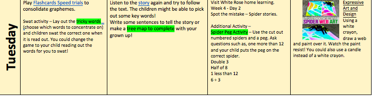 More spider work today. We are going to try and write some sentences about spiders. Using the sheet spiders can, are, have, the children need to add key words underneath. I’ve included one as an example. The children have used this idea when they did their work on polar bears. They might decide to write 8 legs in the column have and scary in the column are. They can then use their sheet to write the sentence. Spiders are scary and have 8 legs. This will be a task for them tomorrow. I can’t wait to see if you can make a magic spider web. Have fun and enjoy the sunshine. Don’t forget to keep active.