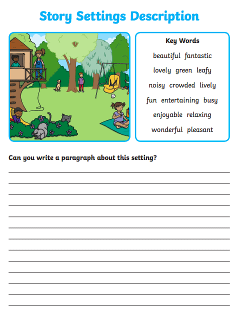 For our English today I would like you to describe the setting in the picture on the work sheet. When you are writing think about your senses. What can people see in the picture? What does the grass smell like? What are the people having a picnic eating? Remember from our sentence work yesterday that all of your sentences need to begin with a capital letter, have finger spaces and full stops. Use some of the adjectives in the word bank to help you write really descriptive sentences.