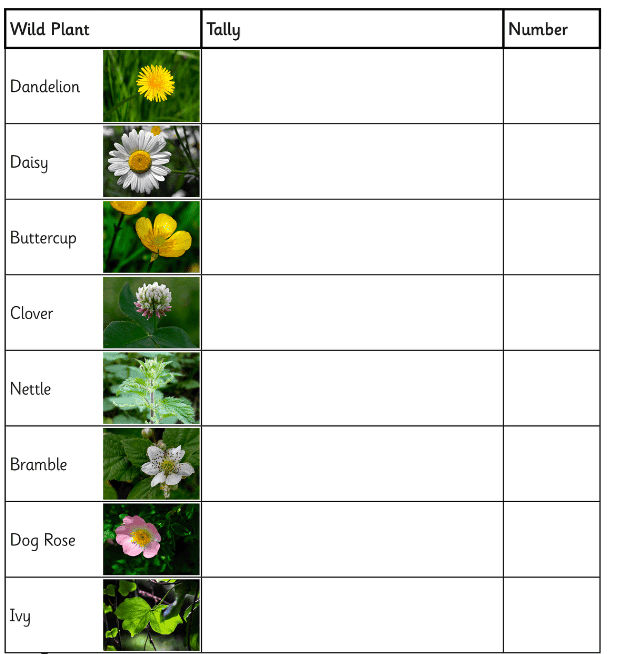 For our science to day I would like you to have a look in your garden or go for a walk/cycle/scoot and try and identify some wild plants. In the table below use a tally to count how many of each wild plant you can find. Did you come across any wild plants you didn’t see on our table?