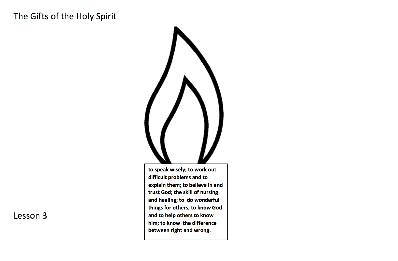 Lesson 3 – Look at the gifts of the Holy Spirit. How can people use their gifts to serve others? Create a simple poster drawing pictures or cutting images from magazines of people showing these gifts to others in their everyday lives (see attached template)