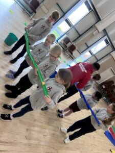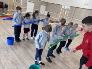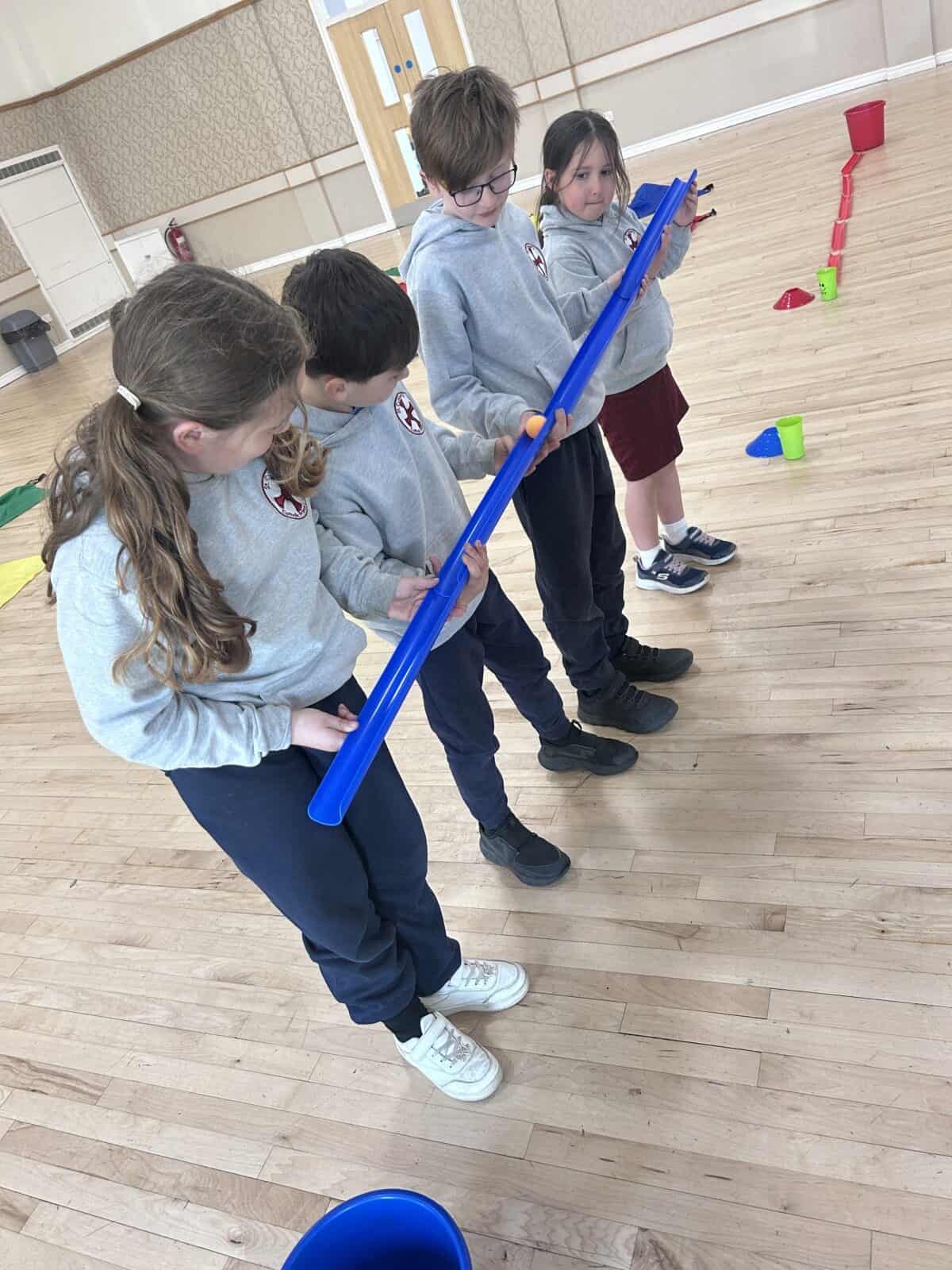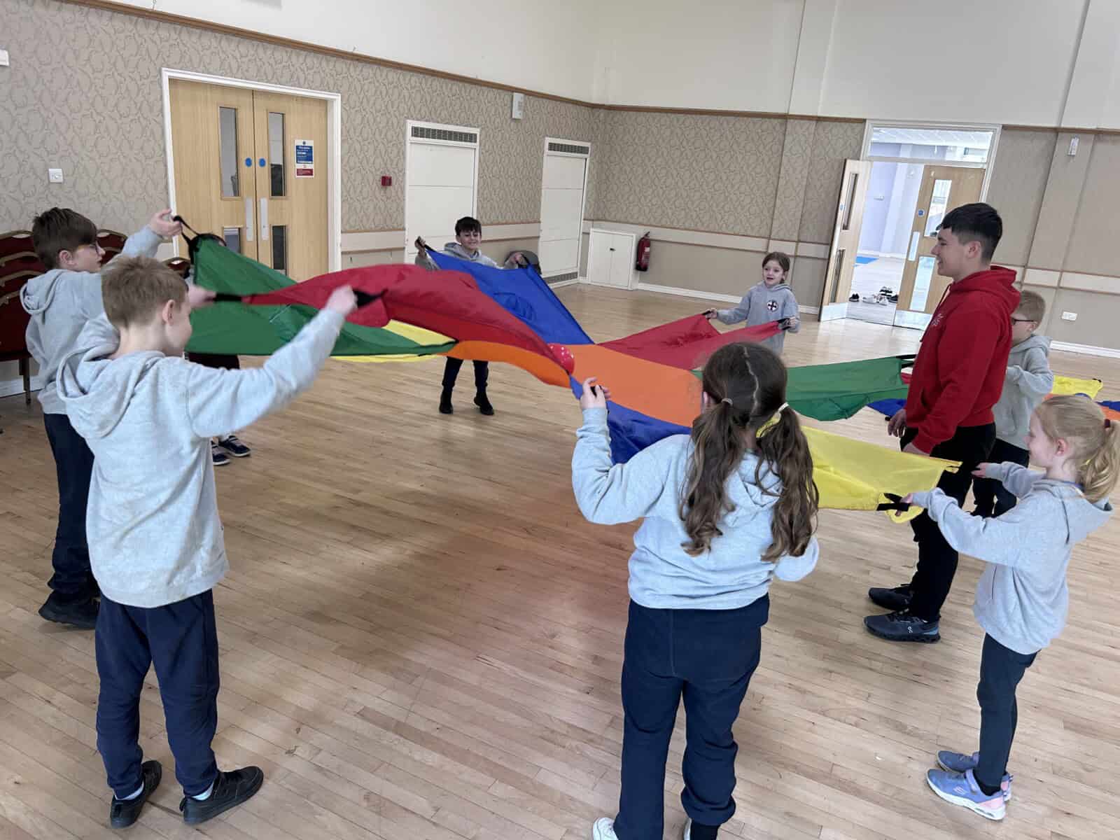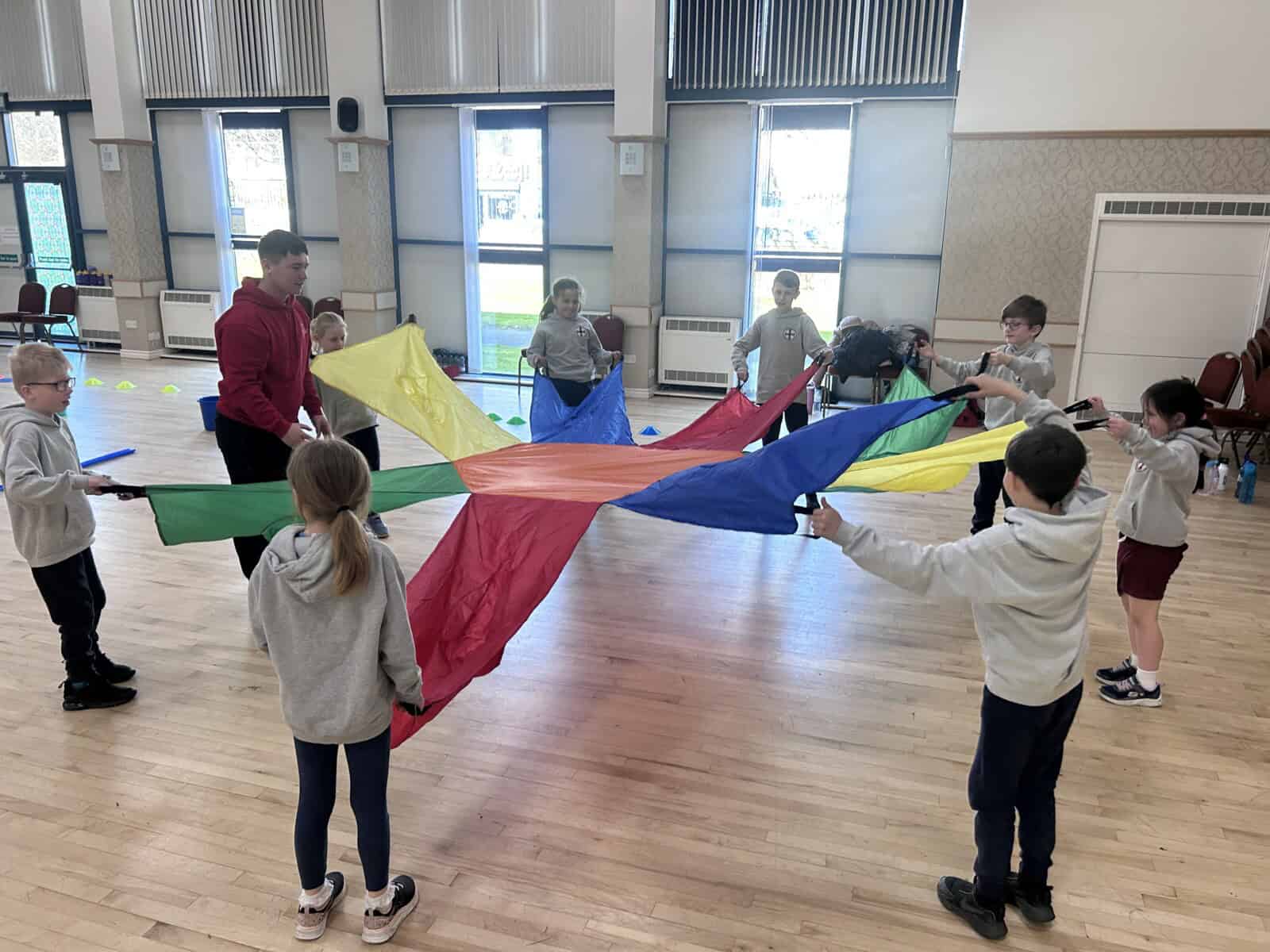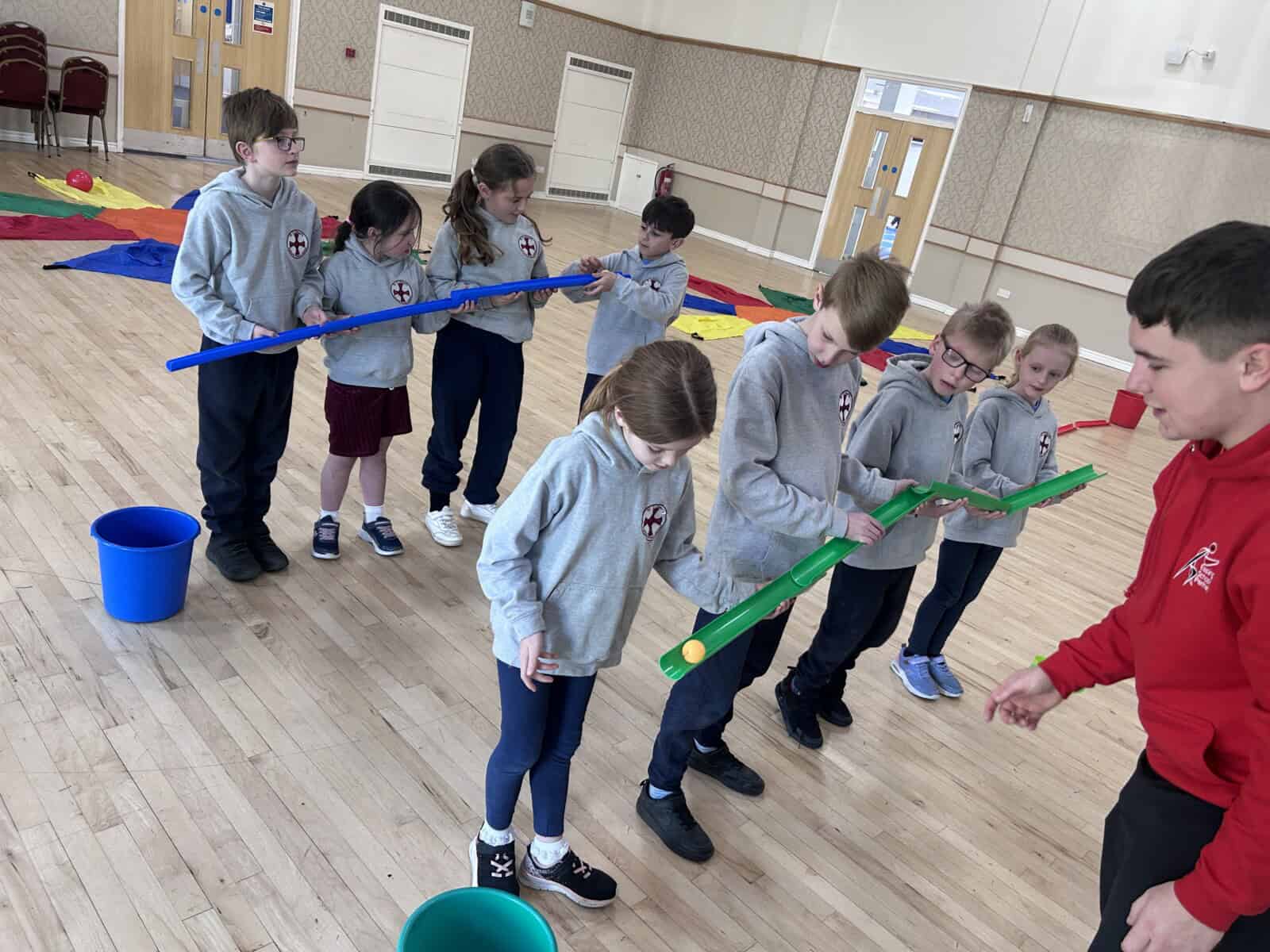 First, the children started with team building exercises. They worked together to get the ball in certain colours on the parachute followed by the ‘drainpipe challenge’ where they quickly needed to moved to get the ball rolling and into the bucket.