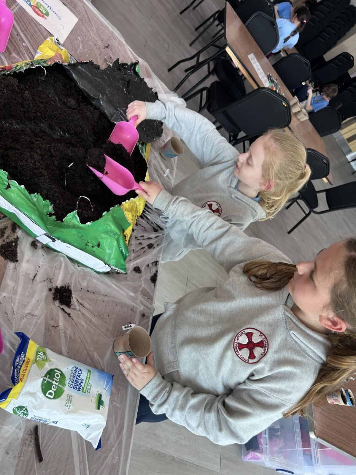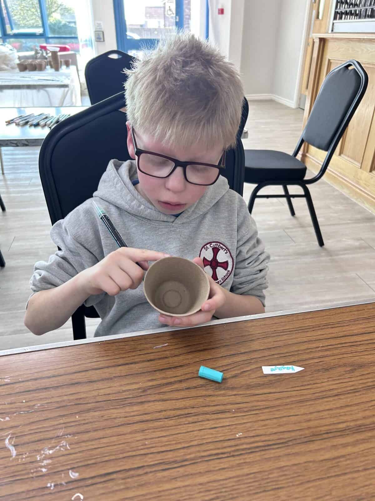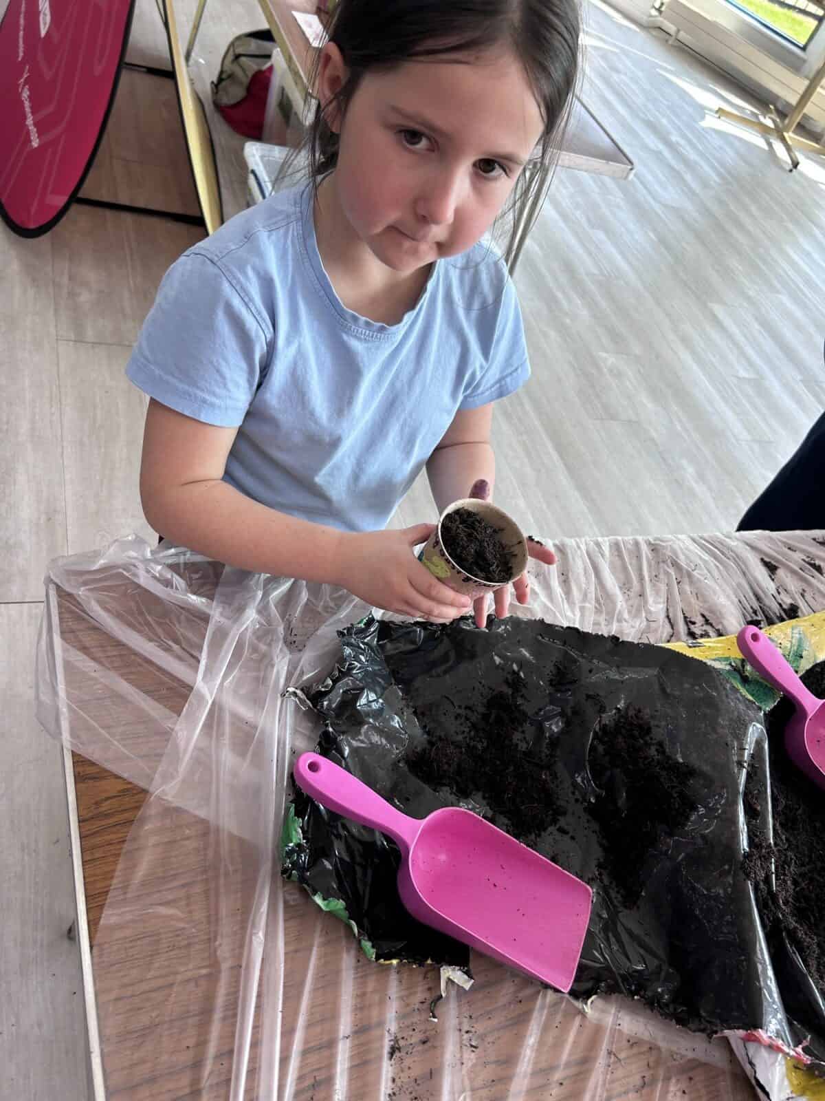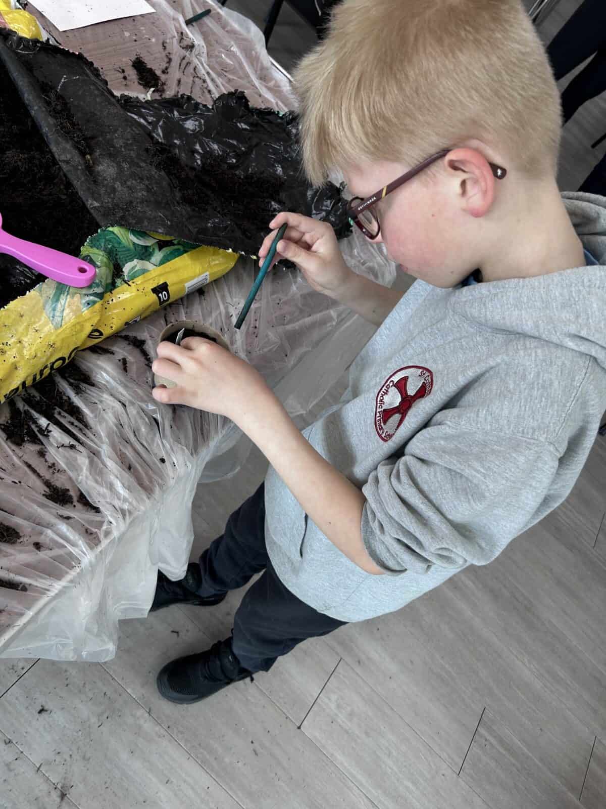 The children moved around to their third station where they needed to decision their own plant pot before planting a sunflower to take home.