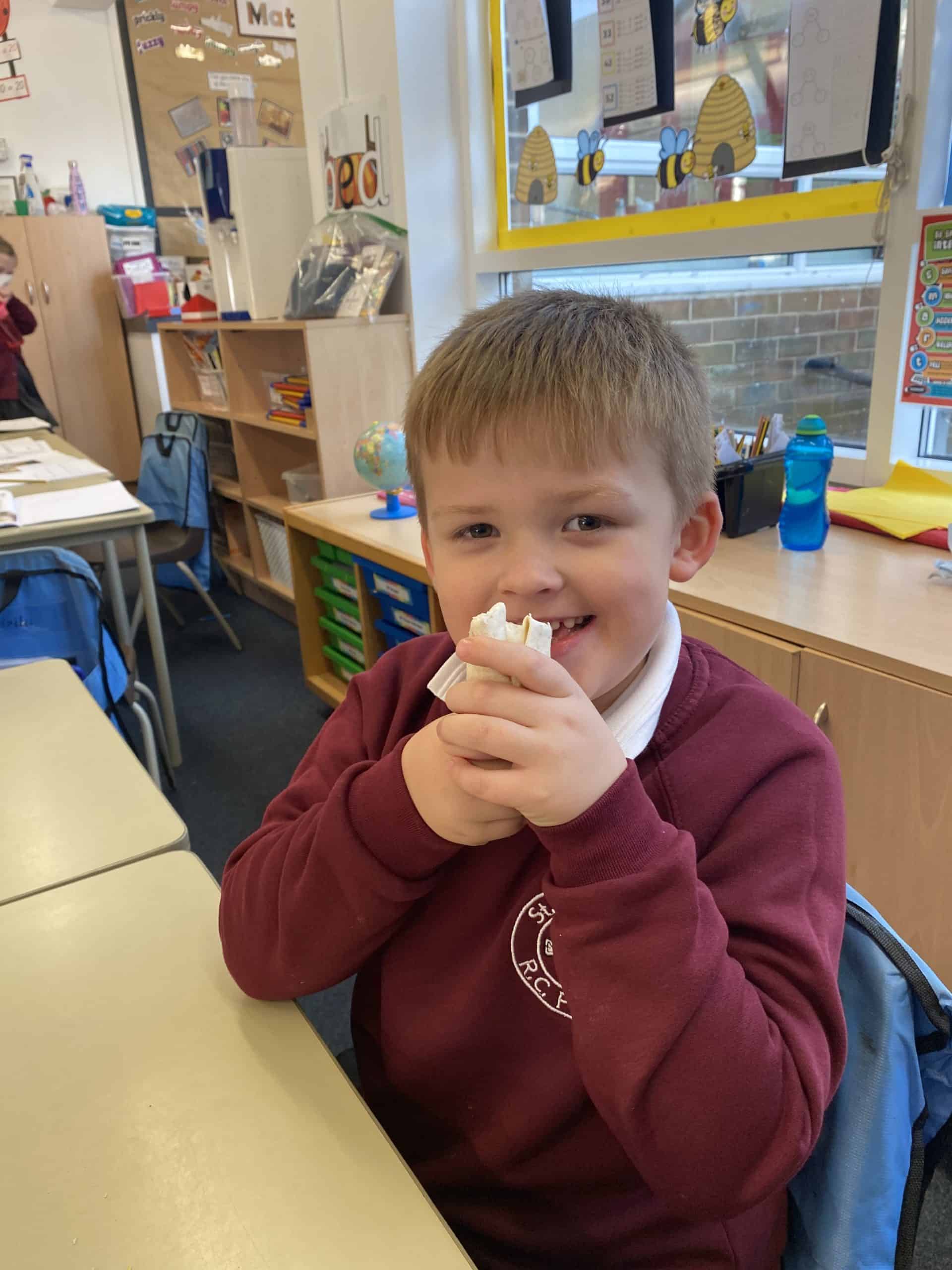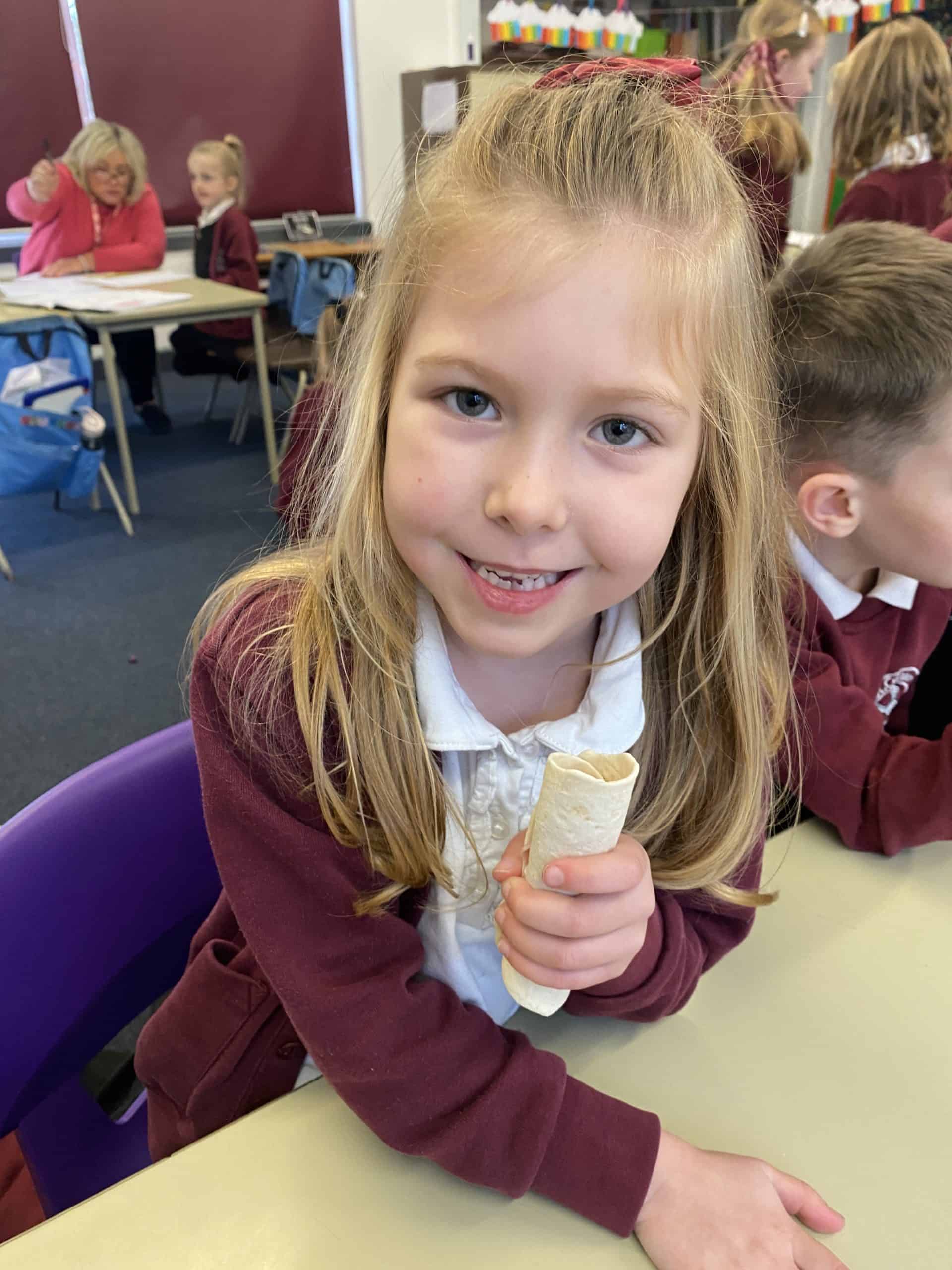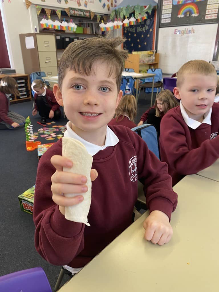 Y2 have also enjoyed some food technology. They were looking at the hidden sugars in different drinks and learned all about the different food groups and what we need for a healthy balanced diet. After trying some different combinations of ingredients, they decided which was their favourite and added those things to a wrap. Using cutting, folding and rolling skills, the children managed to create, eat and evaluate their wrap.