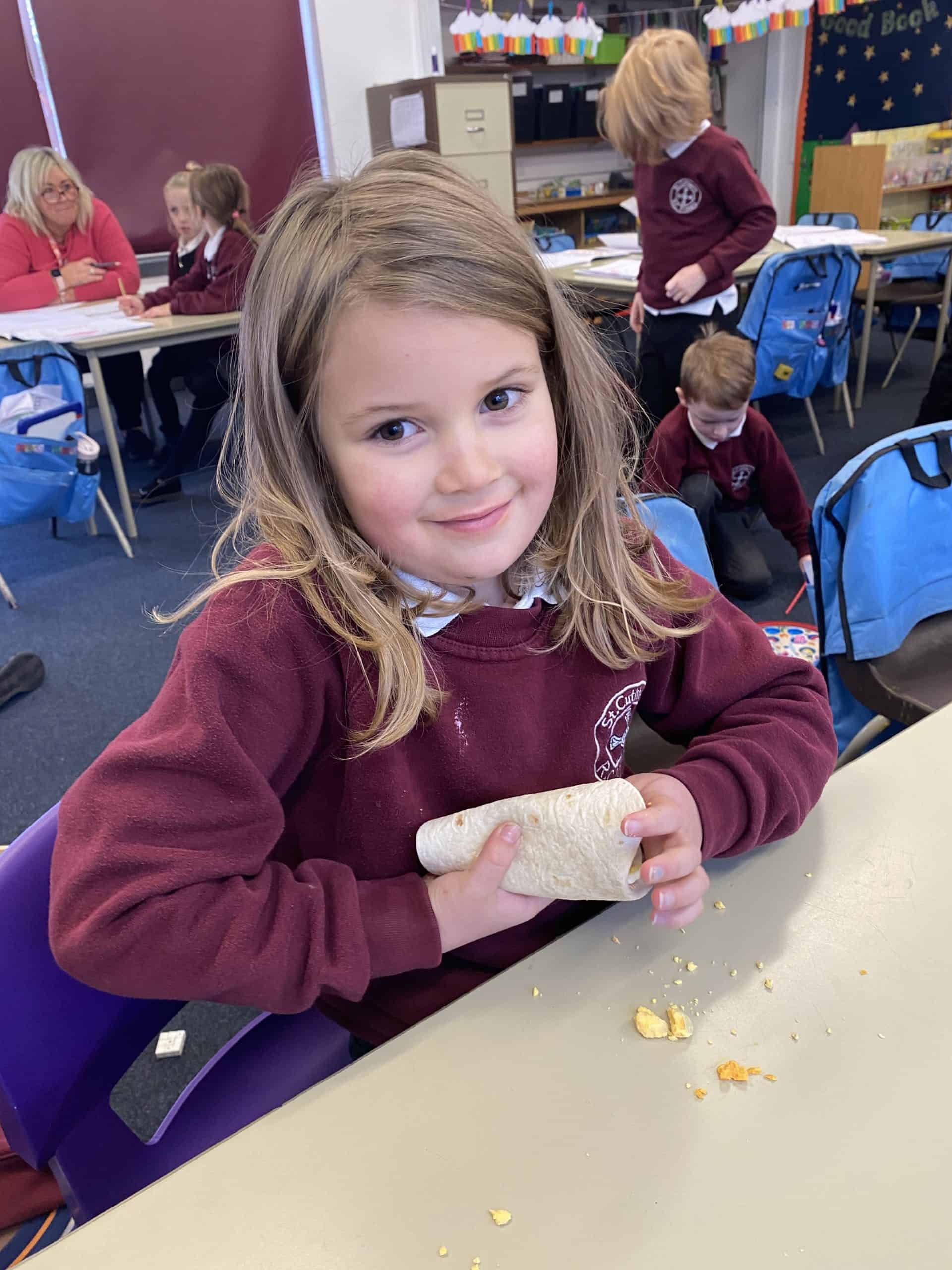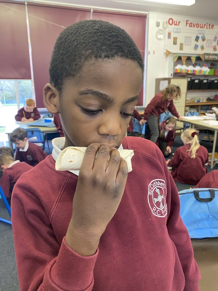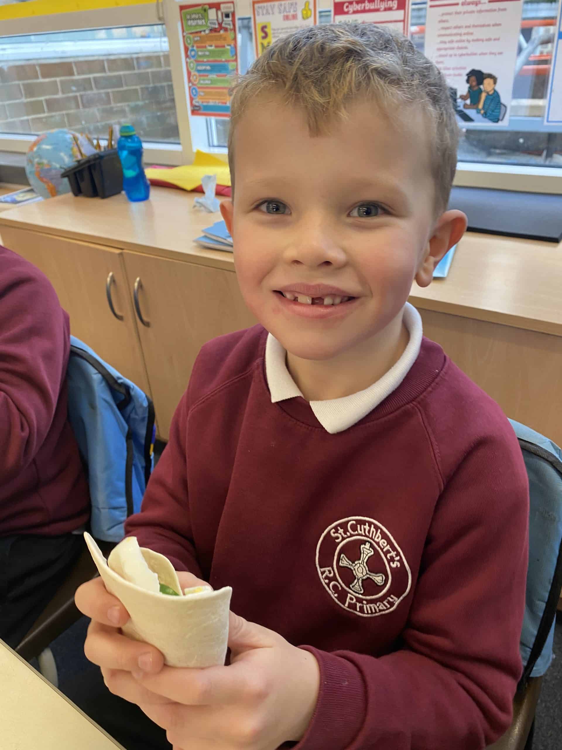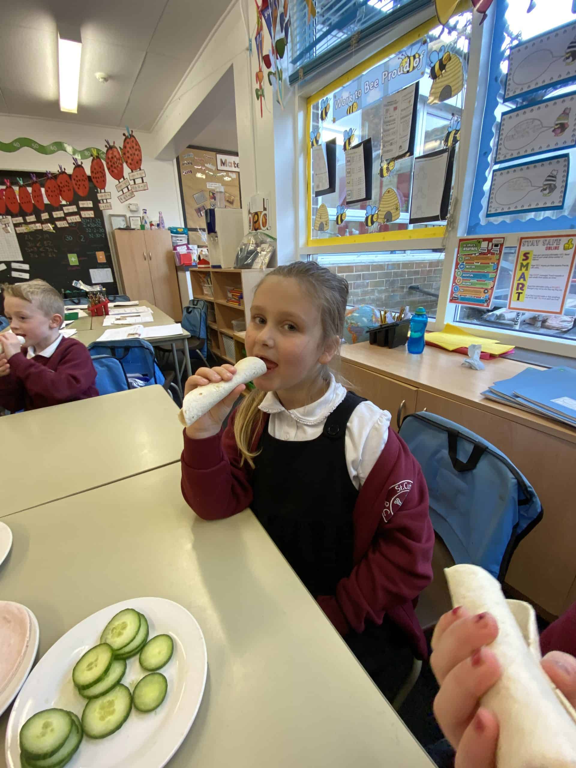 Y2 have also enjoyed some food technology. They were looking at the hidden sugars in different drinks and learned all about the different food groups and what we need for a healthy balanced diet. After trying some different combinations of ingredients, they decided which was their favourite and added those things to a wrap. Using cutting, folding and rolling skills, the children managed to create, eat and evaluate their wrap.
