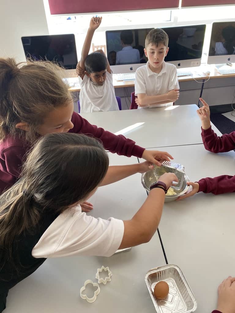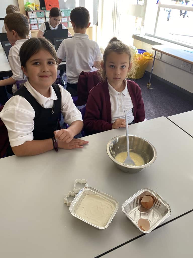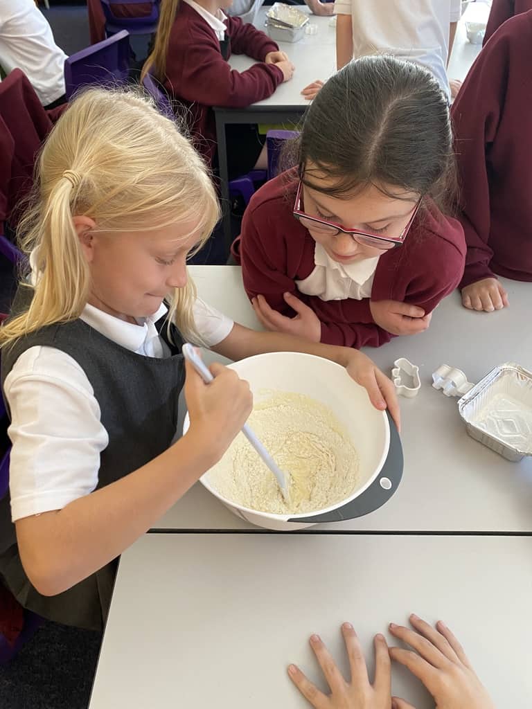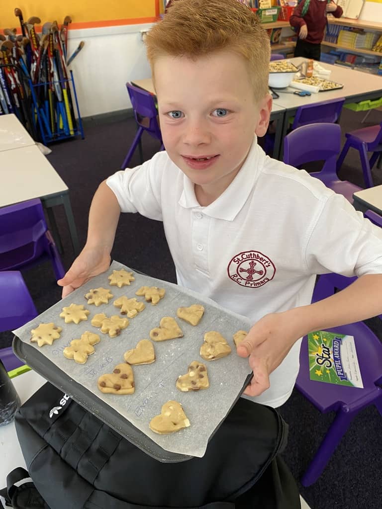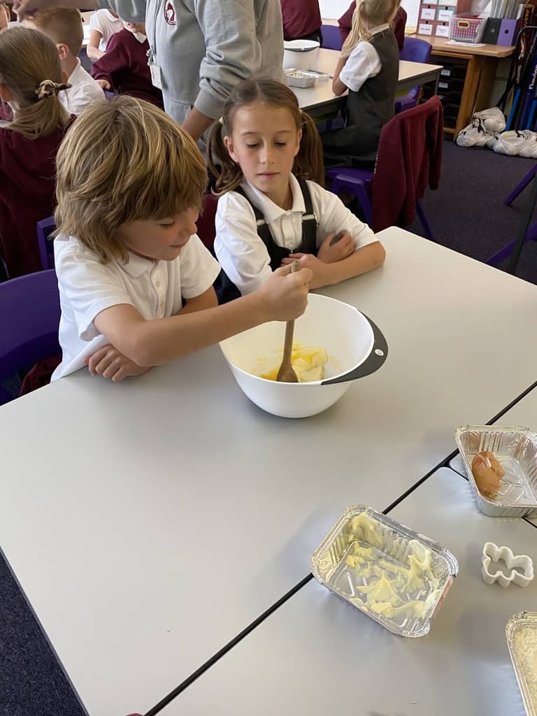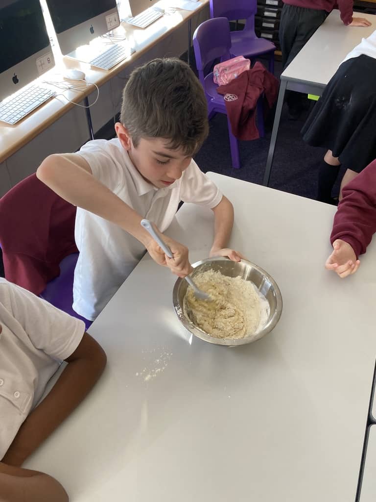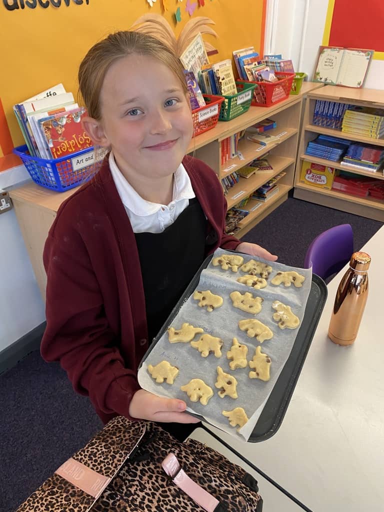 Our Y4 children have been baking biscuits again this afternoon. They were able to weigh out ingredients, prepare and roll out the dough and then cut and shape their biscuits. They added some delicious chocolate chips to the mixture too. The biscuits smelled beautiful while they were baking and will be cooled and wrapped for the children to collect in the morning.