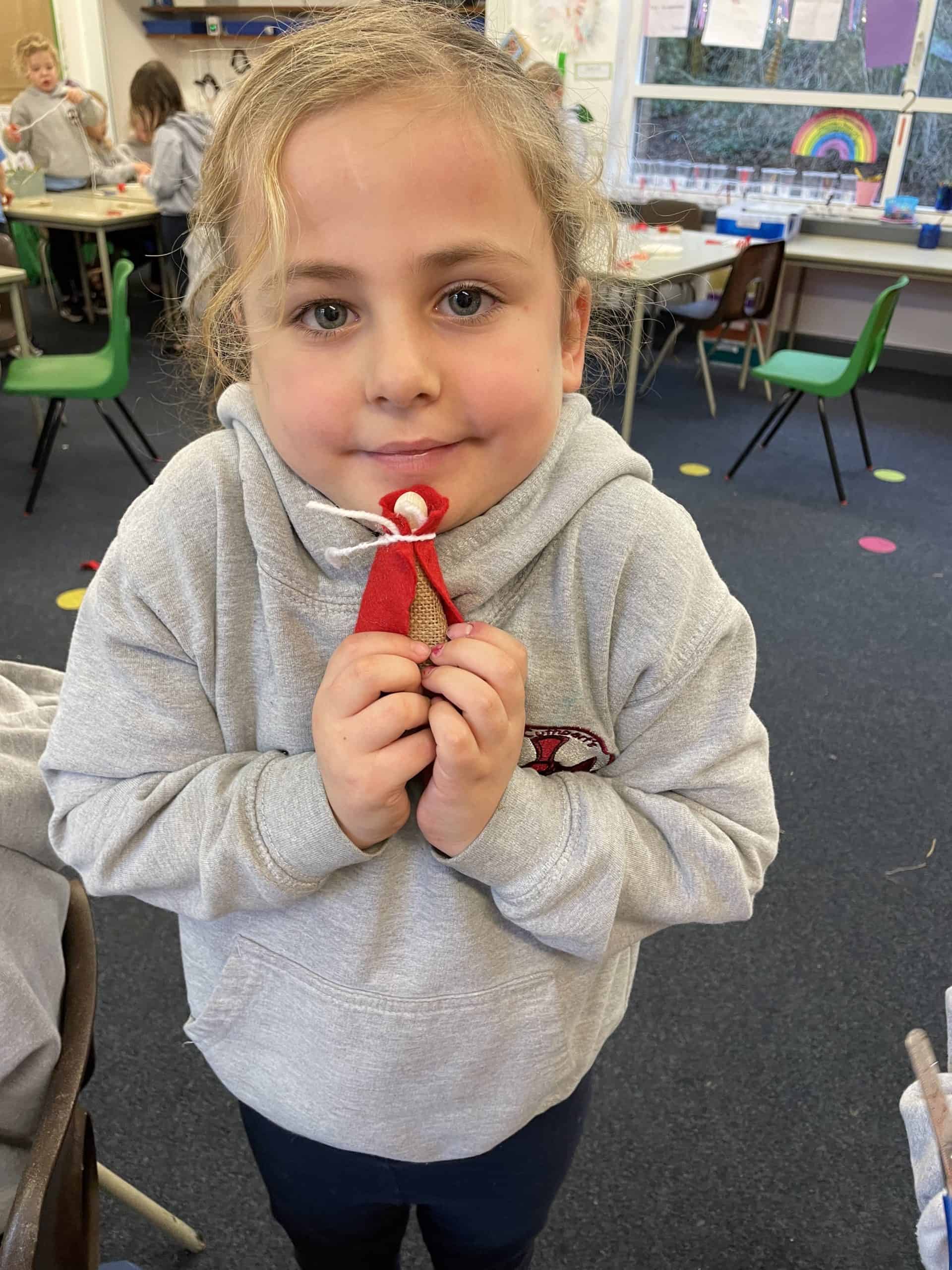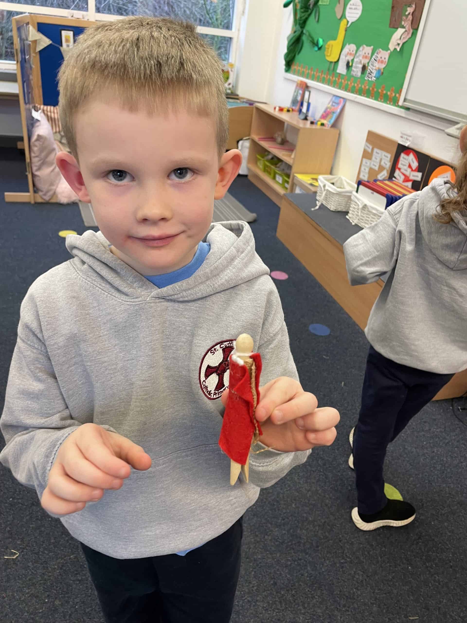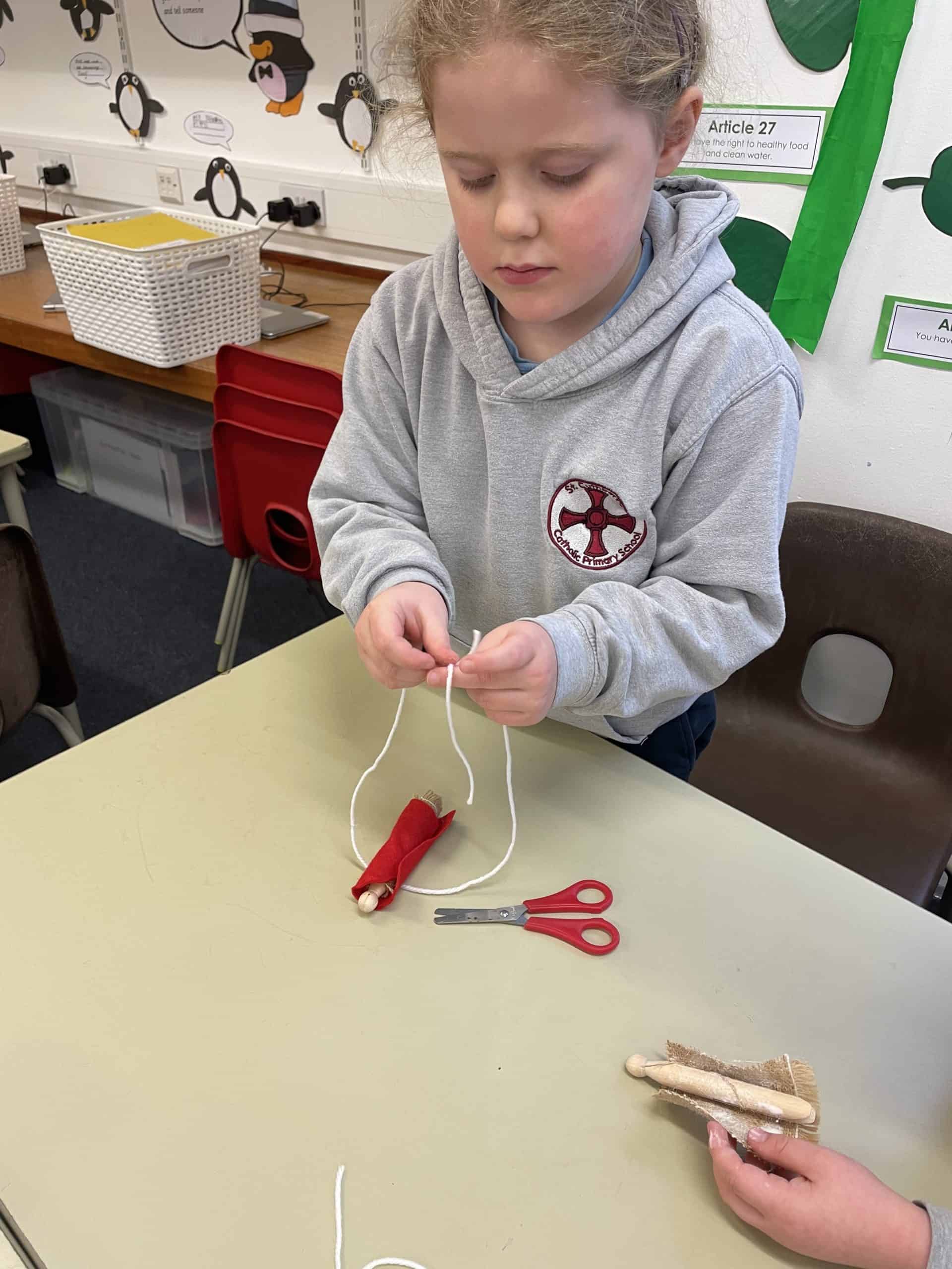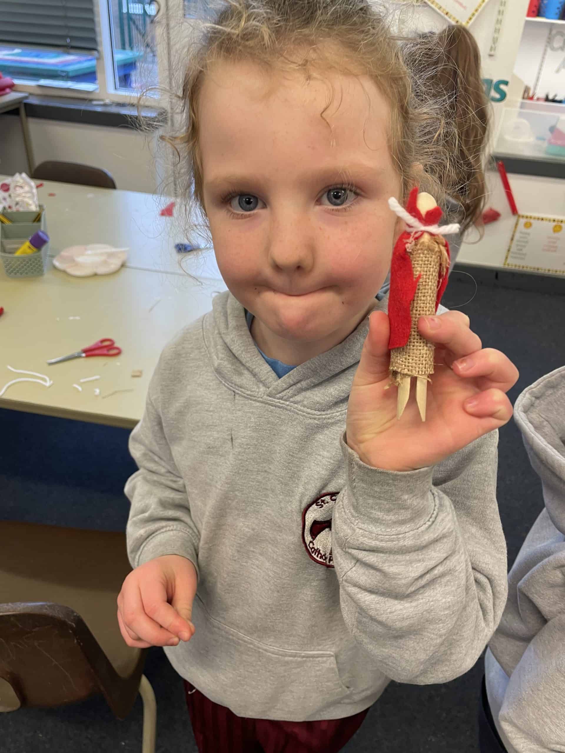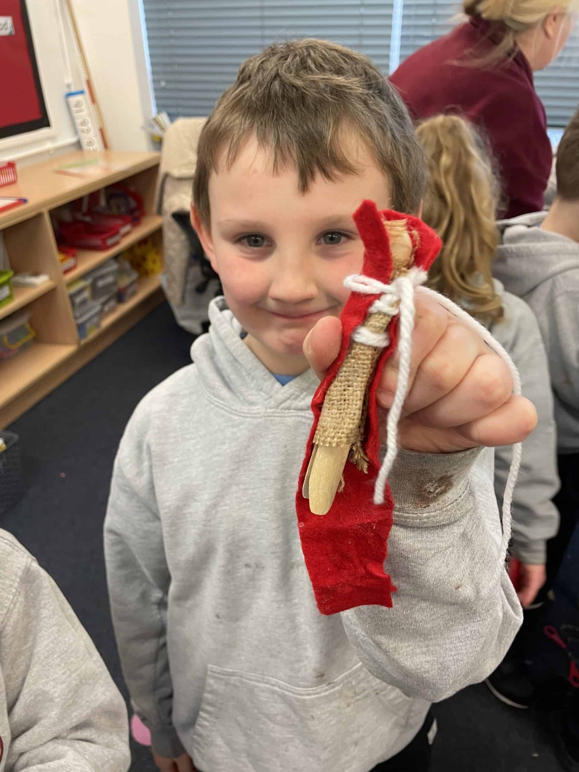 During Art, we made peg dolls to add to our forest setting. We explored fabrics such as satin, cotton, hessian and fur and then we chose the most appropriate fabric for our Little Red Riding Hood peg doll.