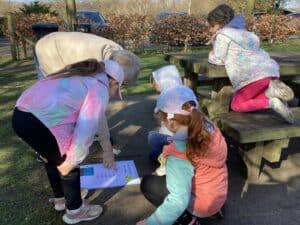 After lunch, our activity was Map It Out. Rachael read a story about how maps can help us to locate places in our country and around the world. We used a compass to find out where North was and played the North, South, East or West game. Next we used a key to find different objects so we could make funny faces. Finally we made our own maps and keys using a range of natural materials.