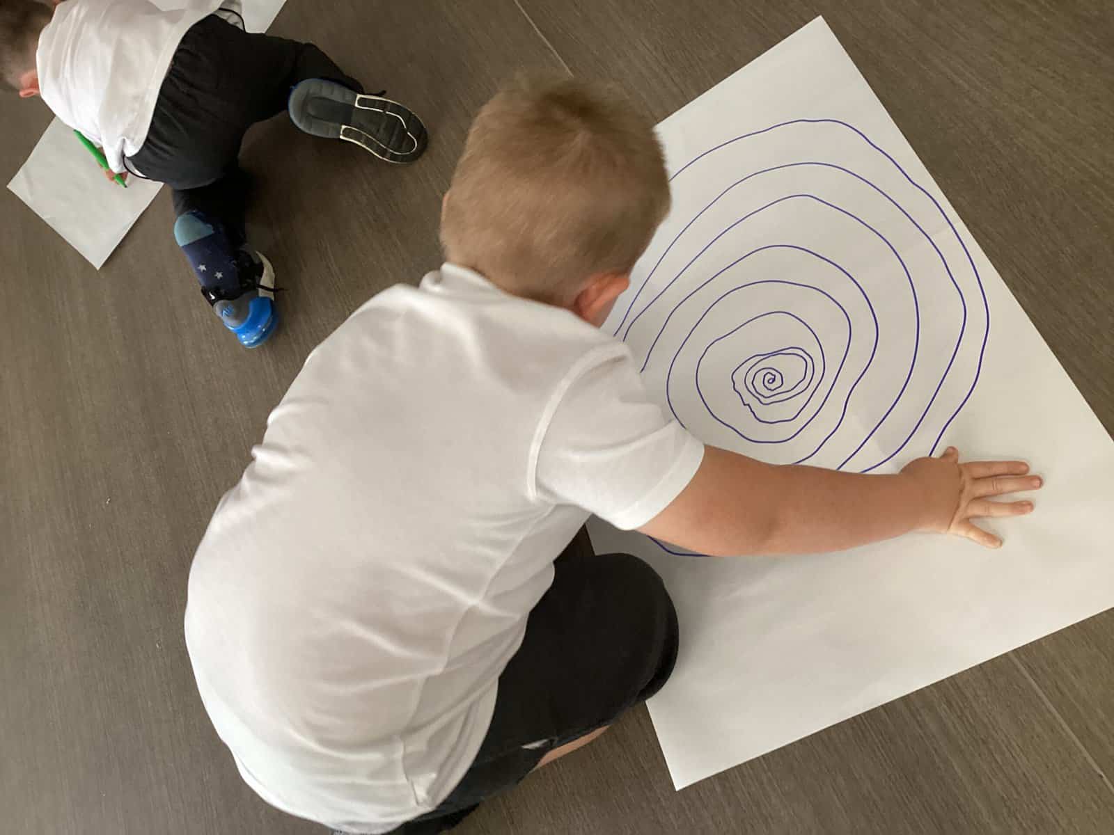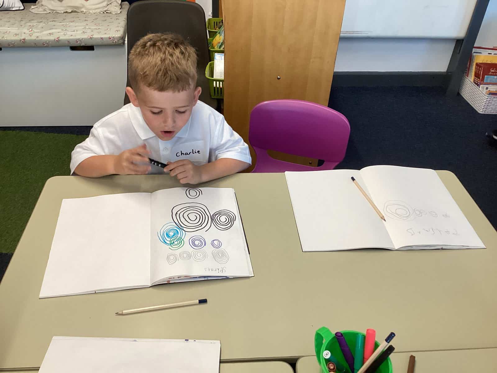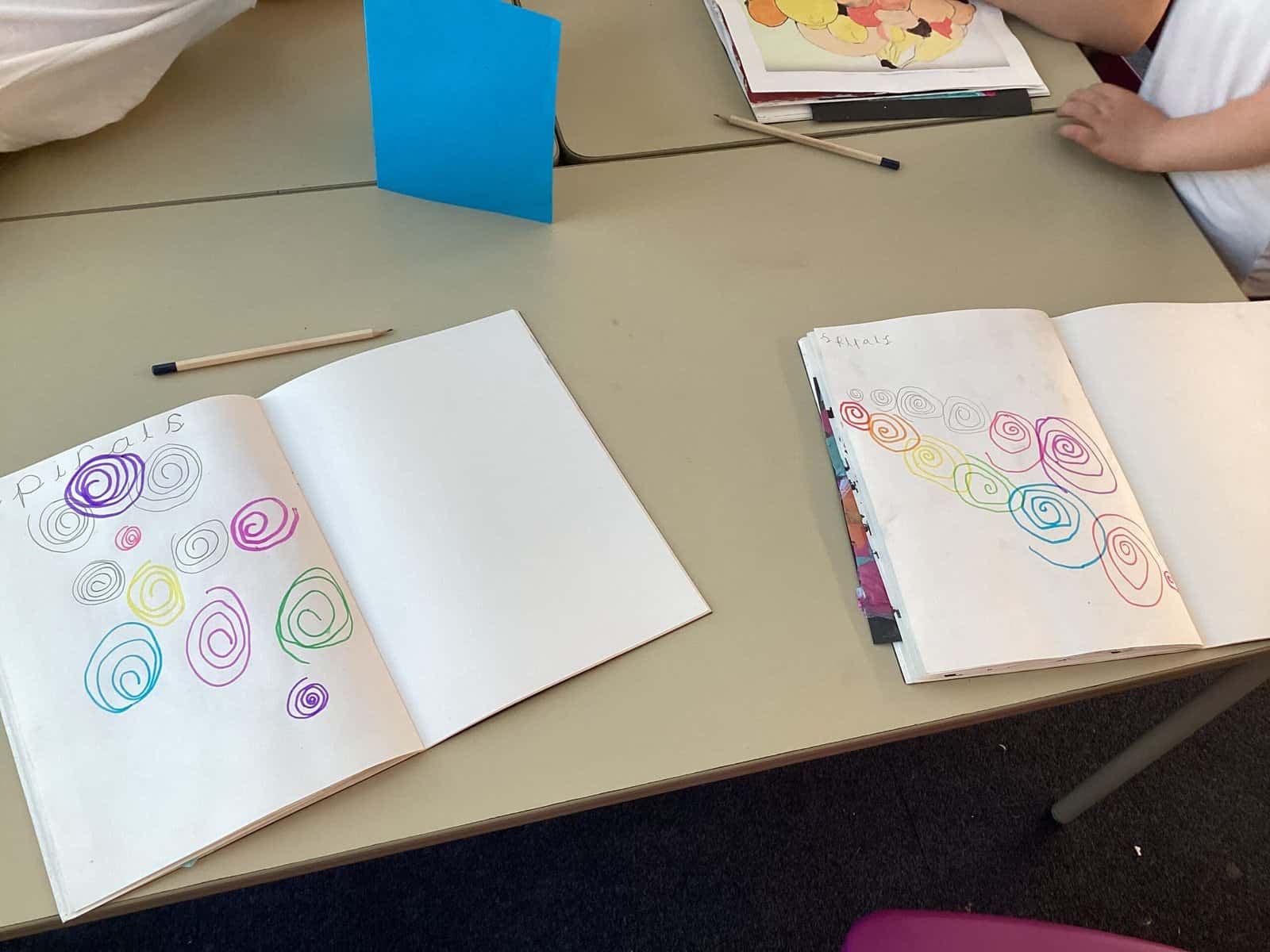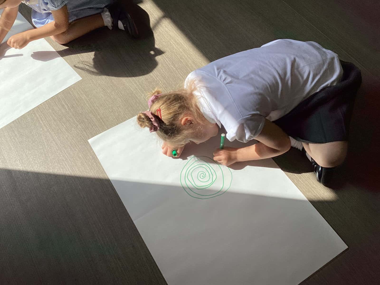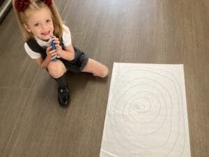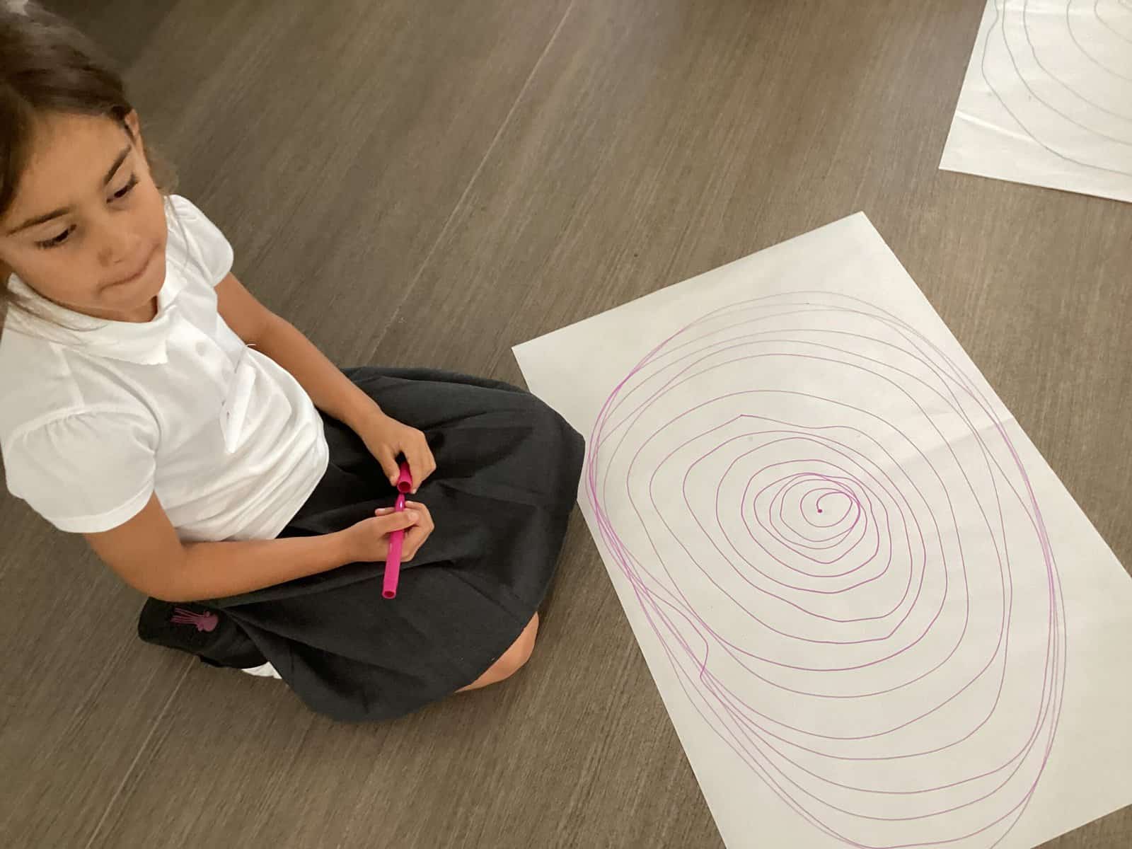 Today in Year 2 we started thinking about drawing. We practised drawing with our hands in sketchbooks, with our arms and moving our whole bodies! We looked at art by Molly Hausland who draws huge circles outdoors. We loved drawing spirals on our yard!