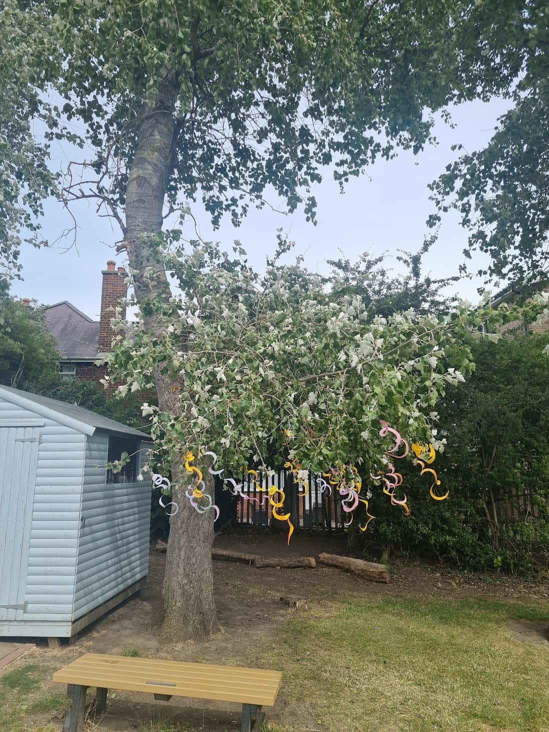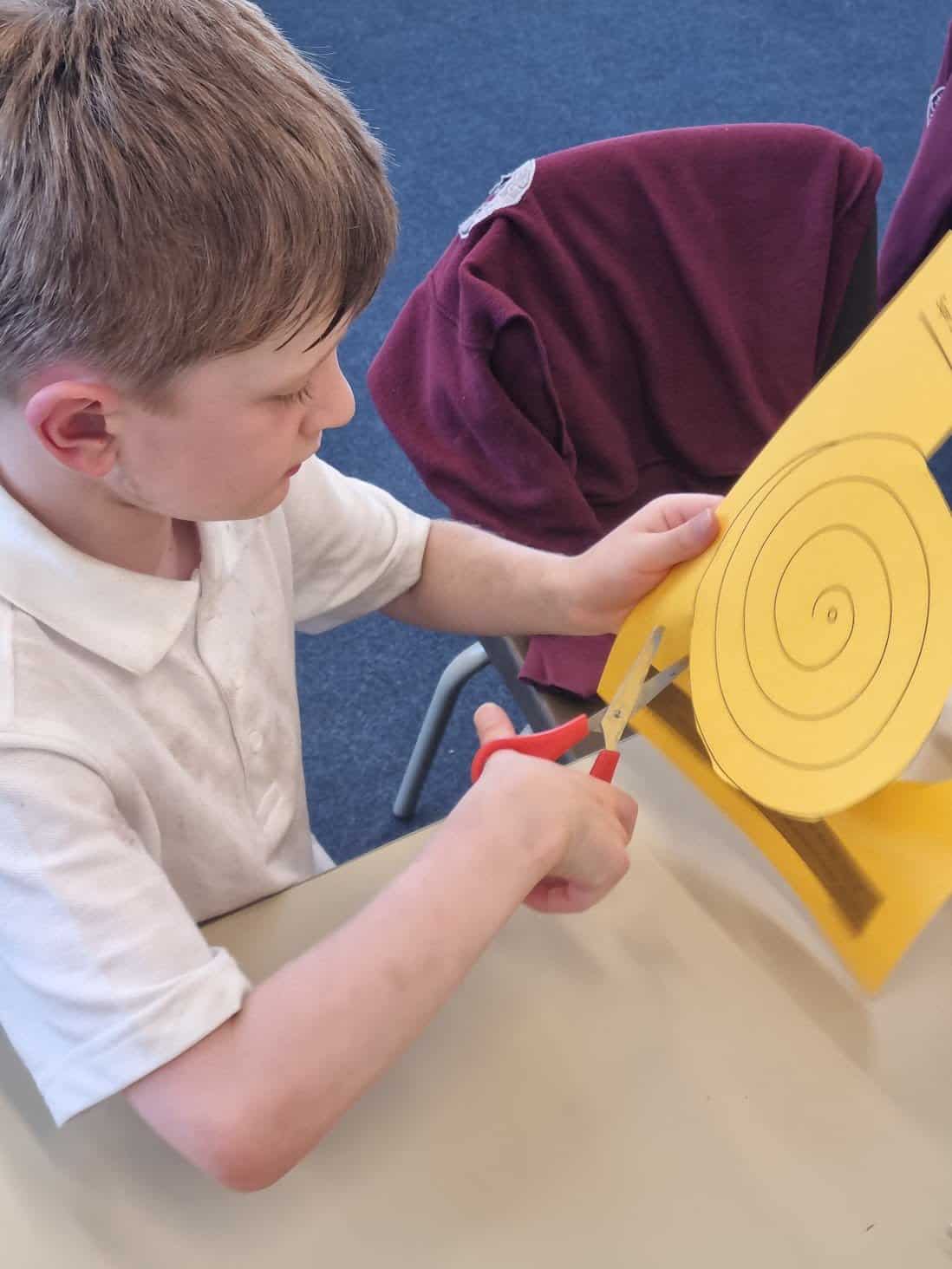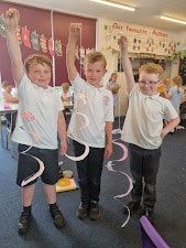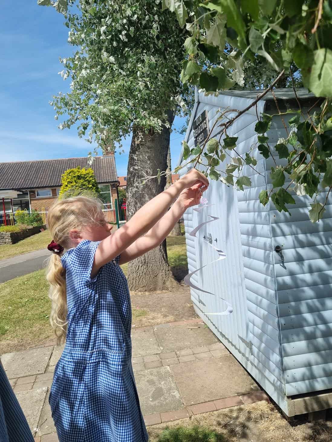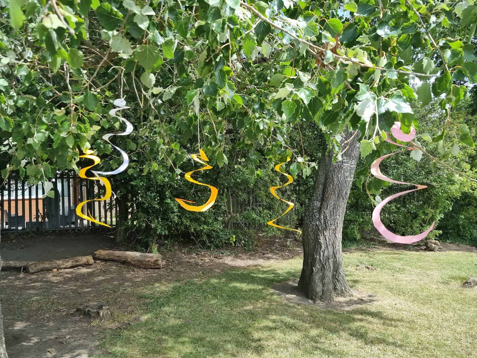 We have been looking at different sculptors. Today, we looked at a sculptor called Alexander Calder. He used bright colours and simple shapes in his sculptures. Many of his sculptures are kinetic, meaning that they move. Today, we created hanging kinetic sculptures which are moved by the wind. We hung these in a tree near to our reading shed.