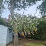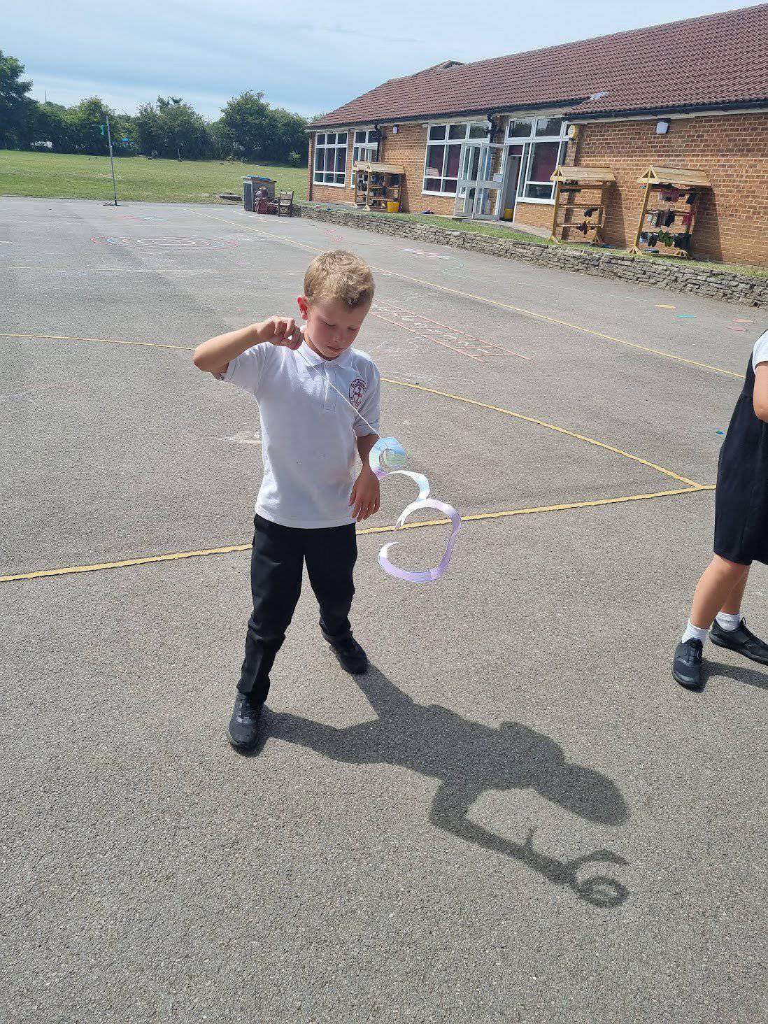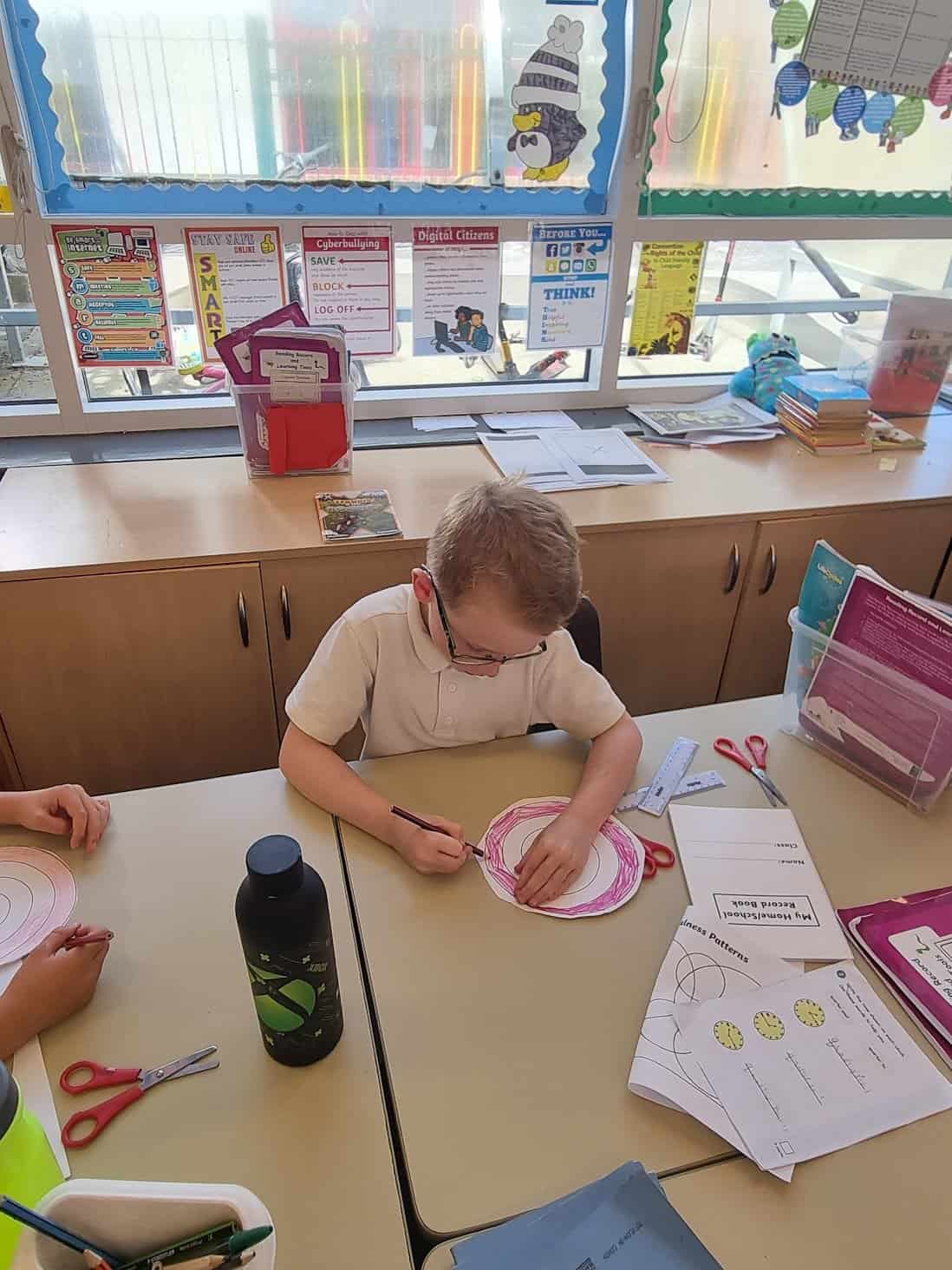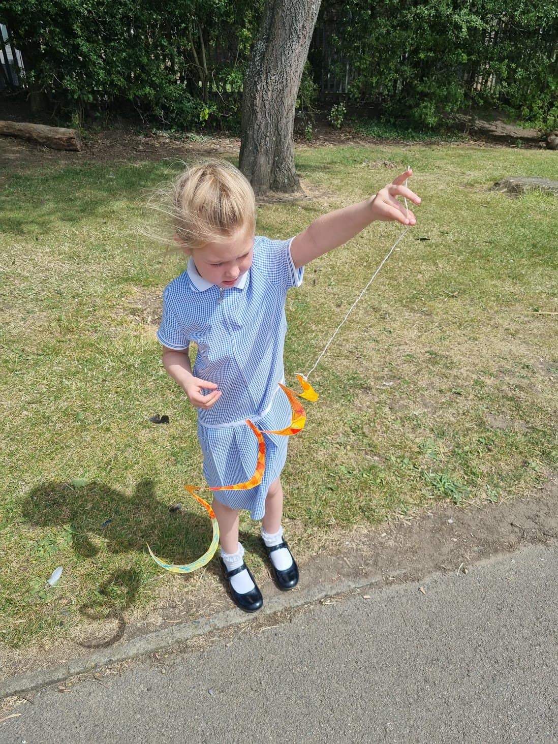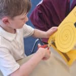 We have been looking at different sculptors. Today, we looked at a sculptor called Alexander Calder. He used bright colours and simple shapes in his sculptures. Many of his sculptures are kinetic, meaning that they move. Today, we created hanging kinetic sculptures which are moved by the wind. We hung these in a tree near to our reading shed.
